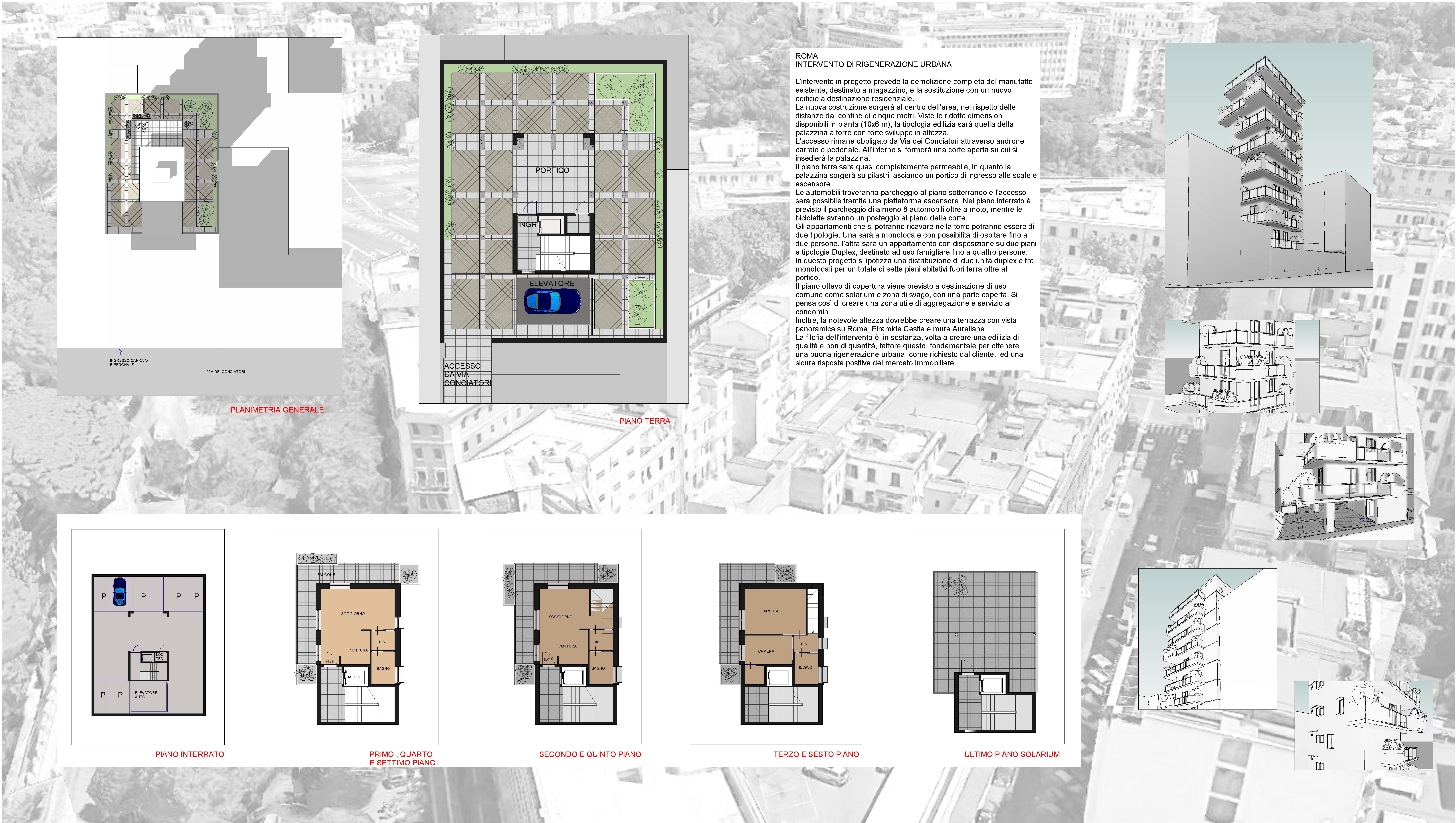 L'idea di questo contest è di individuare un nuovo plani-volumetrico mediante la trasformazione di questo edificio attraverso una sua eventuale parziale demolizione e ricostruzione, modificando e/o trasferendo le superfici attualmente presenti all'interno della sagoma esistente, al fine di realizzare delle unità immobiliari di tagli non superiori ai 65/80 mq SUL, cercando di mantenere la stessa area di sedime per non perdere le attuali adiacenze con i confinanti.