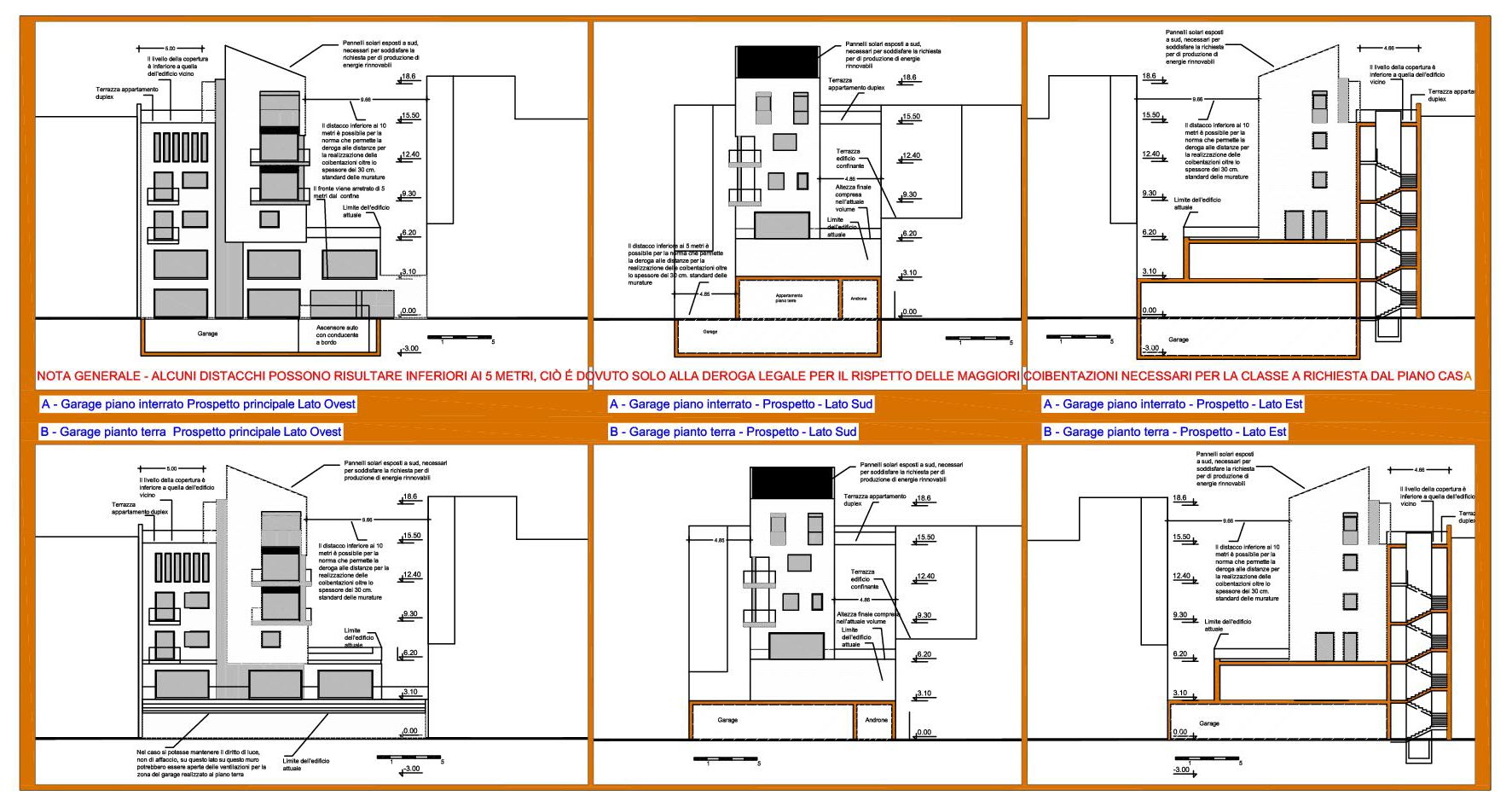 DovrĂ essere indicato il numero di piani, le altezze dei singoli piani e l'altezza totale dell'eventuale nuovo fabbricato in relazione al contesto degli edifici circostanti, tenendo presente i distacchi dai confini, non inferiori a 5 m per lato.