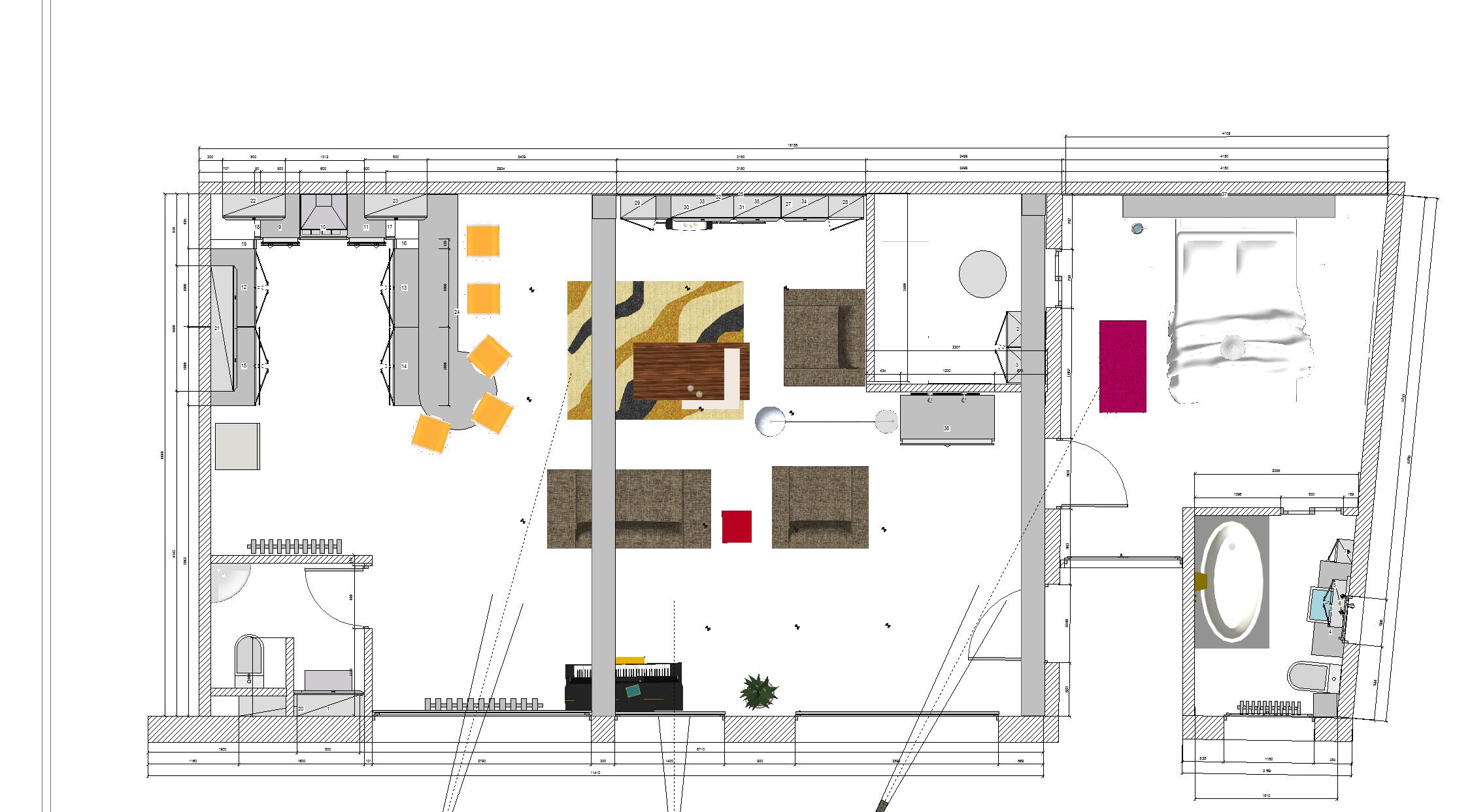 facendo le due pareti della camera fino ad arrivare a metà soggiorno