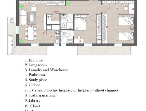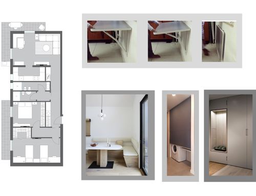 The strong point of my three-room apartment is the view that can be enjoyed from the balconies and particularly from the L-shaped balcony that surrounds the two French doors. On this balcony, albeit narrow, on the right side that overlooks the park, I would like to create a folding table along the balcony that can serve as a dining area. I could consider the hypothesis of creating a sink to be inserted in the part exposed to the left. I'm reflecting on the possibility of closing with sliding windows that allow you to protect yourself without obscuring the view. The roofs of the apartment are 3.50m high, it would be useful to make the most of the space in height. I would like a large full-wall bookcase (mezzanine bookcase?). In this living room-living room I consider the idea of moving the access door from the corridor to the left in order to obtain a niche along the corridor (which at the moment all the internal doors overlook) to create a wardrobe and organizational spaces to be exploited even in height. I have a white wardrobe with 4 shutter doors by Mazzei that I would like to include in this space. The house must accommodate 3 people, one of the current 2 bedrooms is very large and could be furnished by creating 2 separate areas, equipped with a study area for my university children. Also in this environment the space in height could be exploited. I have to create a storage and pantry area. At the moment the laundry area is in the only bathroom, the bathroom door also opens onto the entrance hall and I don't like it very much. I would like to create another bathroom, even a small one.