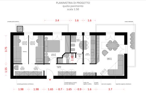 Hola a todos, tengo un apartamento de 99 metros cuadrados con vistas al parque arqueológico de Marsala con vistas a las islas Egadi. El punto fuerte de mi apartamento de tres habitaciones es la vista que se puede disfrutar desde los balcones y particularmente desde el balcón en forma de L que rodea las dos ventanas francesas. En este balcón, aunque estrecho, del lado derecho que da al parque me gustaría crear una mesa plegable a lo largo del balcón que pueda servir como área de comedor, podría considerar la hipótesis de crear un fregadero para insertarlo en la parte expuesta. A la izquierda. Estoy reflexionando sobre la posibilidad de cerrar con ventanas correderas que te permitan protegerte sin oscurecer la vista. Los techos del departamento son de 3.50 m de altura. Sería útil aprovechar al máximo el espacio en altura. Me gustaría una biblioteca grande de pared completa (¿biblioteca entrepiso?). En este salón-salón considero la idea de mover la puerta de acceso desde el pasillo hacia la izquierda con el fin de obtener un nicho a lo largo del pasillo (grande sobre el que actualmente dan todas las puertas internas) para crear un guardarropa y organización. espacios para aprovechar, tengo un armario blanco con 4 puertas de persiana de Mazzei que me gustaría incluir en este espacio. La casa debe alojar a 3 personas, uno de los 2 dormitorios actuales es muy amplio y se podría amueblar creando 2 áreas separadas, dotadas de un área de estudio para mis hijos universitarios. también en este entorno se podría aprovechar el espacio en altura. Tengo que crear un área de almacenamiento y despensa. Por el momento, el área de lavado está en el único baño, la puerta del baño también se abre al vestíbulo de entrada y no me gusta mucho. Me gustaría crear otro baño, incluso uno pequeño.