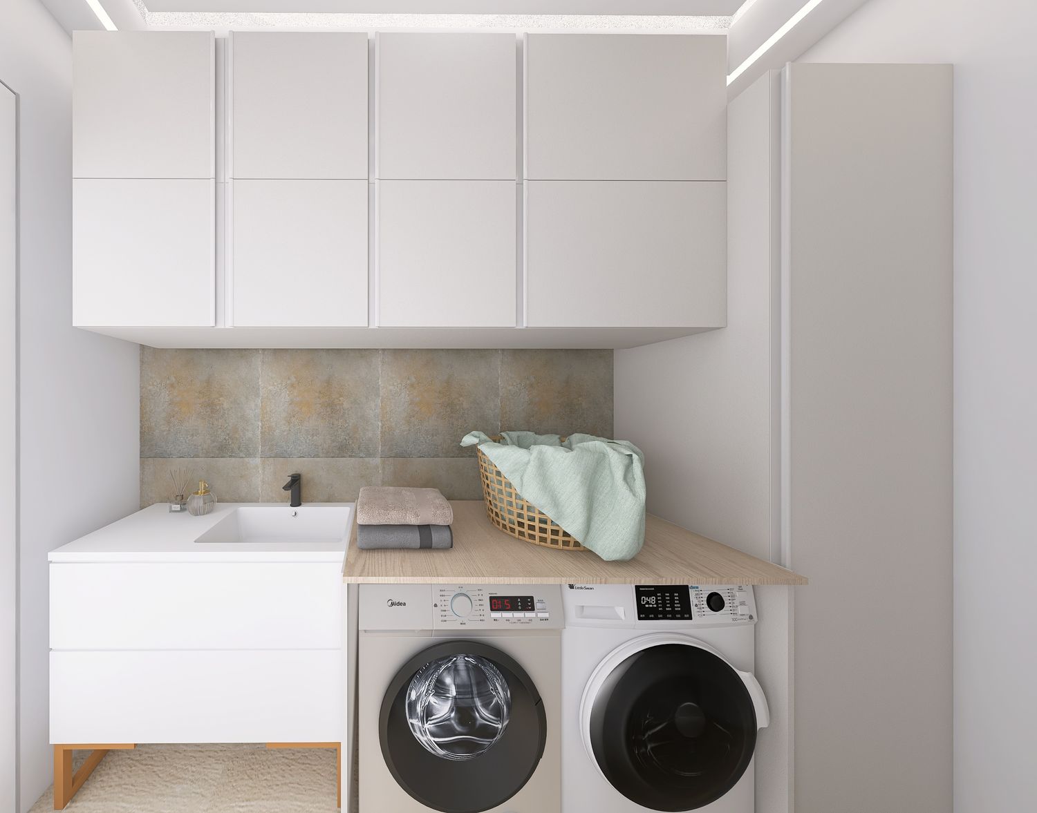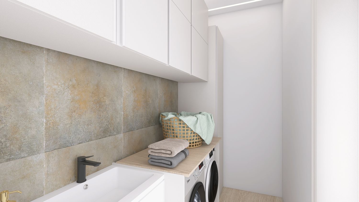 La lavanderia è stata studiata come ambiente pratico e ben organizzato, dotato di armadiature capienti e piano di lavoro. La scelta della porta a vetro consente l’ingresso della luce naturale, rendendo lo spazio più luminoso e gradevole.