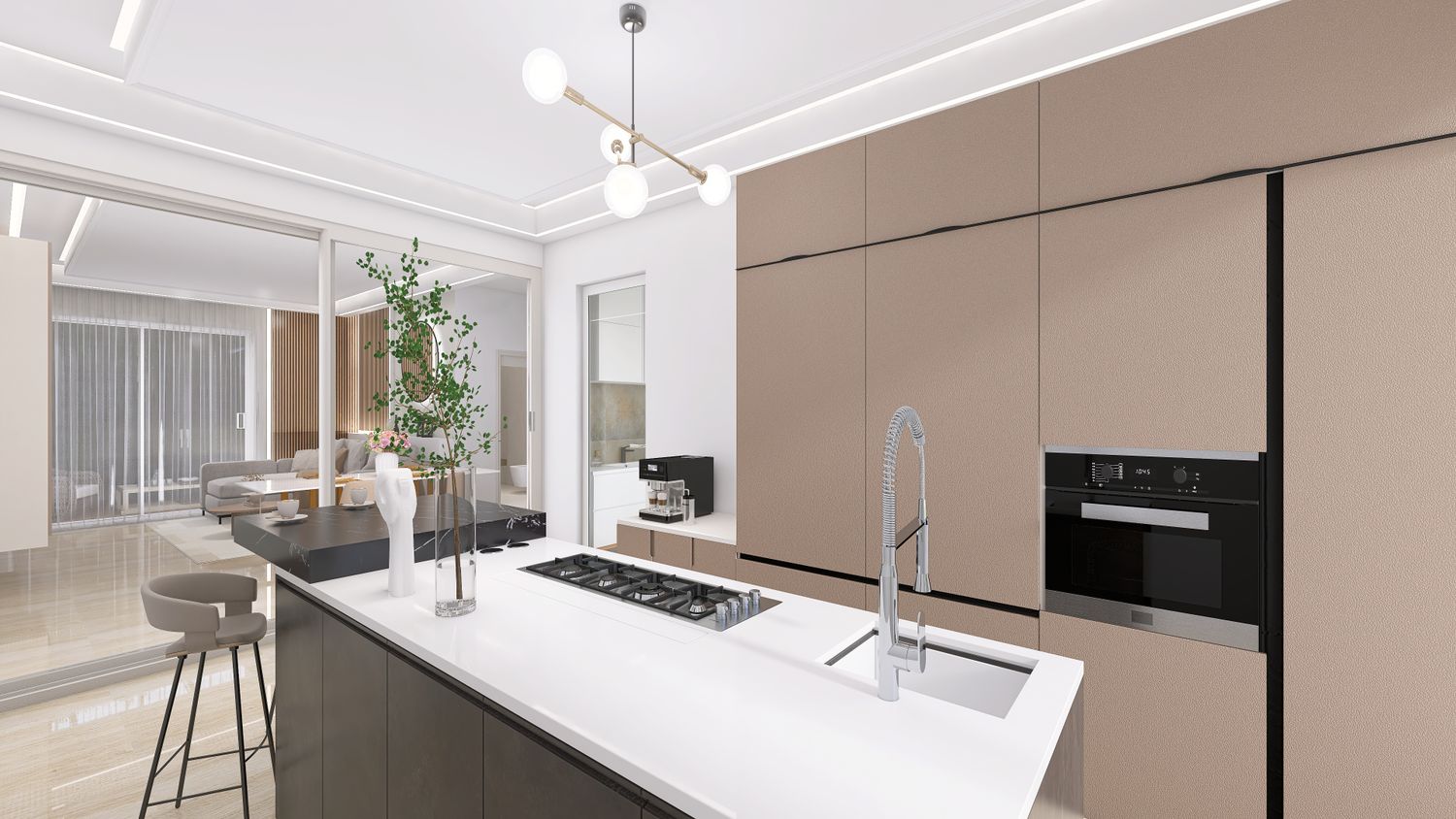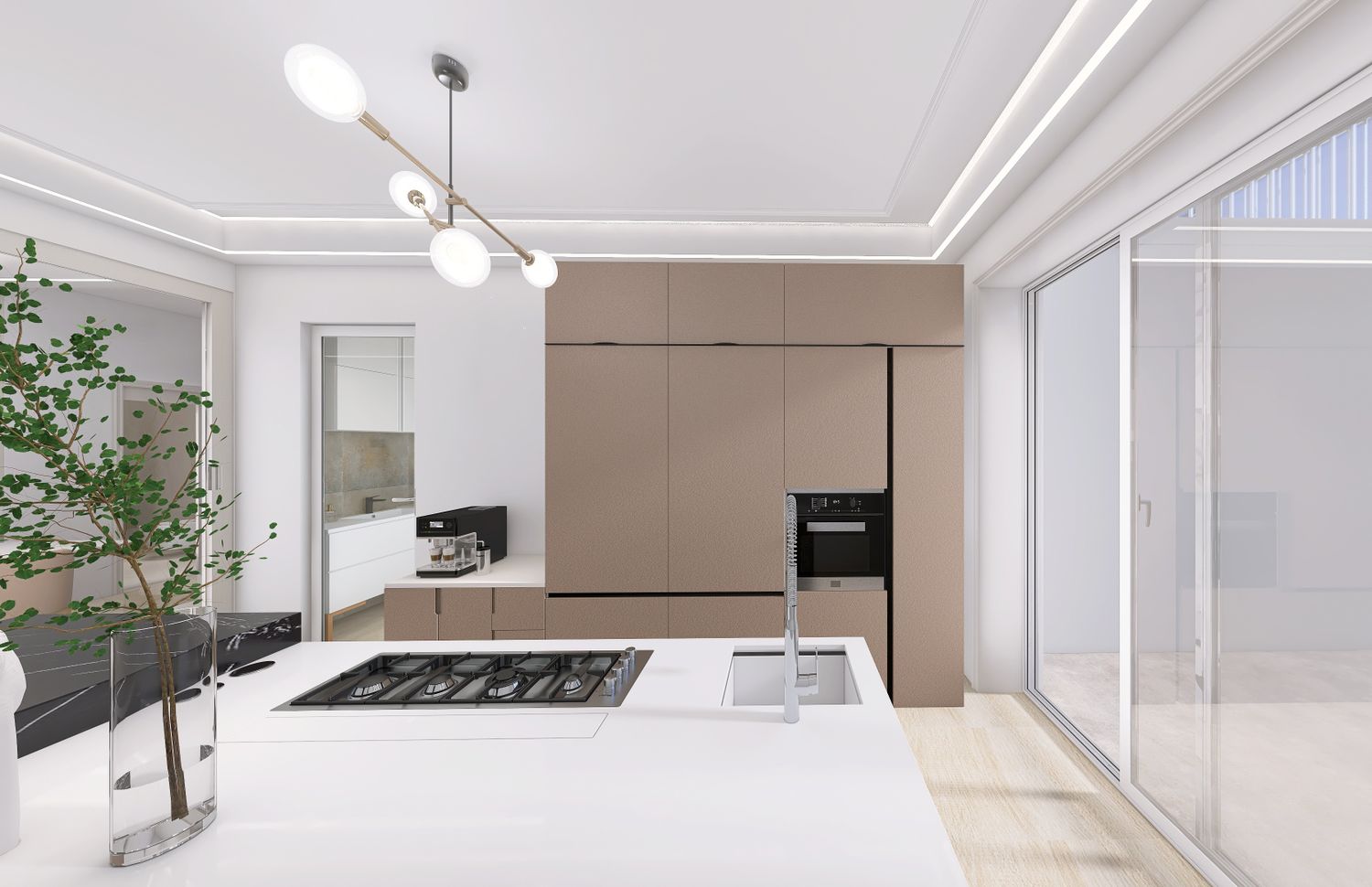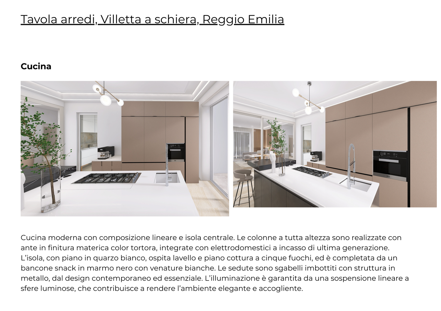 La zona cucina è caratterizzata da linee pulite e materiali contemporanei, con particolare attenzione all’organizzazione degli spazi e alla fruibilità quotidiana.