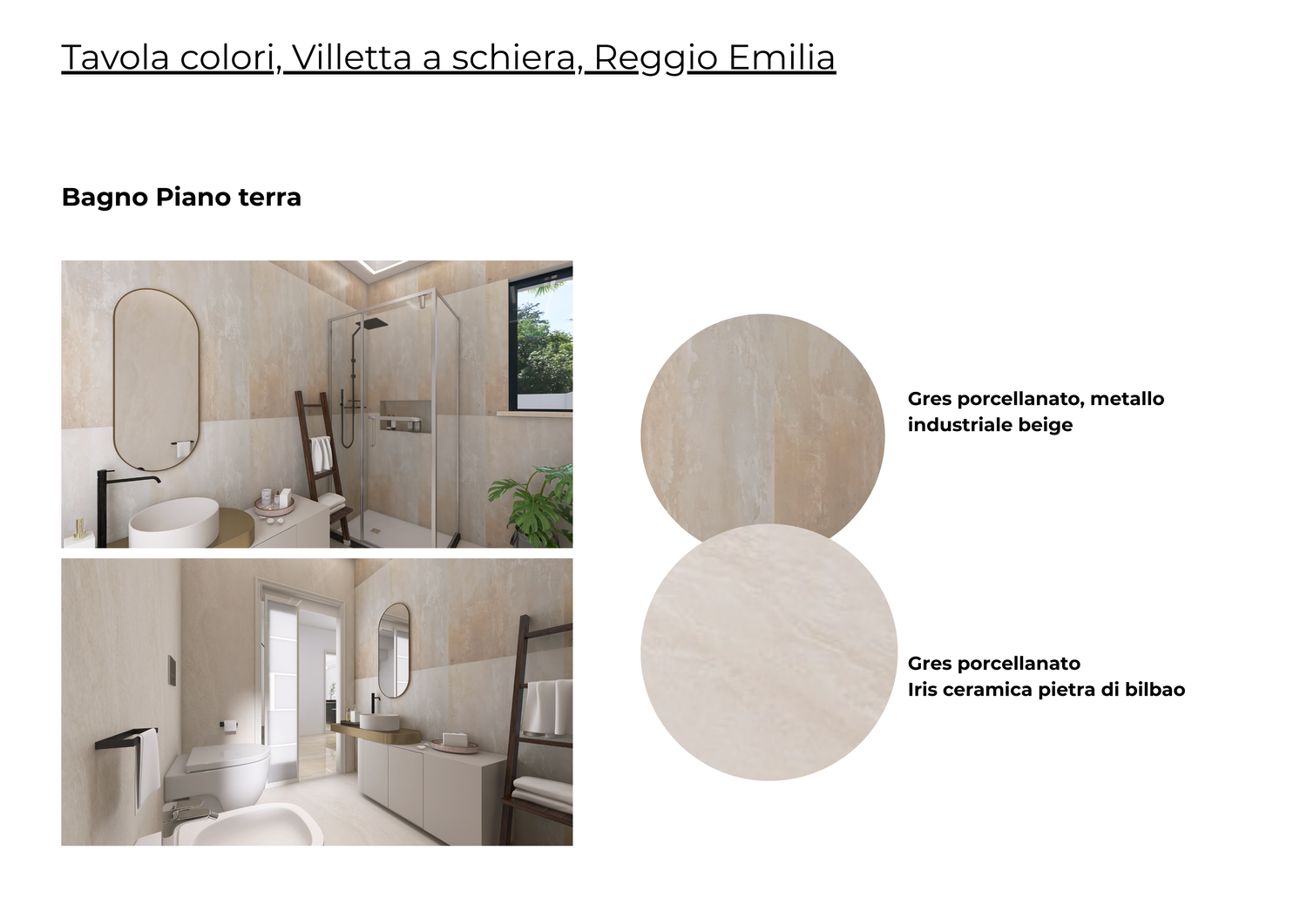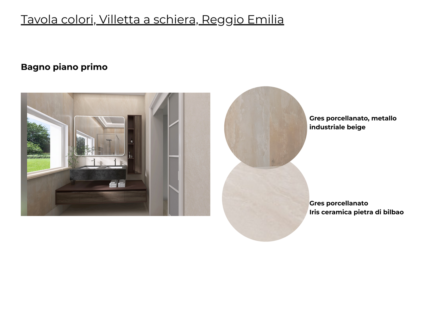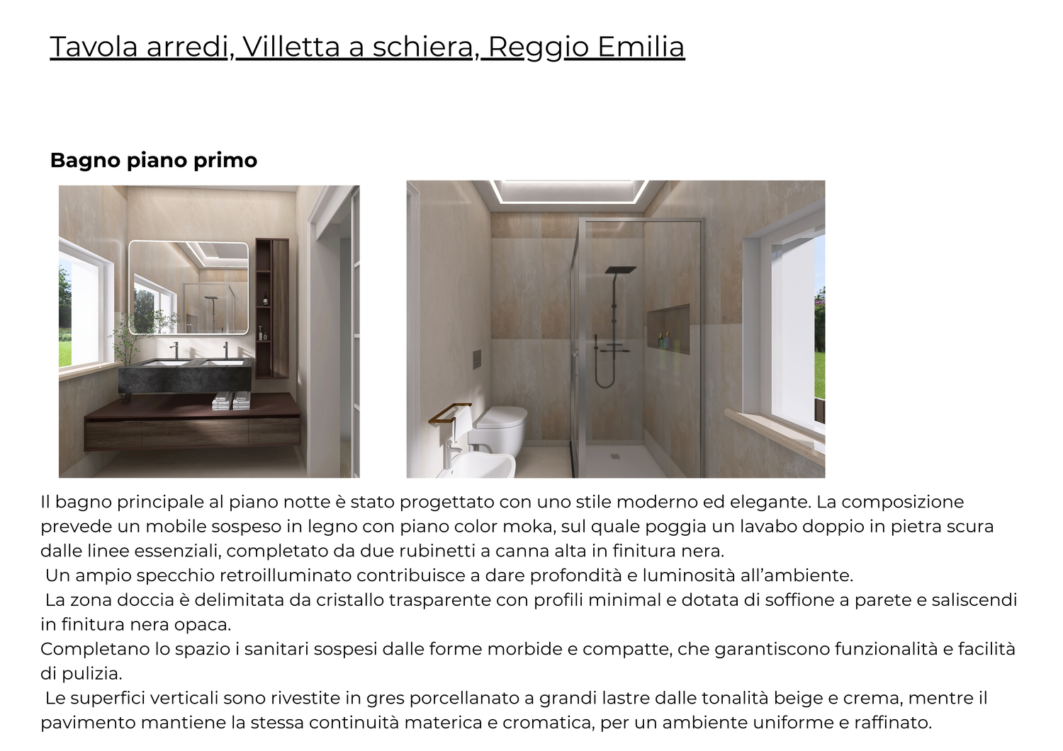 Nei bagni sono stati scelti rivestimenti dalle tonalità naturali e neutre, abbinati a elementi d’arredo dal design essenziale. Il bagno al piano terra privilegia funzionalità e praticità, mentre il bagno al primo piano, con doppio lavabo e ampio specchio retroilluminato, assume un carattere più elegante e scenografico.