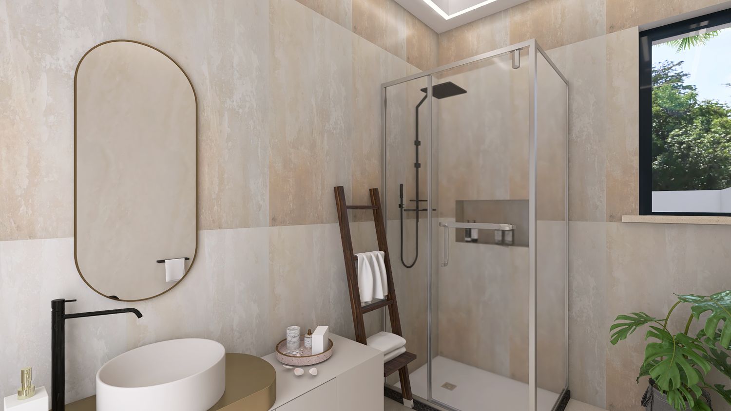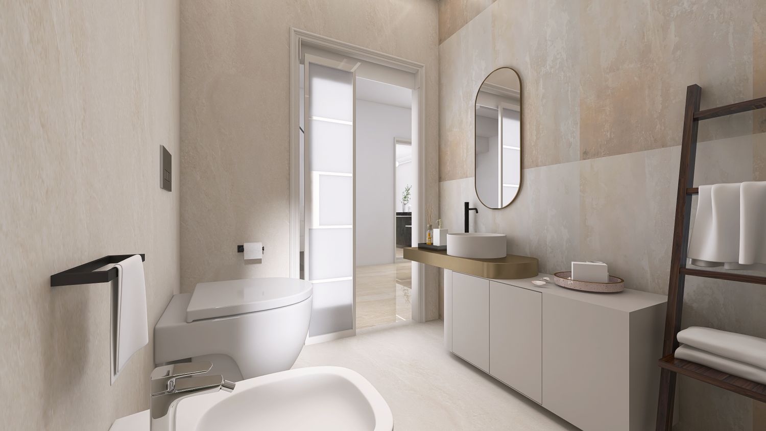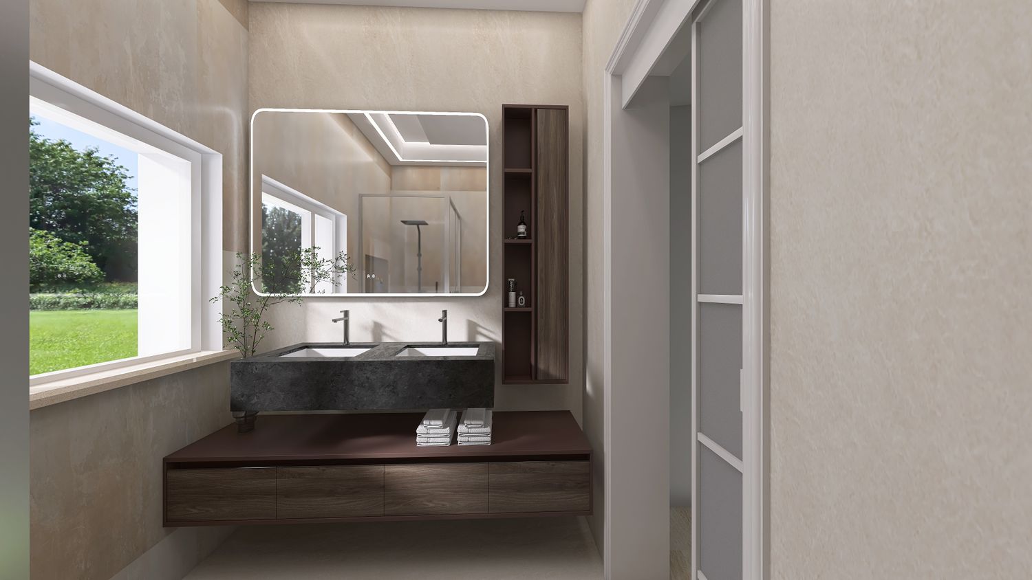 Nei bagni sono stati scelti rivestimenti dalle tonalità naturali e neutre, abbinati a elementi d’arredo dal design essenziale. Il bagno al piano terra privilegia funzionalità e praticità, mentre il bagno al primo piano, con doppio lavabo e ampio specchio retroilluminato, assume un carattere più elegante e scenografico.