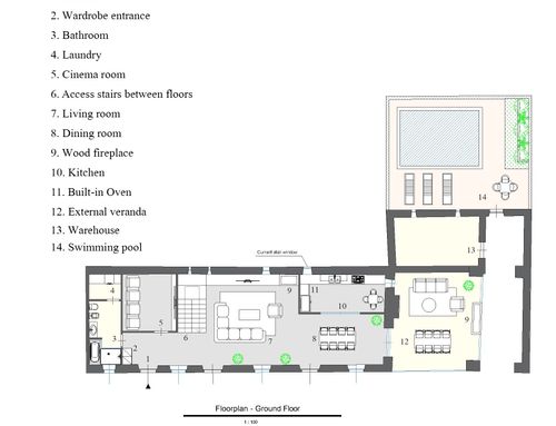 I would like to foresee on the ground floor: kitchen + veranda / living room / a small cinema room adjacent to the living room / a guest room / laundry room and bathroom. (I would prefer a smaller bathroom with a bathtub to give more space to the laundry room)