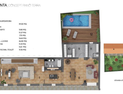 Nella parte esterna/retro della casa, adiacente alla tettoia (o meglio dove è prevista la zona dispensa, c'è un giardino di forma quasi quadrata di circa 10 metri x 7, ha un muretto che lo costeggia e vorrei considerare un piccola piscina.