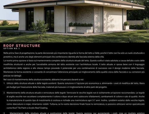 The villa is located in Puglia, in the Salento area. It was built by my parents twenty years ago, but I don’t like the roof and the outdoor flooring.