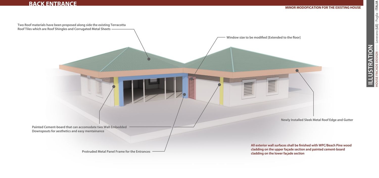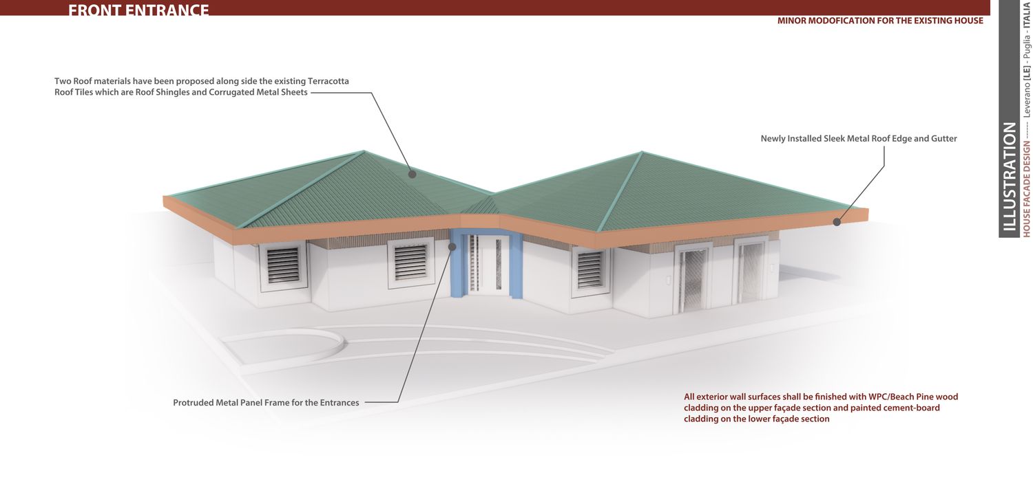 Two proposals for the Roof material have been proposed. A proposal for Roof shingles and another for corrugated metal sheets. Both alternatives offer a more contemporary appearance compared to the existing terracotta tiles. Regardless of the choice, the façade design remains compatible and harmonious with either the current roof or the proposed replacements.