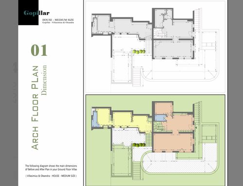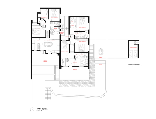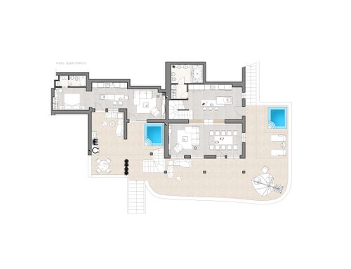 Nel piano seminterrato della villa c'è bagno, cucina e soggiorno con una terrazza tondeggiante (ad oggi terrazza a cielo aperto con bbq) sopra il bbq c'è un'altra terrazza con un tavolo, sotto un ginepro e viene usata per colazione pranzo; il piano terra è zona notte , dove c'è la veranda per ingrandirla dobbiamo necessariamente uniformarla. Si può avanzare con una terrazza a cielo aperto senza copertura dando spazio alla veranda.
