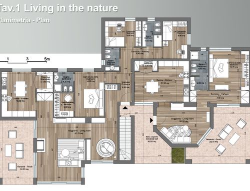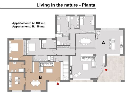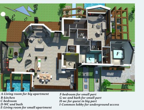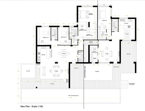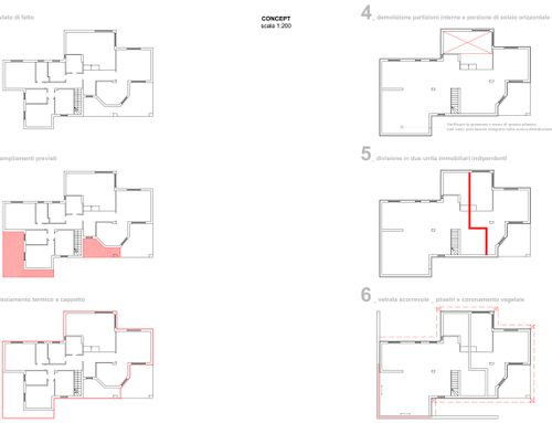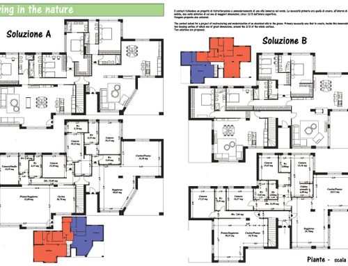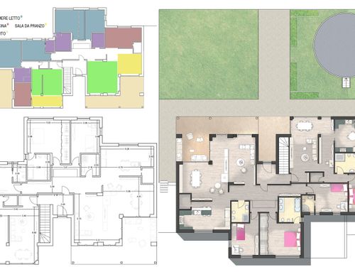 Sull'unico piano, dovranno essere definite, due unità abitative, di cui la principale sarà circa i 2/3 della superficie. La zona giorno e cucina con ampie vetrate affacceranno sul giardino con piscina antistante. Inoltre I'appartamento principale dovrà avere accesso al seminterrato che verrà adibito a lavanderia, palestra e area relax.