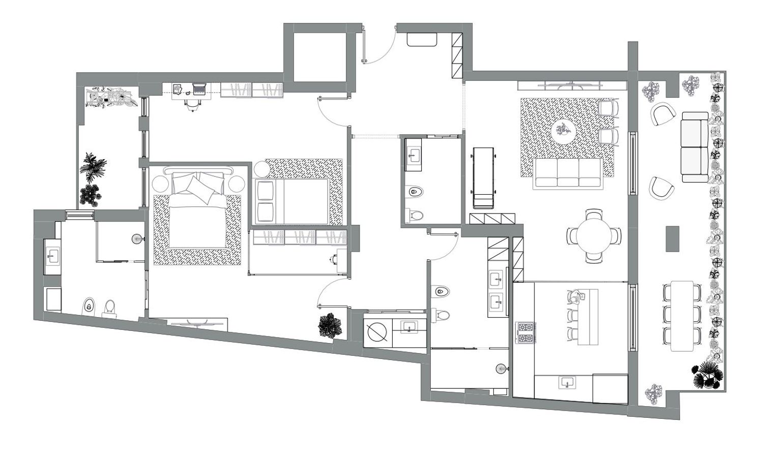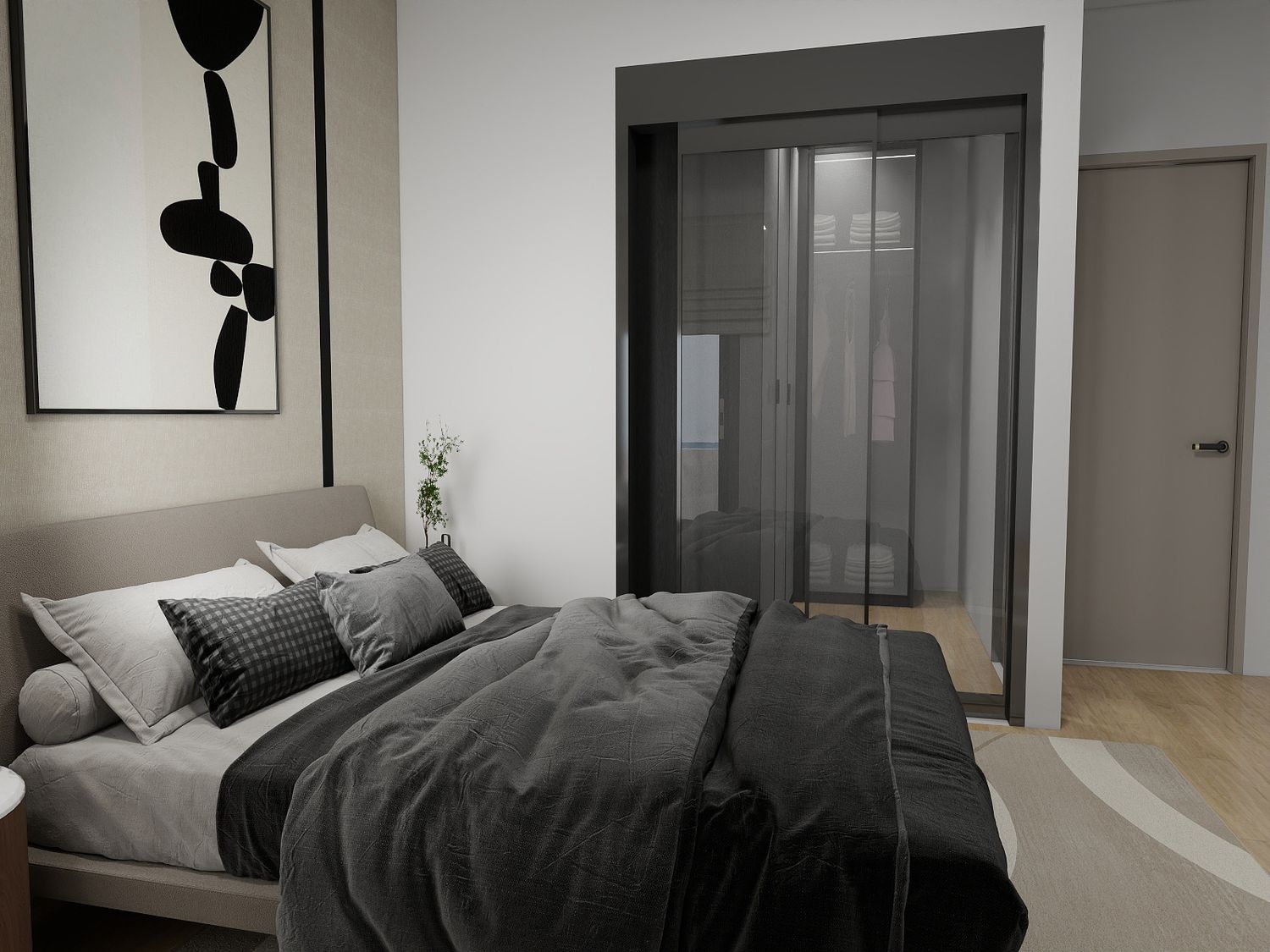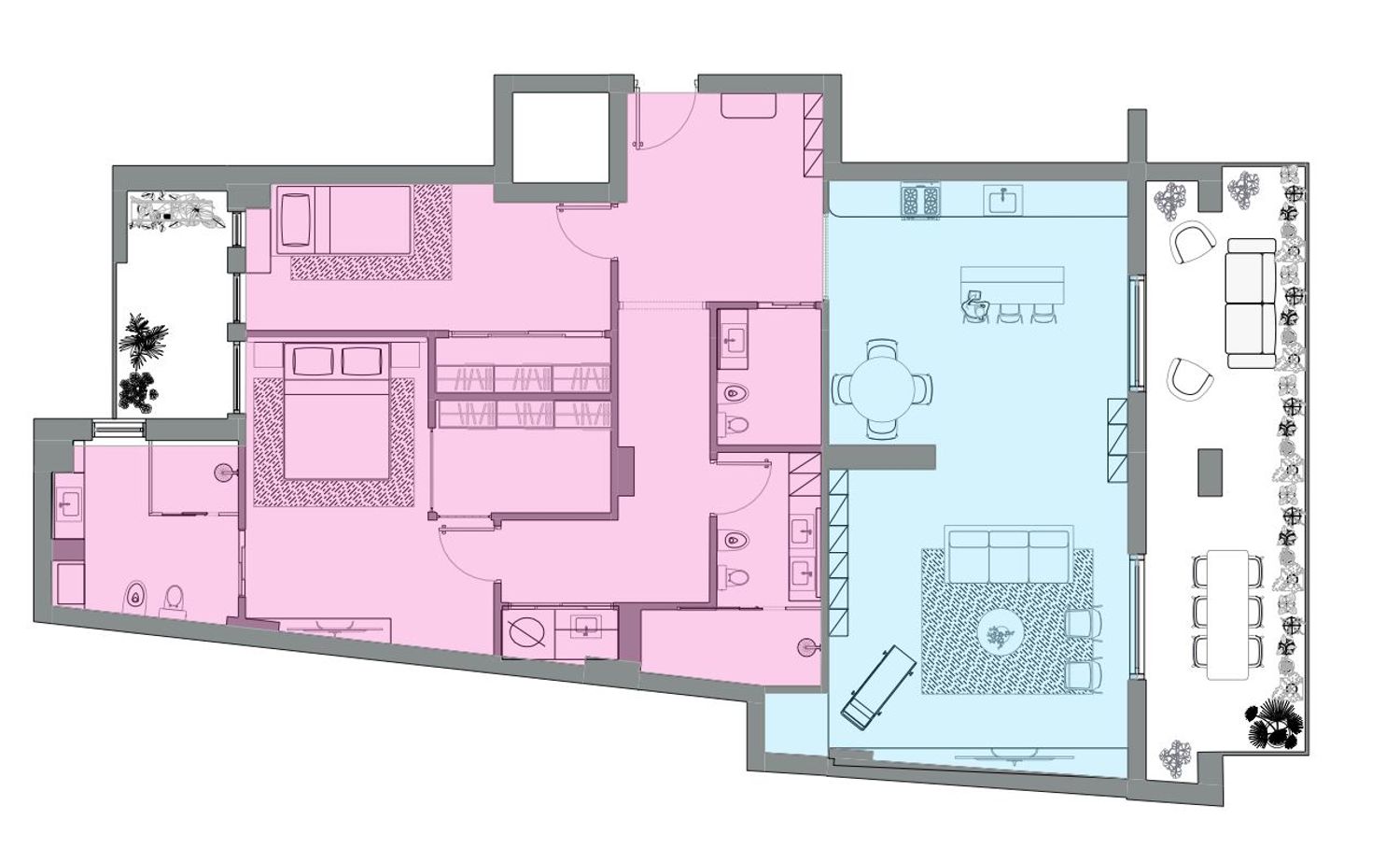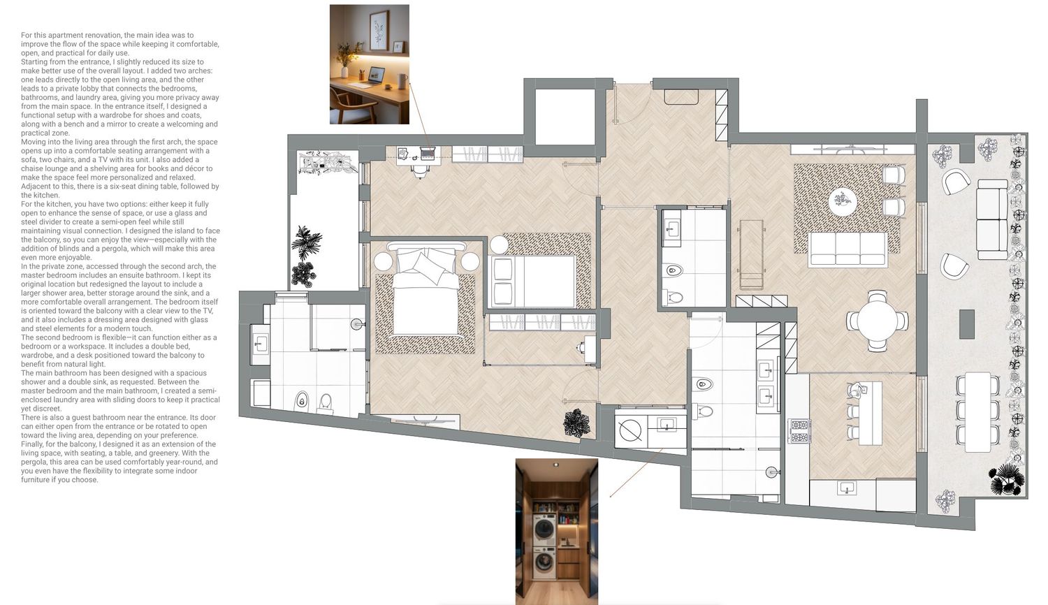 In the second option, the concept shifts toward prioritizing the living area as the main feature of the apartment. To achieve this, I slightly reduced the space allocated to the bedrooms and restrooms, allowing for a significantly larger living room. This creates a more open, spacious feel, making the living area the central hub of the home—ideal for gatherings and maximizing the connection with the balcony.