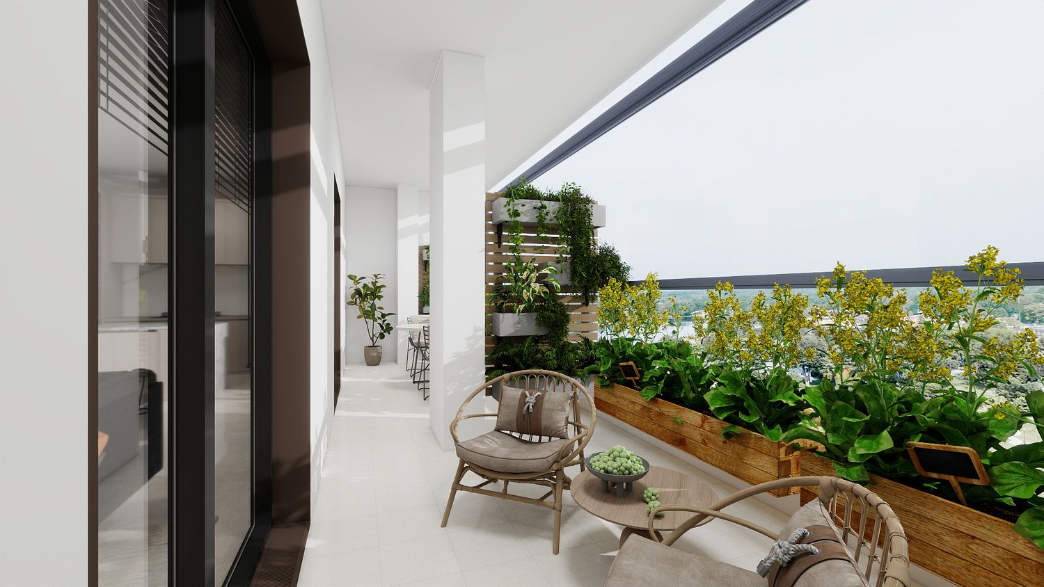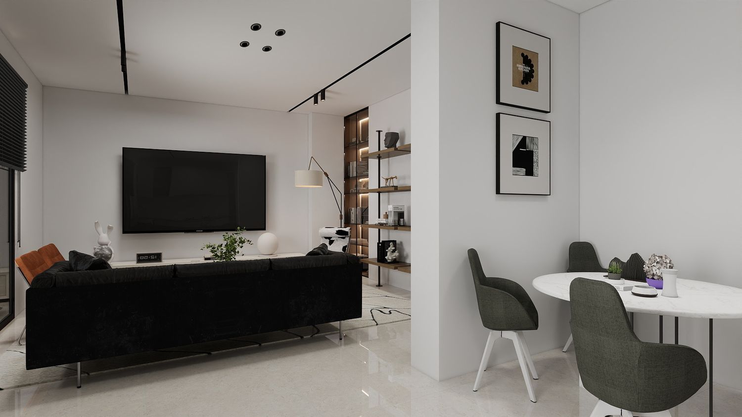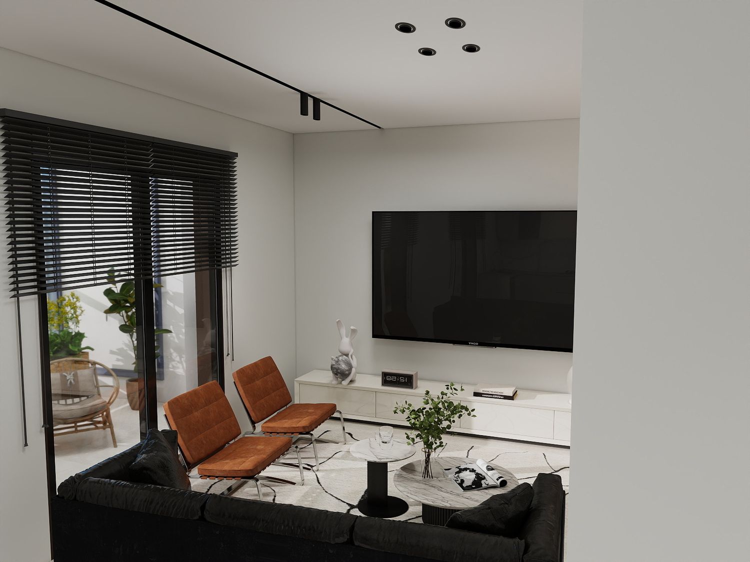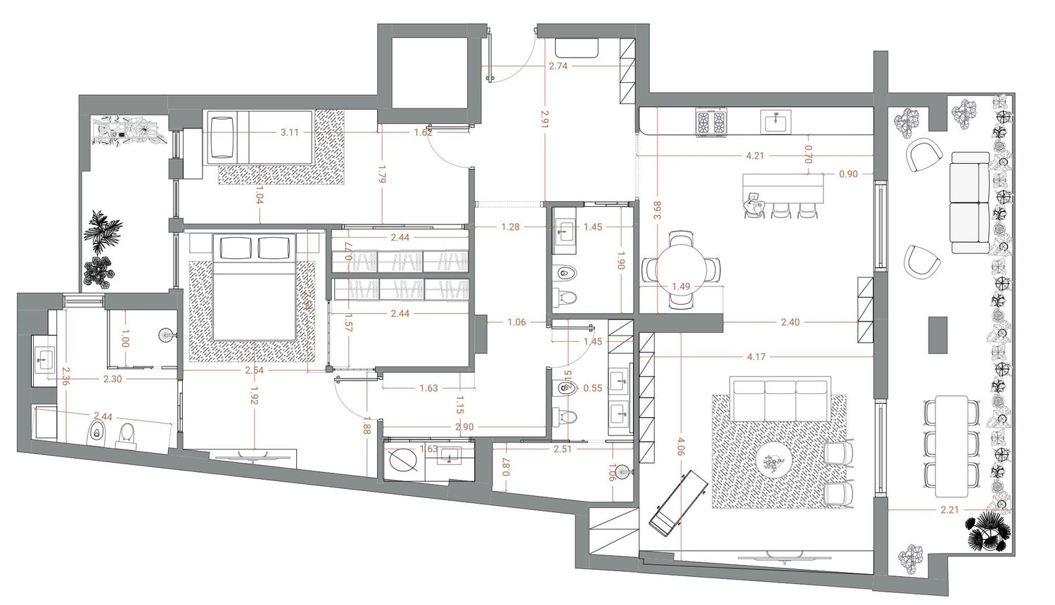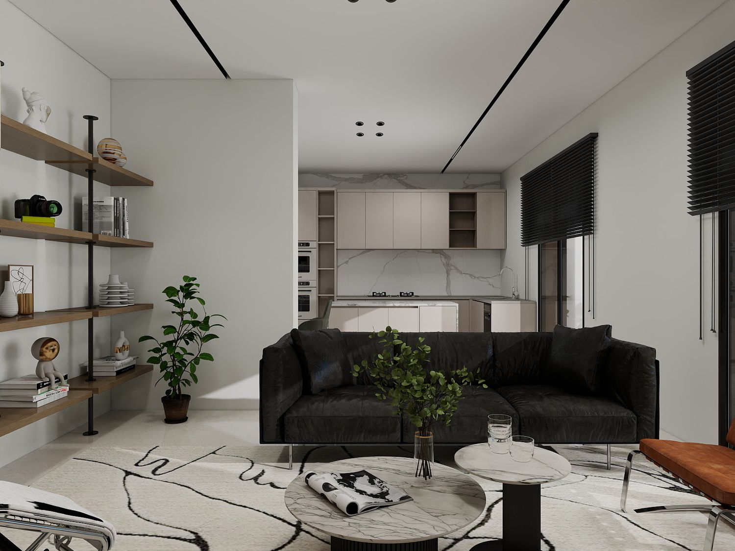In the second option, the concept shifts toward prioritizing the living area as the main feature of the apartment. To achieve this, I slightly reduced the space allocated to the bedrooms and restrooms, allowing for a significantly larger living room. This creates a more open, spacious feel, making the living area the central hub of the home—ideal for gatherings and maximizing the connection with the balcony.