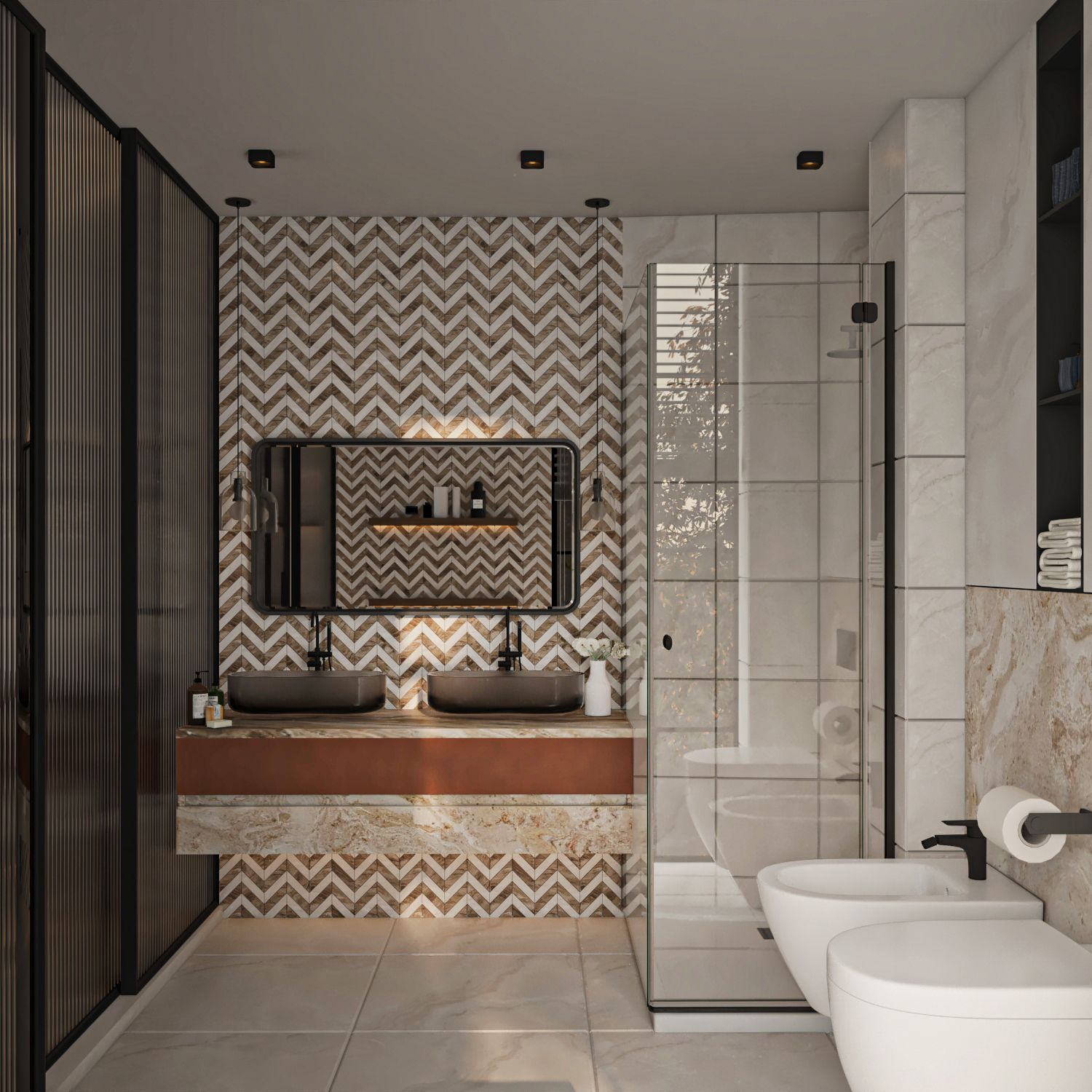 The night area has been arranged with the two bedrooms separated by a shared walk‑in closet, ensuring privacy and functional flow. We also considered creating a visual connection between the bathroom and the bedroom to enhance the sense of continuity and contemporary comfort.