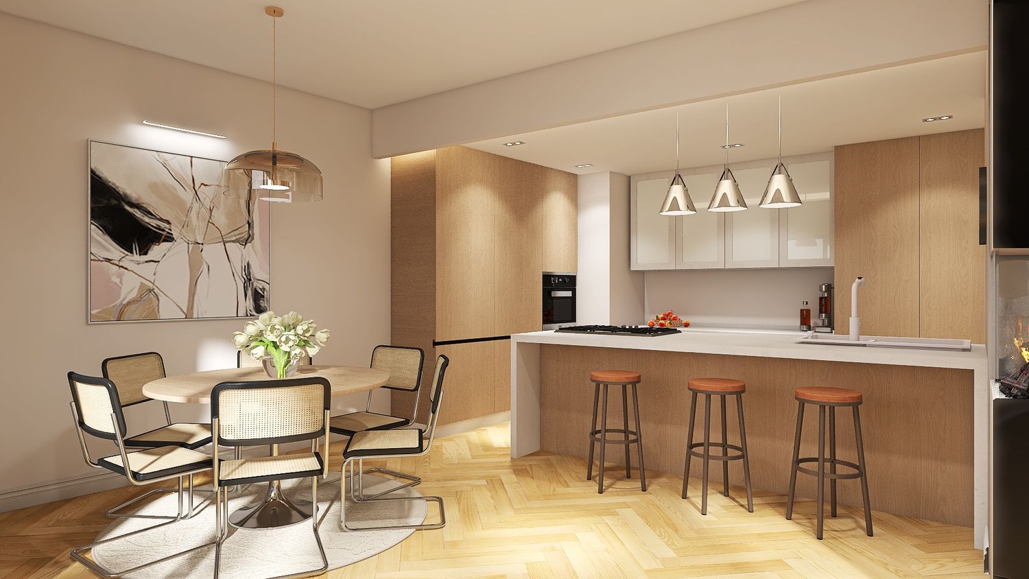 The design process began with your request to prioritize the kitchen as the central and most lived-in space. In response, the day area has been conceived as an open, generous environment where the kitchen naturally becomes the heart of the home. It features a large composition of tall cabinetry integrating separate refrigerator and freezer units, oven, and ample storage, all finished in wood veneer in line with your preferences.