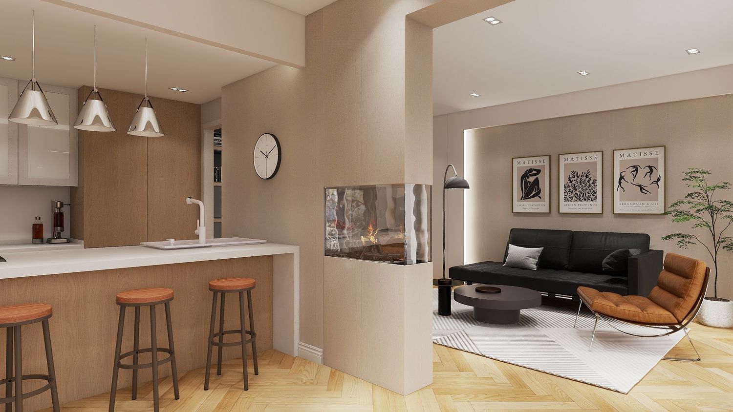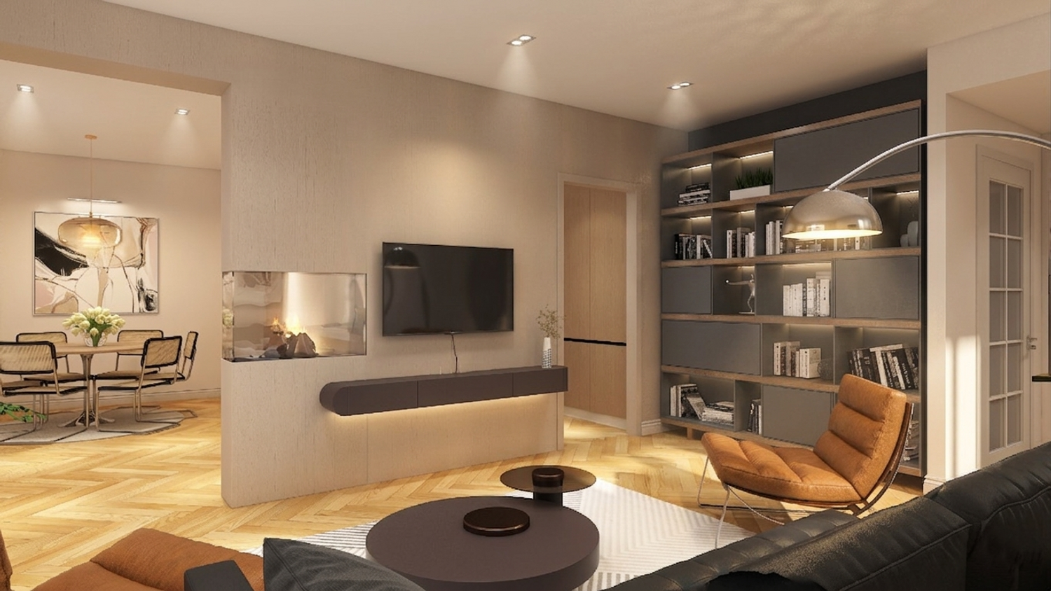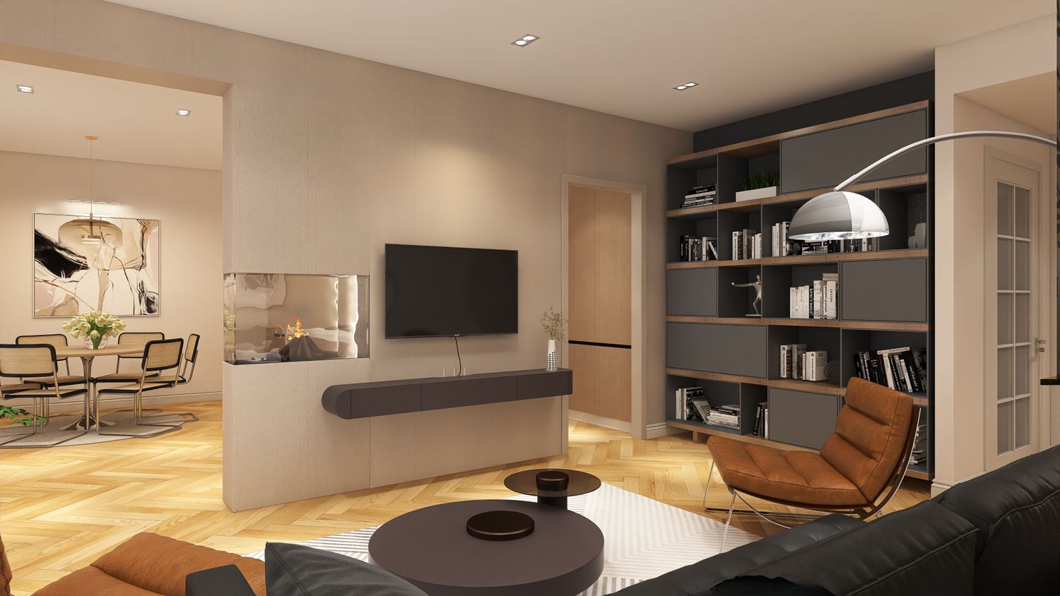 The kitchen is further complemented by a round dining table for six, enhancing its role as a gathering point. Adjacent to this, the living area is organized as a cohesive and inviting setting, structured around your selected statement furniture pieces—the sofa, armchairs, and coffee table—which act as key anchors of the overall design. A contemporary bookcase and an console TV wall element with an integrated bioethanol fireplace contribute to a sense of depth, warmth, and visual continuity.