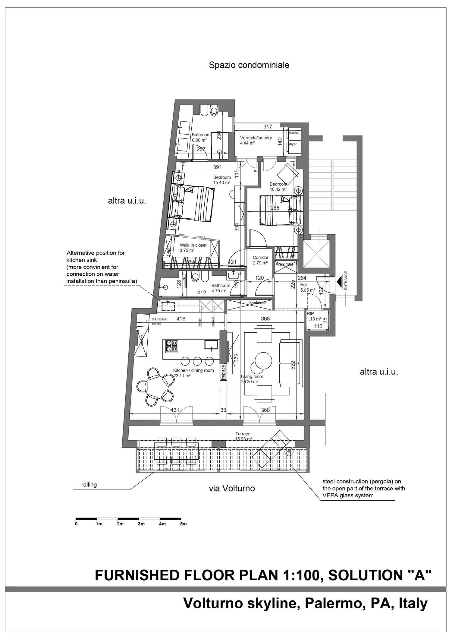 The two proposals explore different configurations of the terrace and lounge elements. In Solution A, the lounge chair is positioned externally, reinforcing the outdoor living experience, while in Solution B it is incorporated within the interior, allowing the terrace to function as a more structured seating area with two armchairs.
