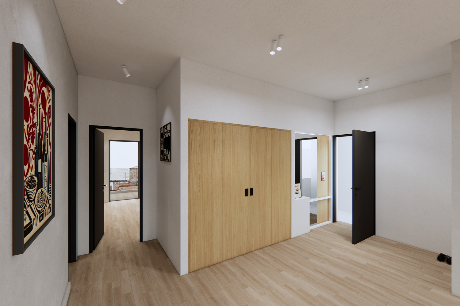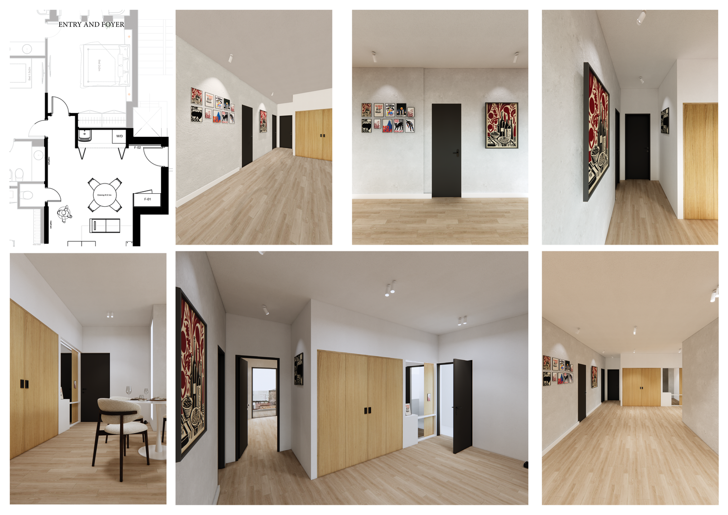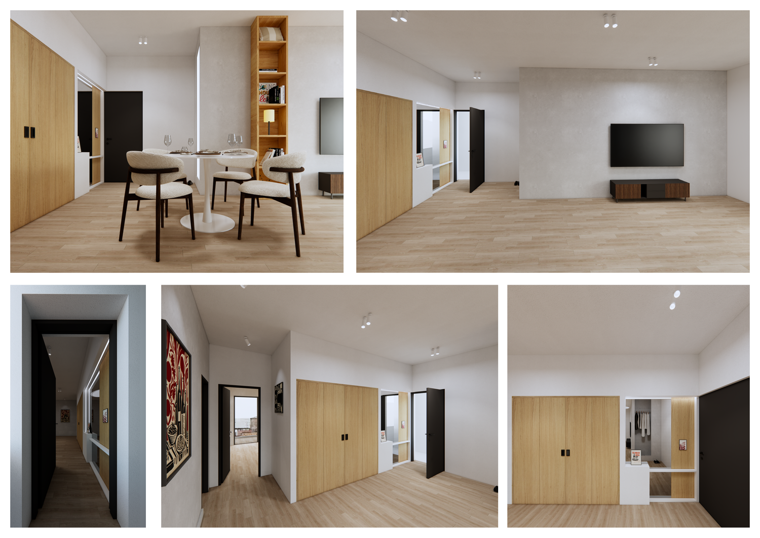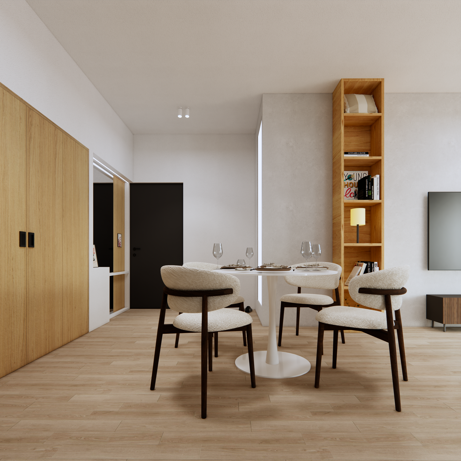 Upon entering, you are greeted by a spacious open-plan area. A dining table with four chairs sits centrally. To the left, we have designed a built-in wardrobe for convenient storage of clothing and shoes. Once the door is closed, a large mirror panel on the right reflects both the natural light and the view from outside. Adjacent to this is a built-in laundry area, featuring a hidden design that maintains a minimalist aesthetic.