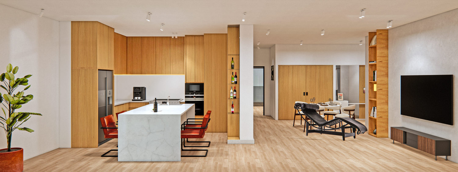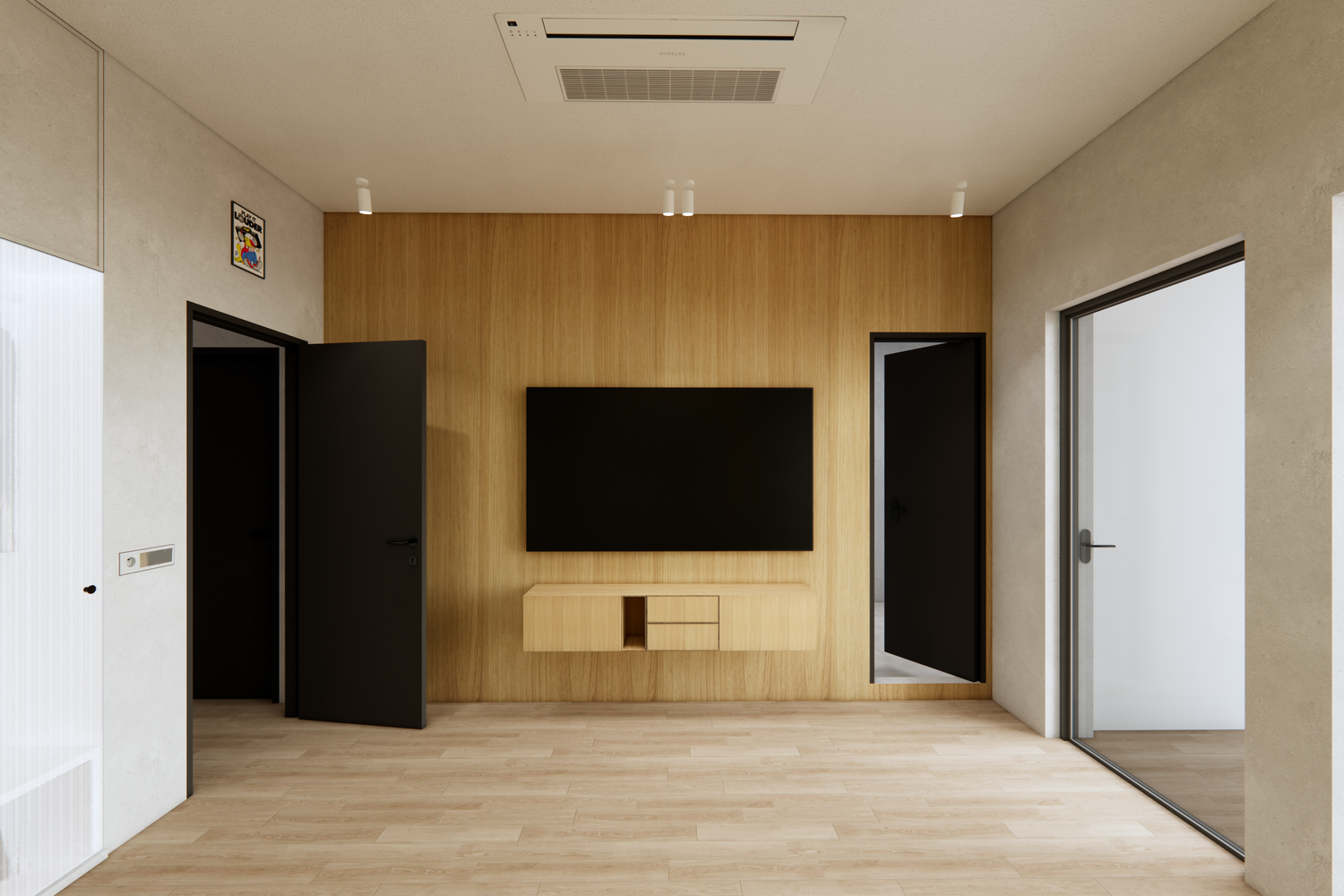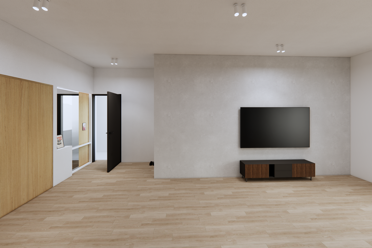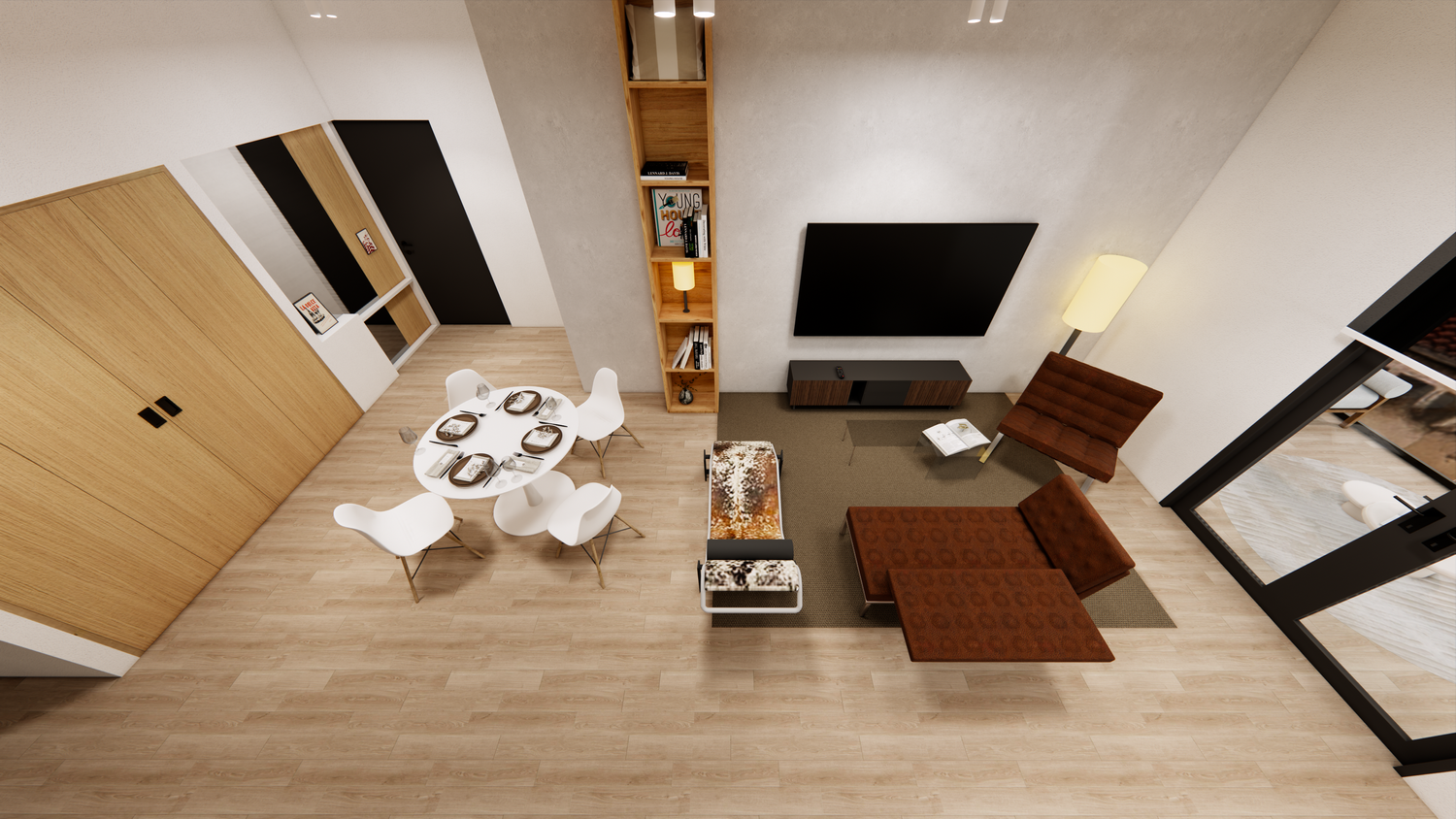 Upon entering, you are greeted by a spacious open-plan area. A dining table with four chairs sits centrally. To the left, we have designed a built-in wardrobe for convenient storage of clothing and shoes. Once the door is closed, a large mirror panel on the right reflects both the natural light and the view from outside. Adjacent to this is a built-in laundry area, featuring a hidden design that maintains a minimalist aesthetic.