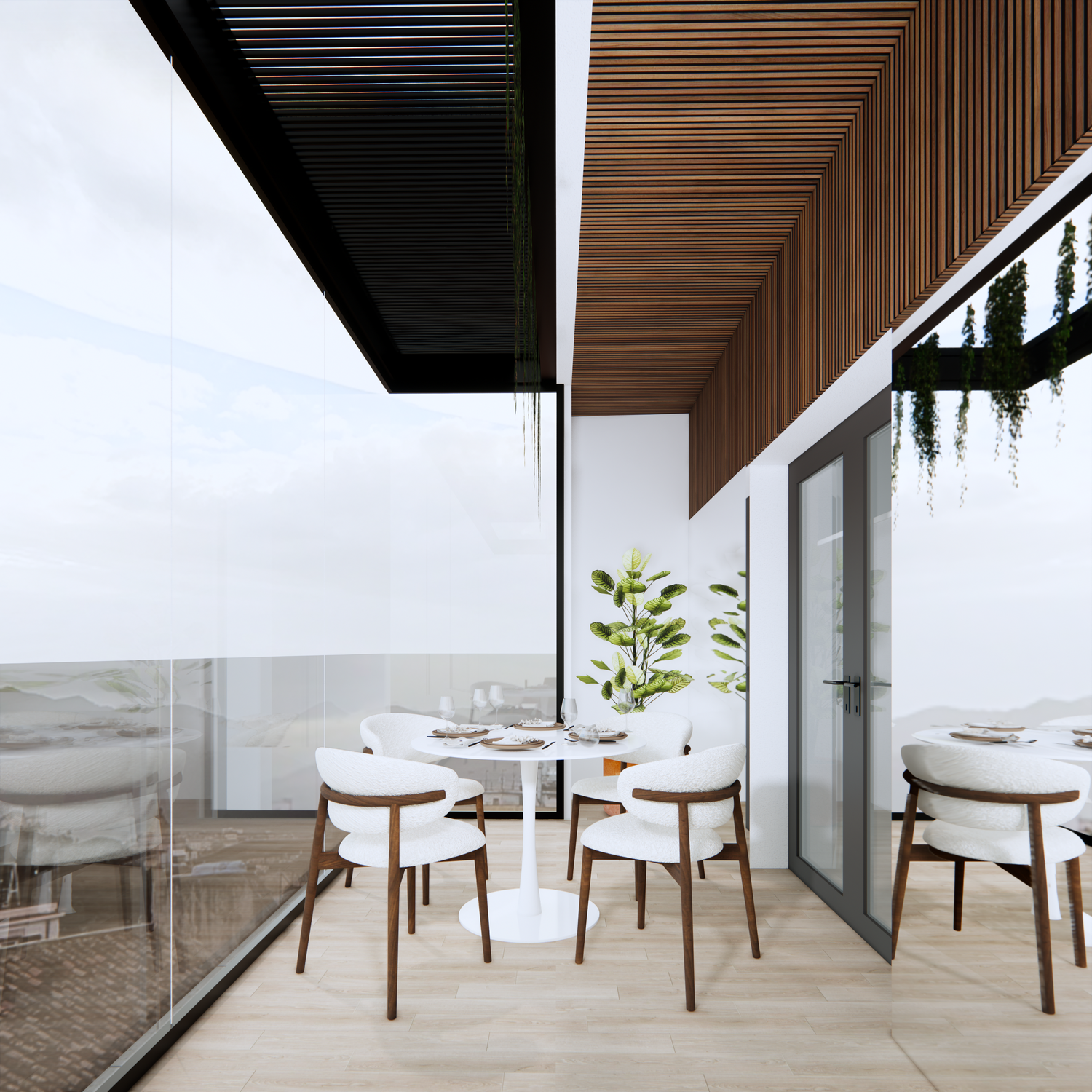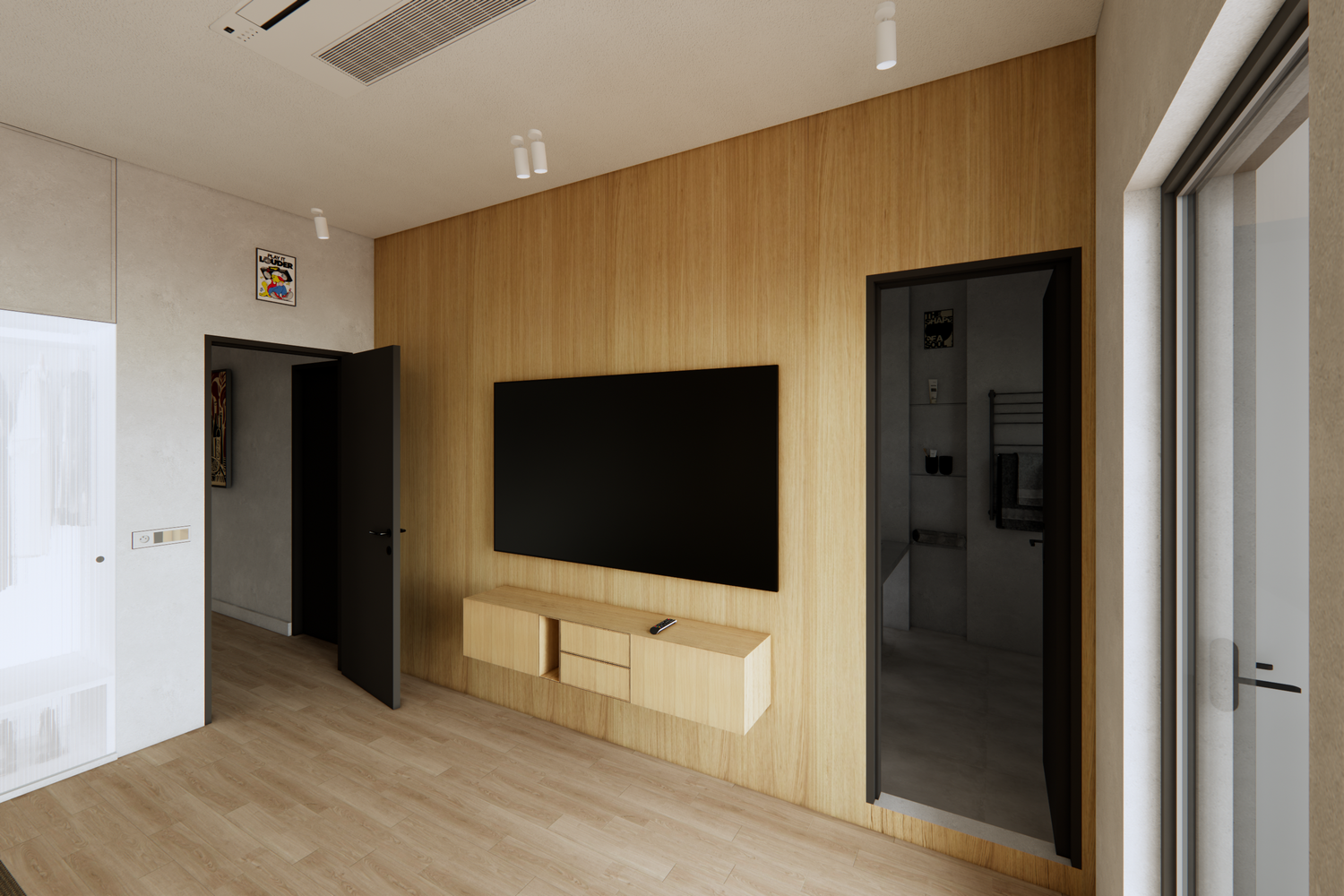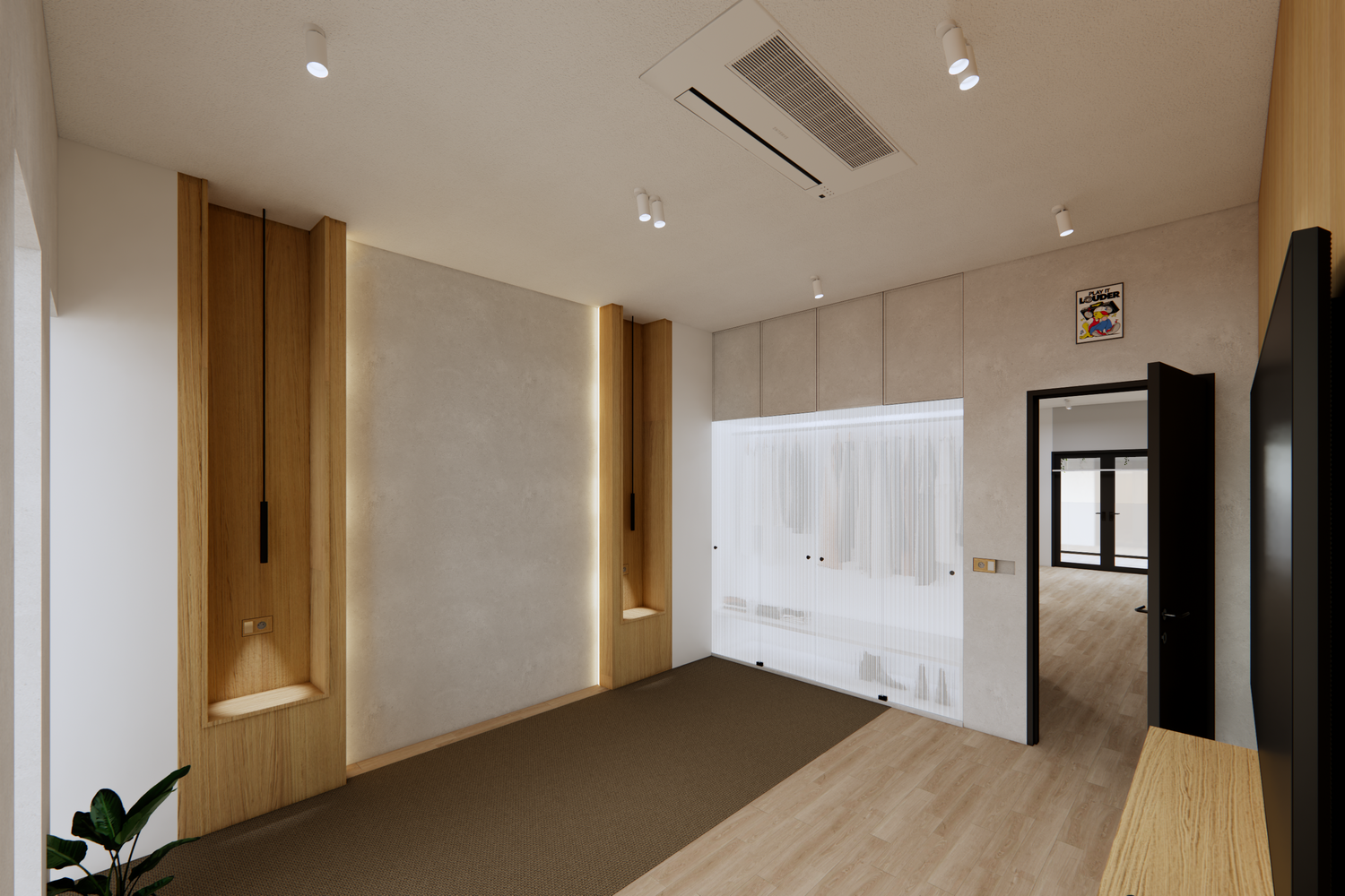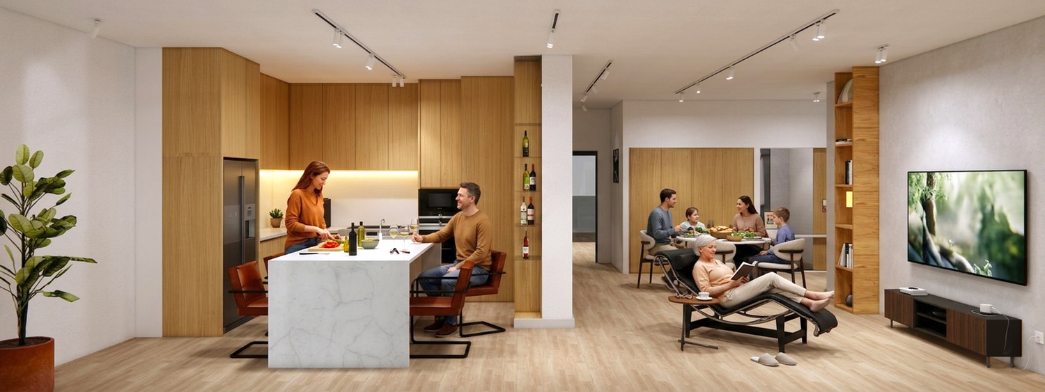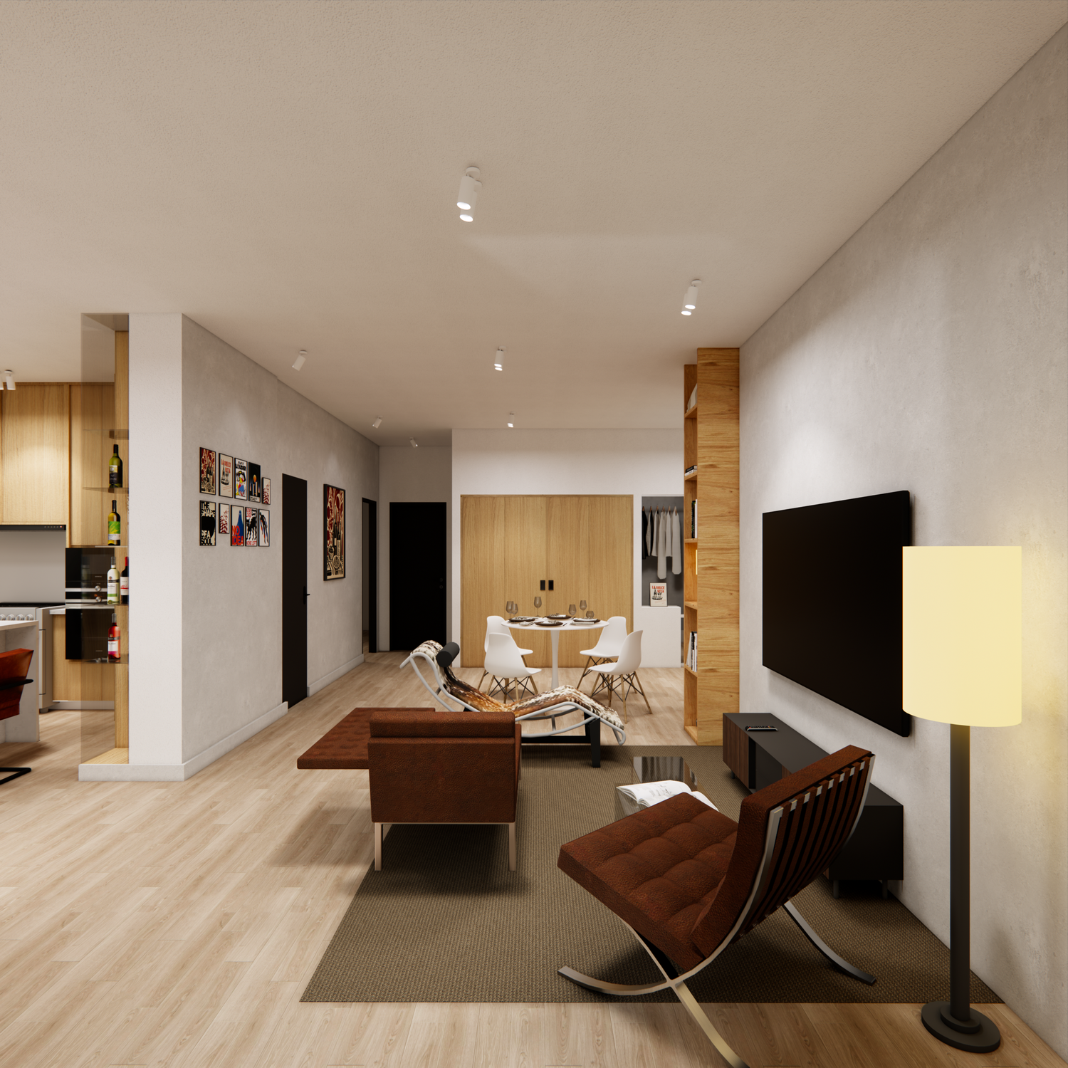 Upon entering, you are greeted by a spacious open-plan area. A dining table with four chairs sits centrally. To the left, we have designed a built-in wardrobe for convenient storage of clothing and shoes. Once the door is closed, a large mirror panel on the right reflects both the natural light and the view from outside. Adjacent to this is a built-in laundry area, featuring a hidden design that maintains a minimalist aesthetic.