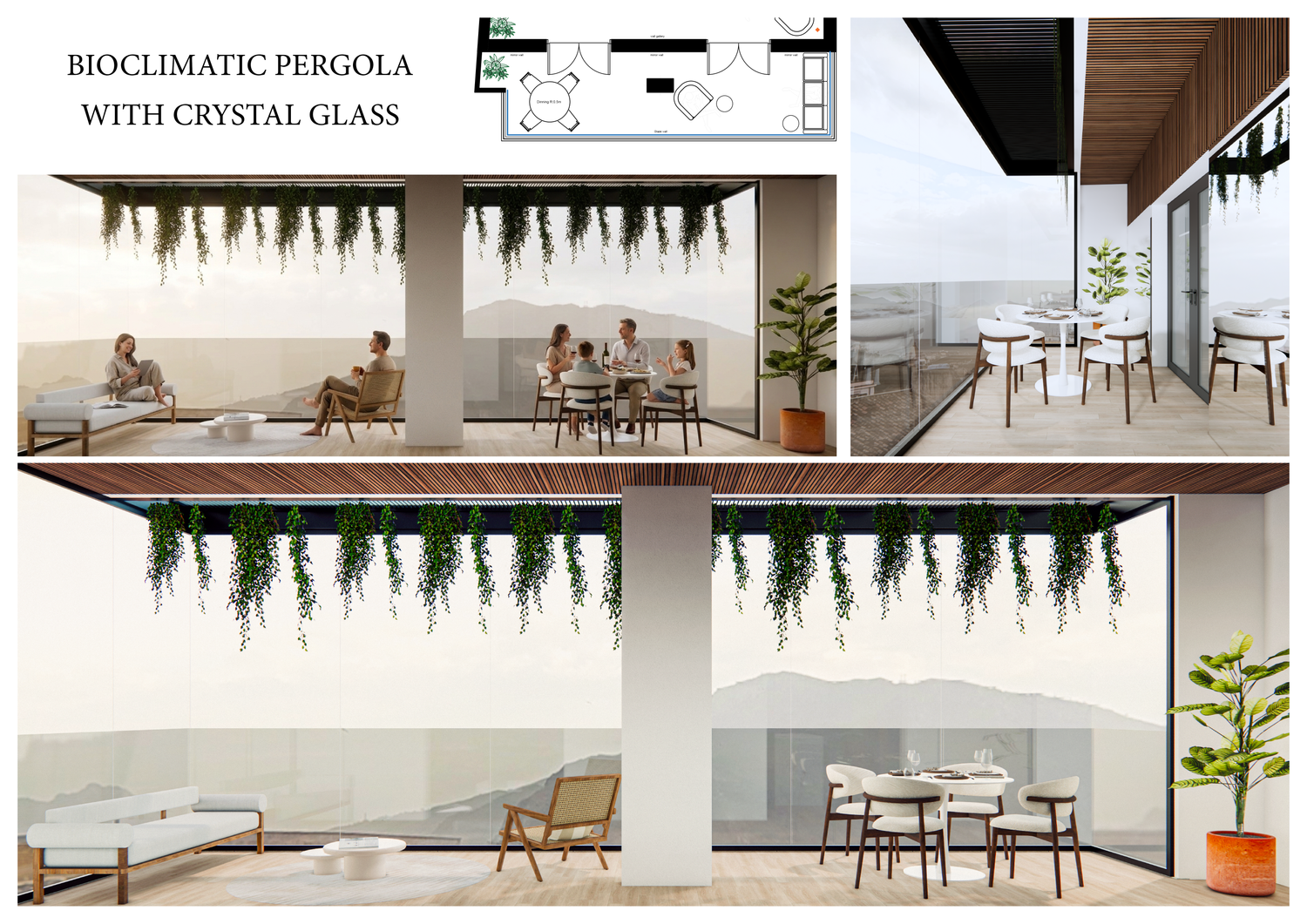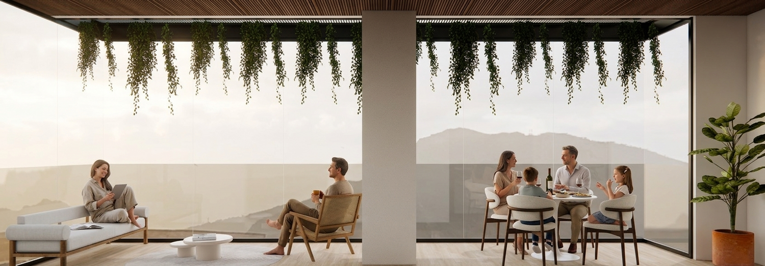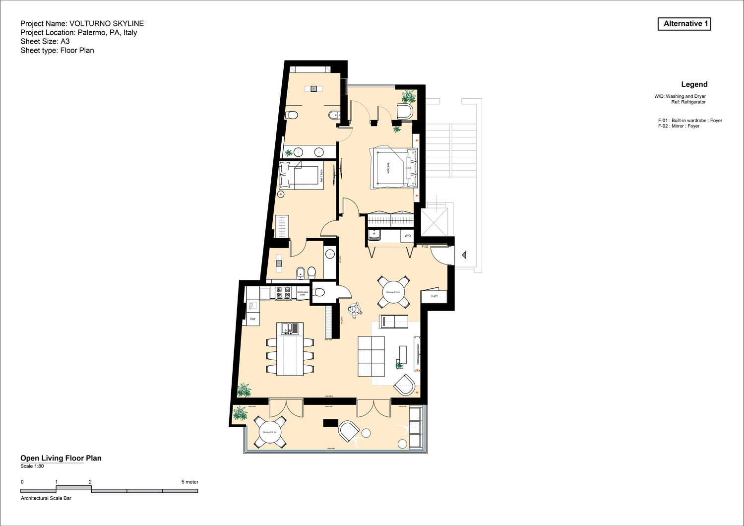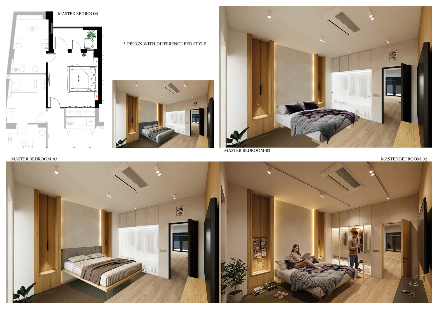 Upon entering, you are greeted by a spacious open-plan area. A dining table with four chairs sits centrally. To the left, we have designed a built-in wardrobe for convenient storage of clothing and shoes. Once the door is closed, a large mirror panel on the right reflects both the natural light and the view from outside. Adjacent to this is a built-in laundry area, featuring a hidden design that maintains a minimalist aesthetic.