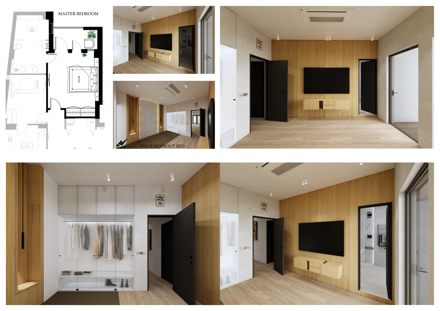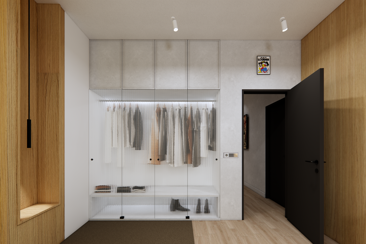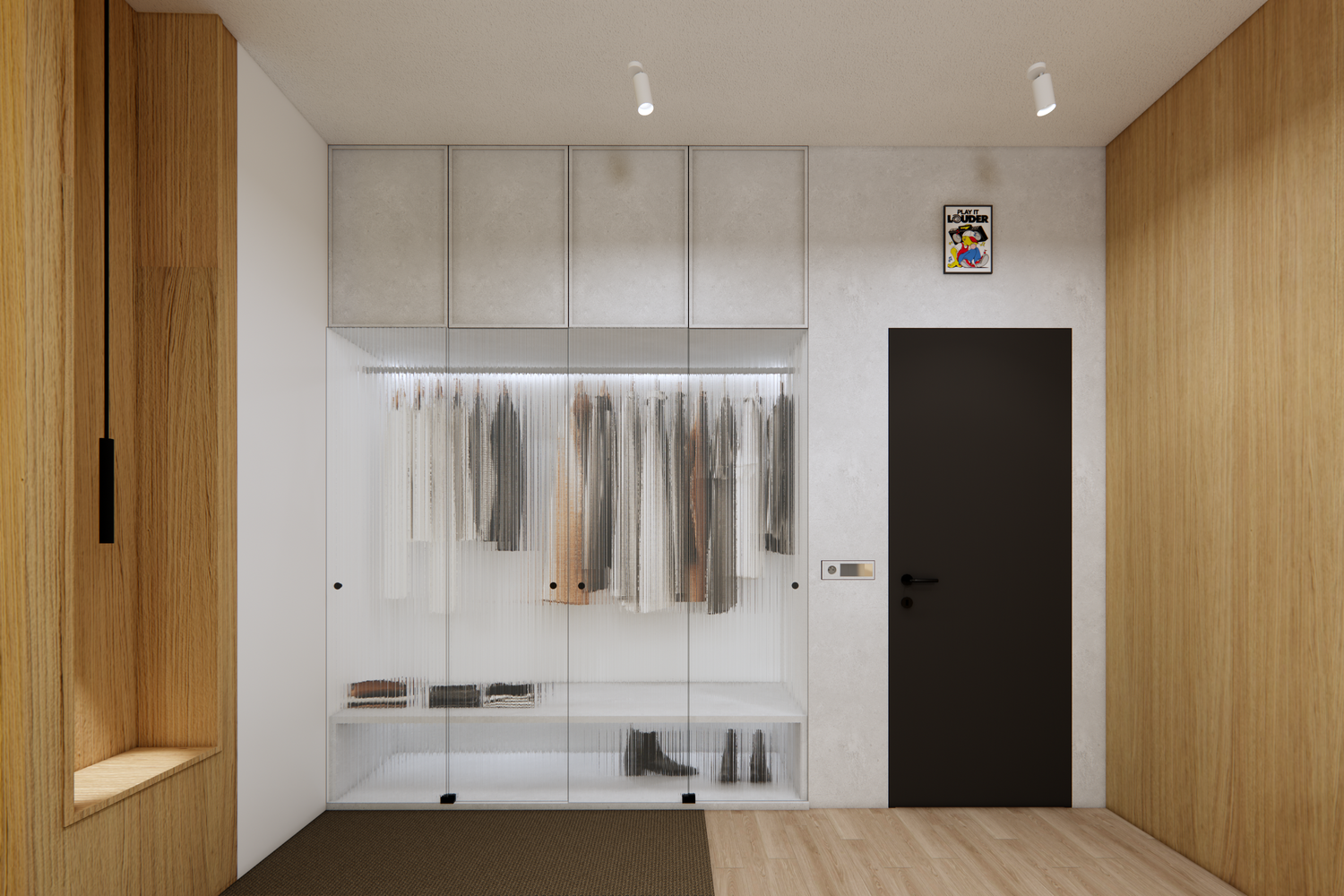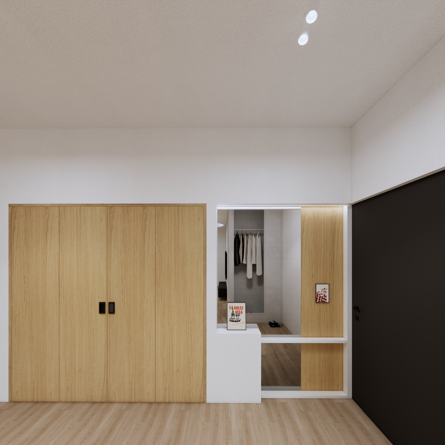 Entrando, sarete accolti da un ampio spazio open space. Un tavolo da pranzo con quattro sedie è posizionato al centro. A sinistra, abbiamo progettato un armadio a muro per riporre comodamente abiti e scarpe. Una volta chiusa la porta, un grande pannello a specchio sulla destra riflette sia la luce naturale che il panorama esterno. Adiacente si trova una zona lavanderia integrata, caratterizzata da un design a scomparsa che mantiene un'estetica minimalista.