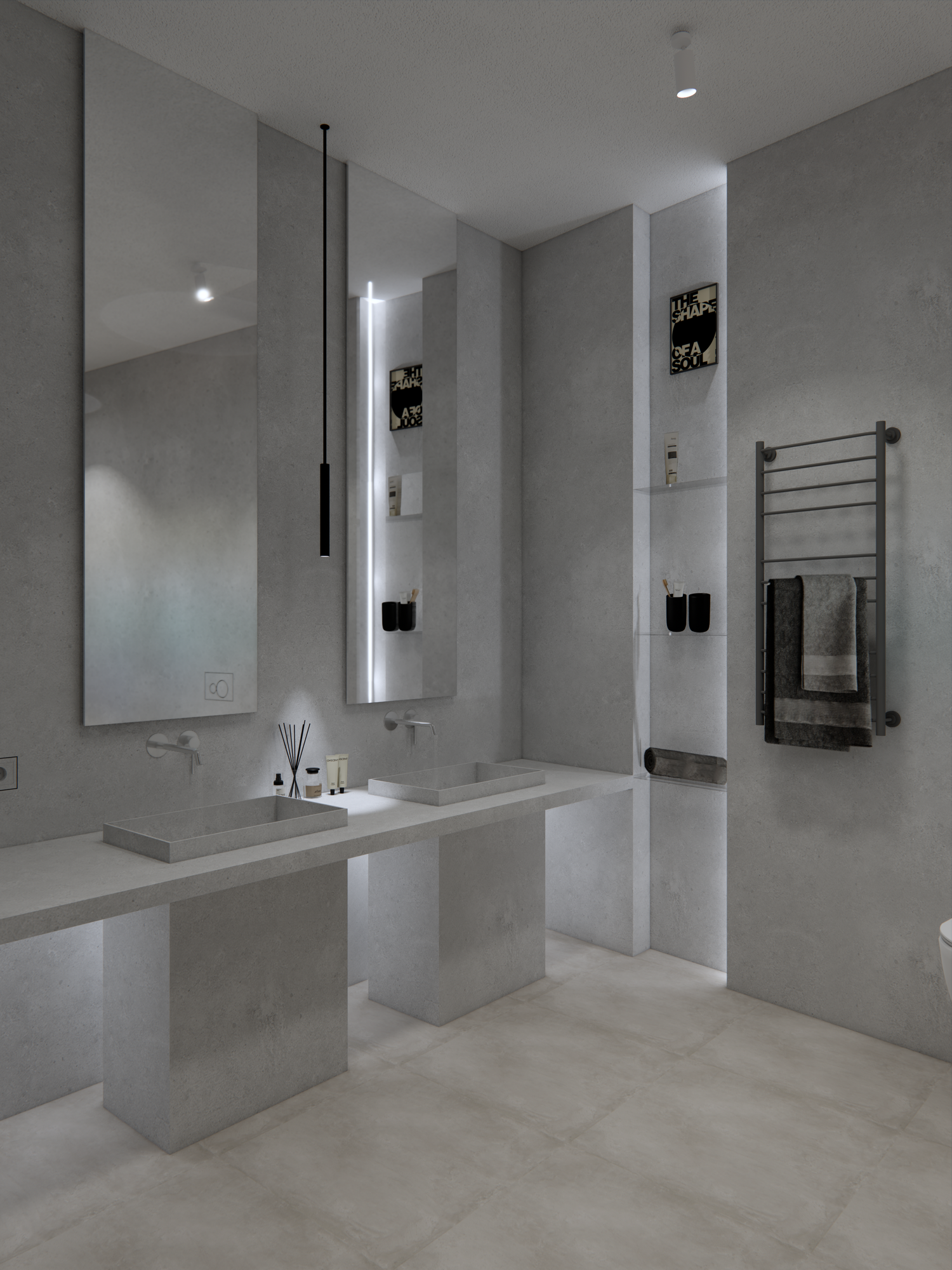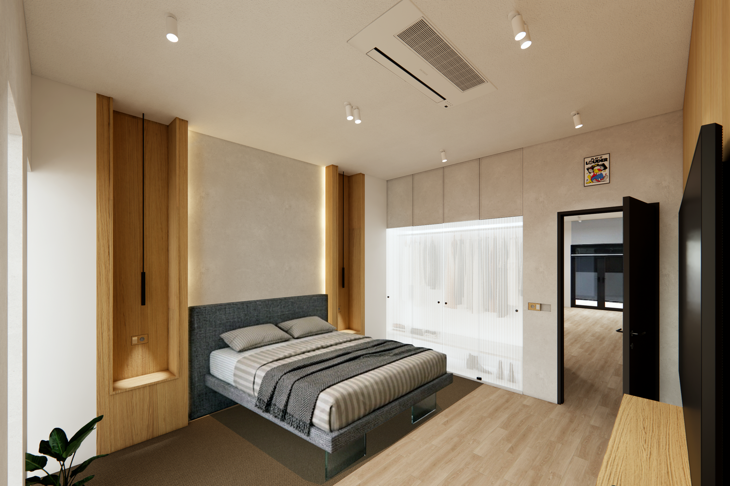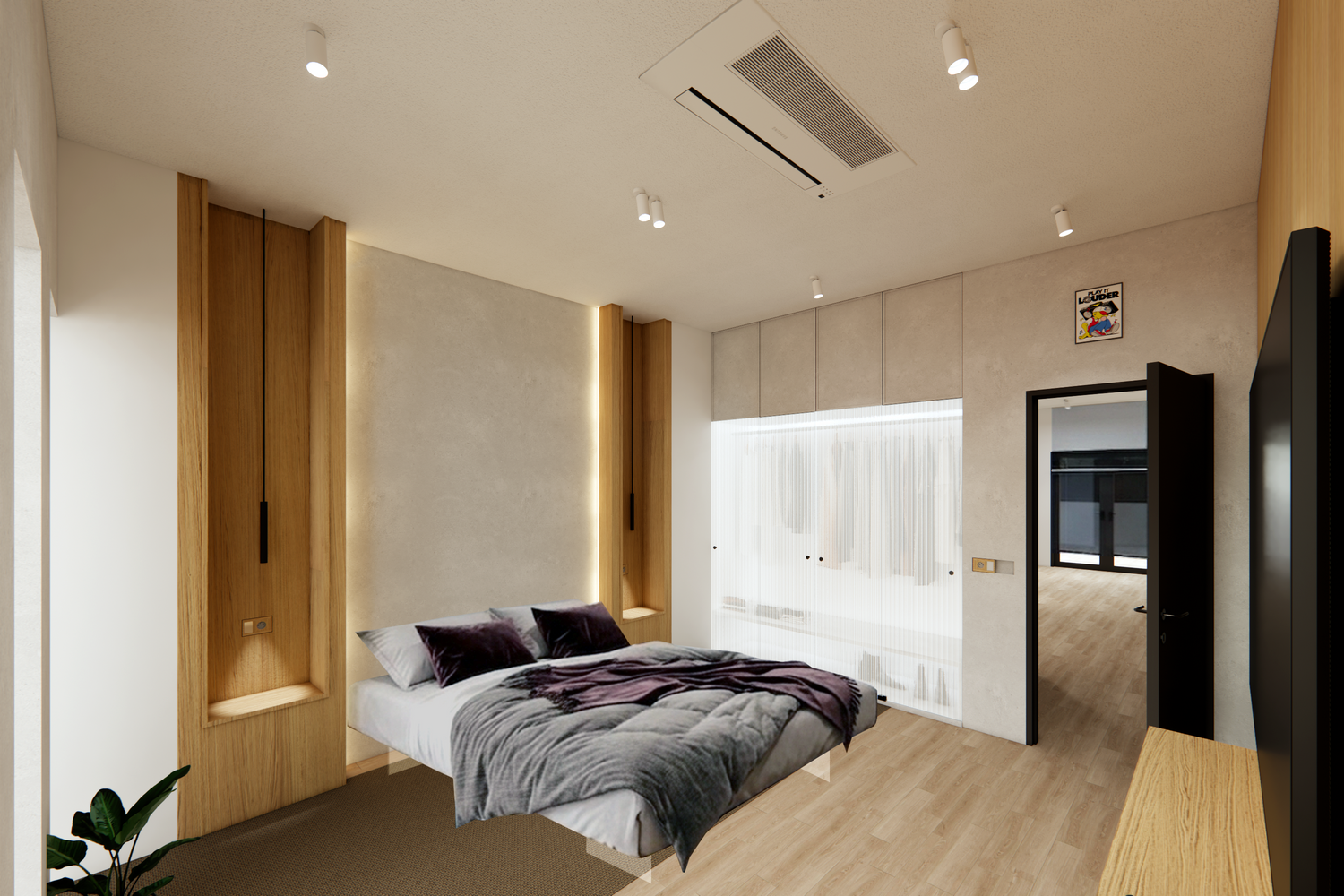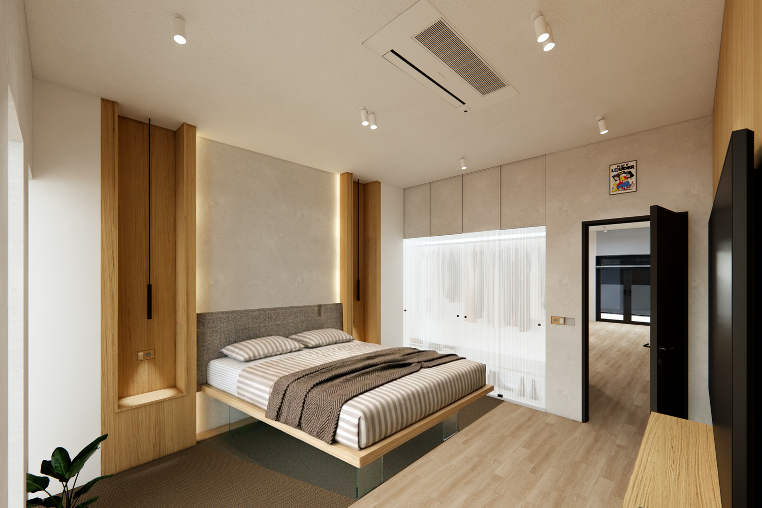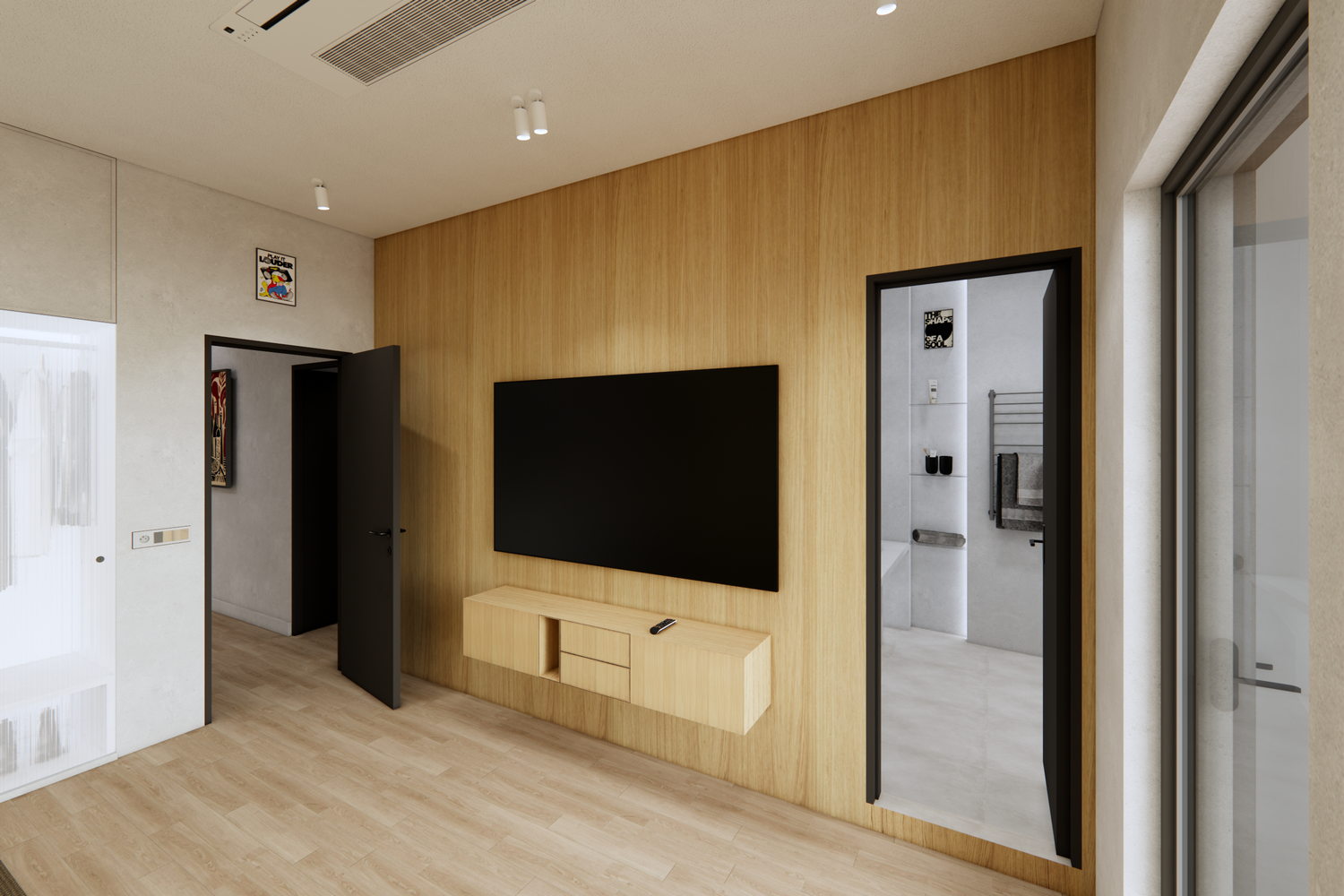Entrando, sarete accolti da un ampio spazio open space. Un tavolo da pranzo con quattro sedie è posizionato al centro. A sinistra, abbiamo progettato un armadio a muro per riporre comodamente abiti e scarpe. Una volta chiusa la porta, un grande pannello a specchio sulla destra riflette sia la luce naturale che il panorama esterno. Adiacente si trova una zona lavanderia integrata, caratterizzata da un design a scomparsa che mantiene un'estetica minimalista.