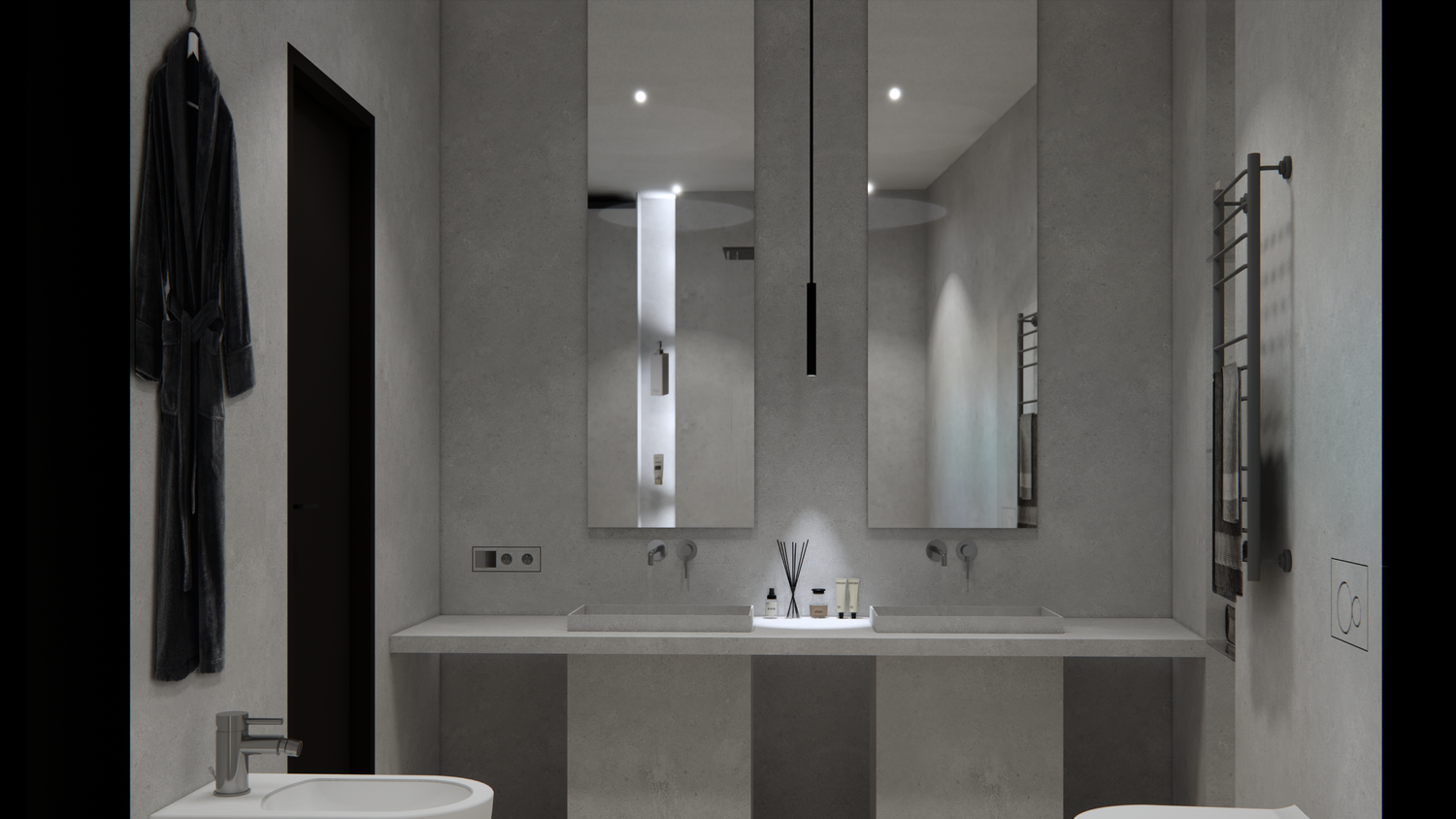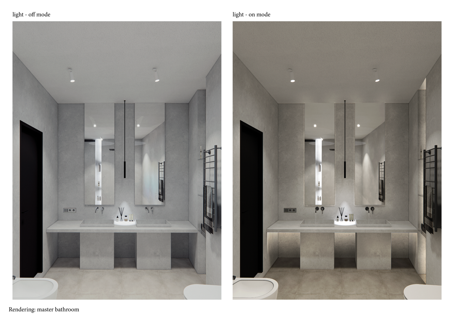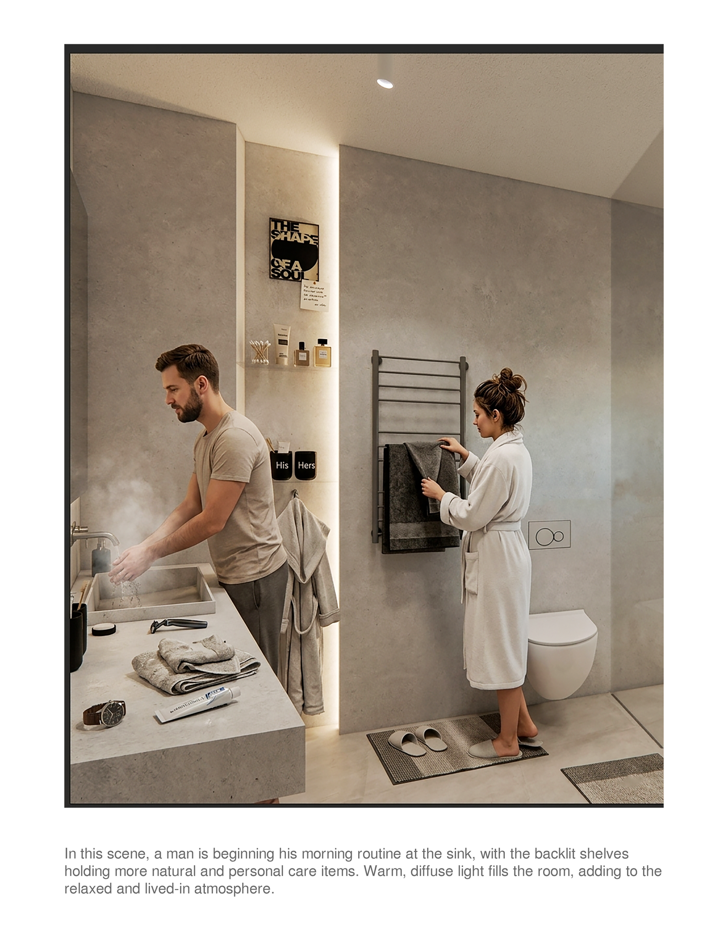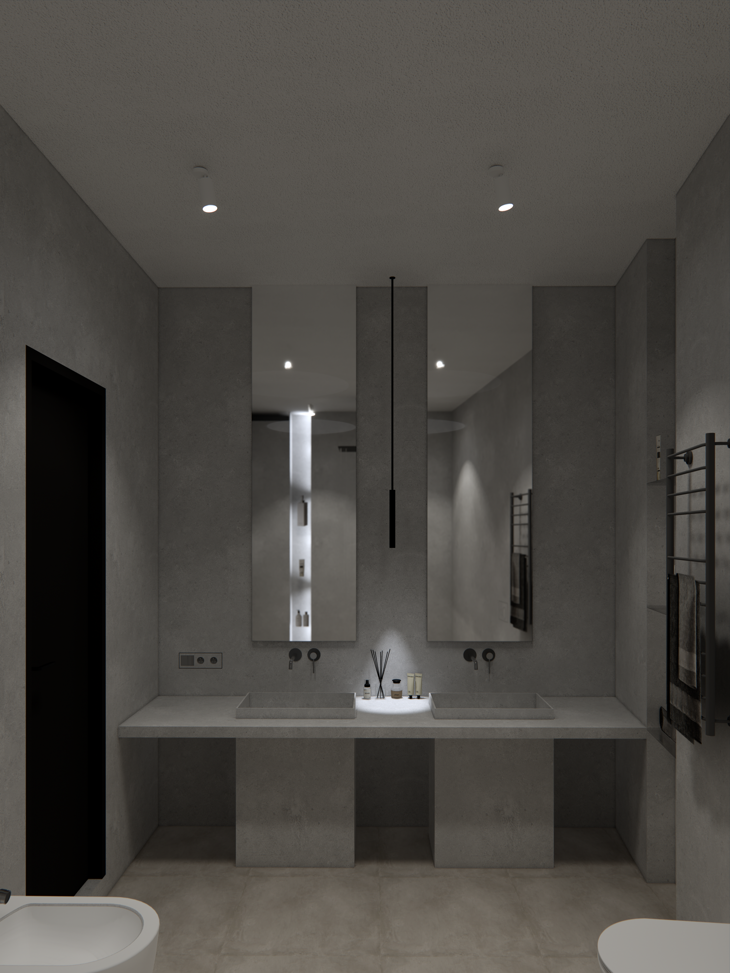 Entrando, sarete accolti da un ampio spazio open space. Un tavolo da pranzo con quattro sedie è posizionato al centro. A sinistra, abbiamo progettato un armadio a muro per riporre comodamente abiti e scarpe. Una volta chiusa la porta, un grande pannello a specchio sulla destra riflette sia la luce naturale che il panorama esterno. Adiacente si trova una zona lavanderia integrata, caratterizzata da un design a scomparsa che mantiene un'estetica minimalista.