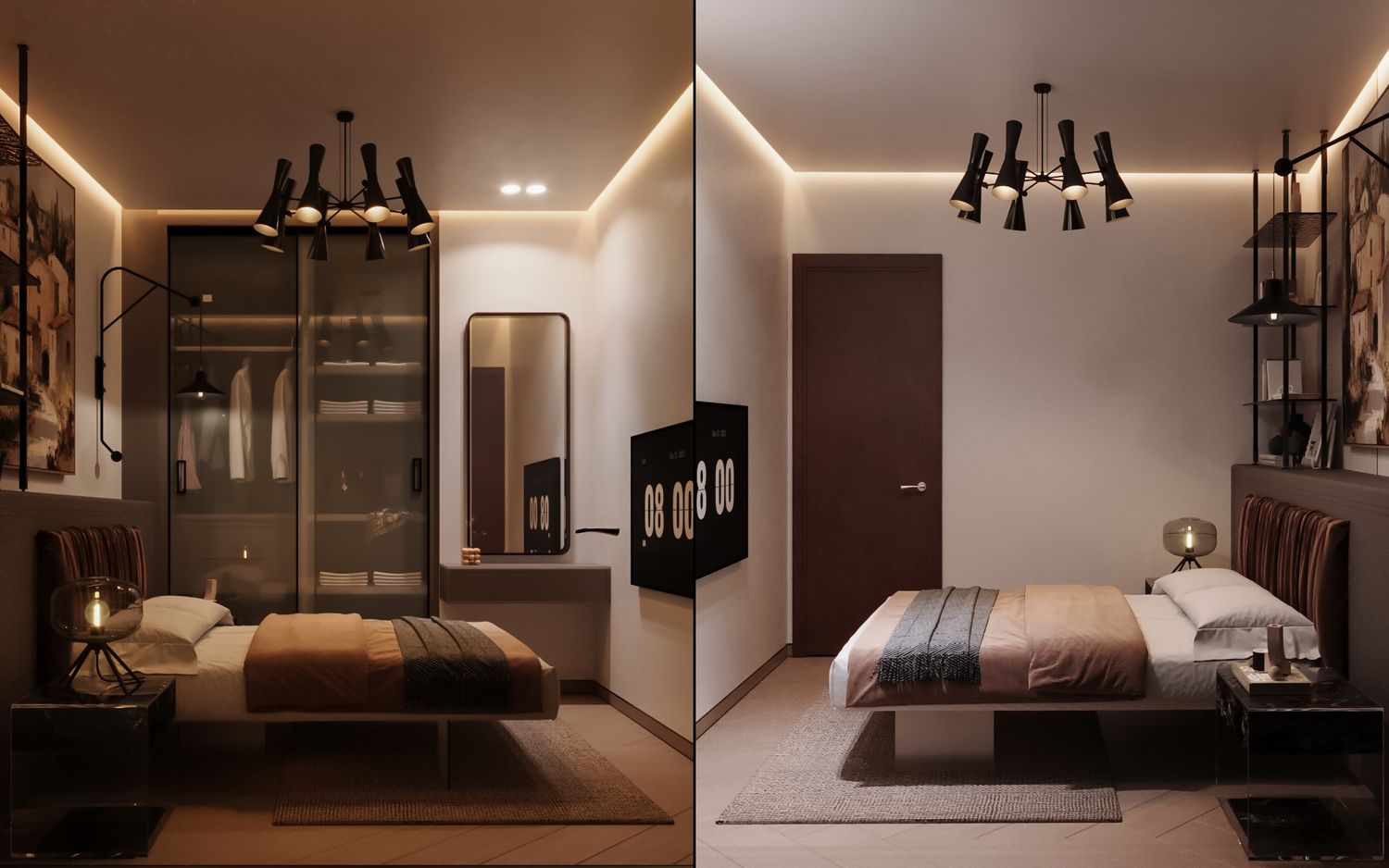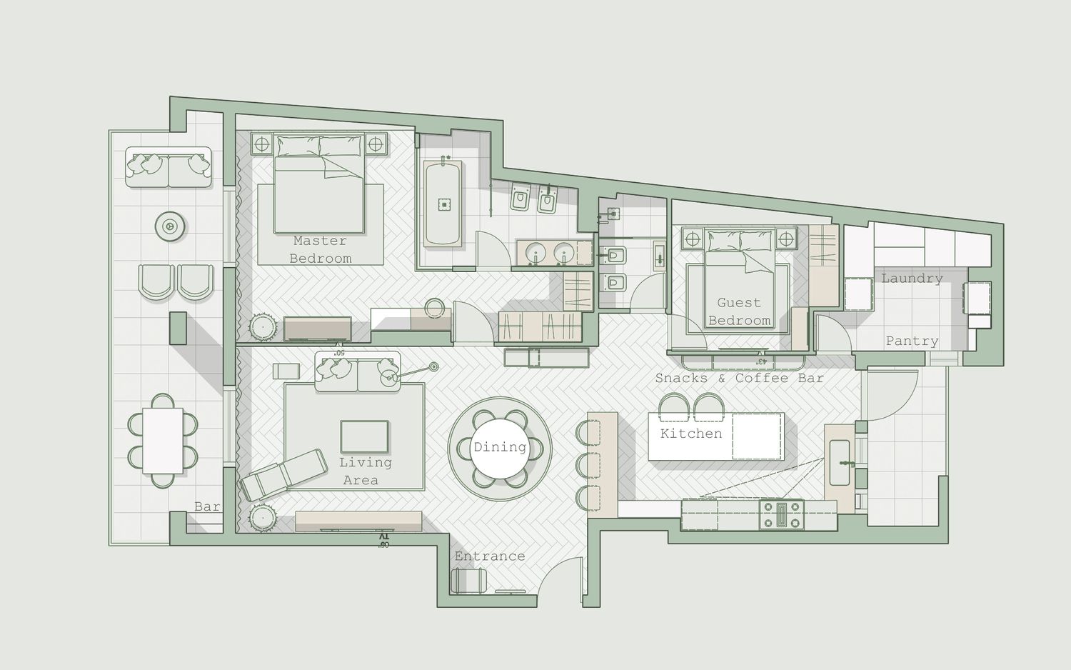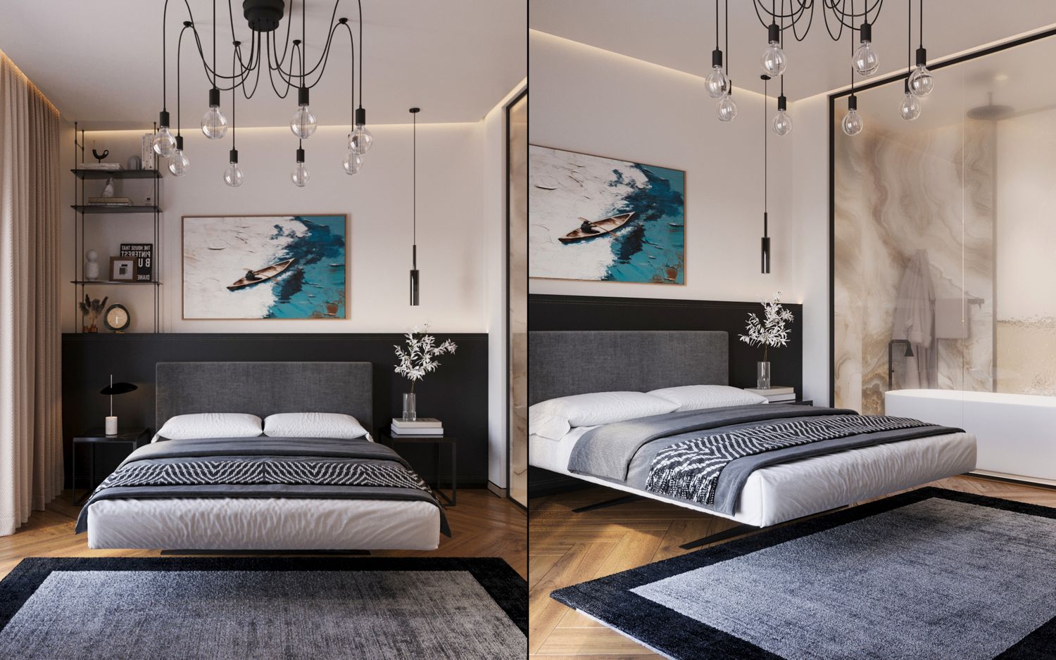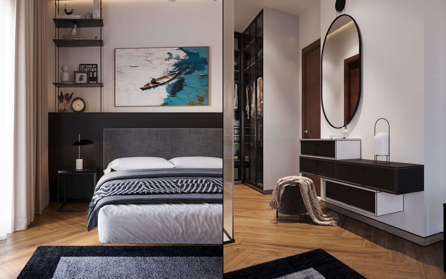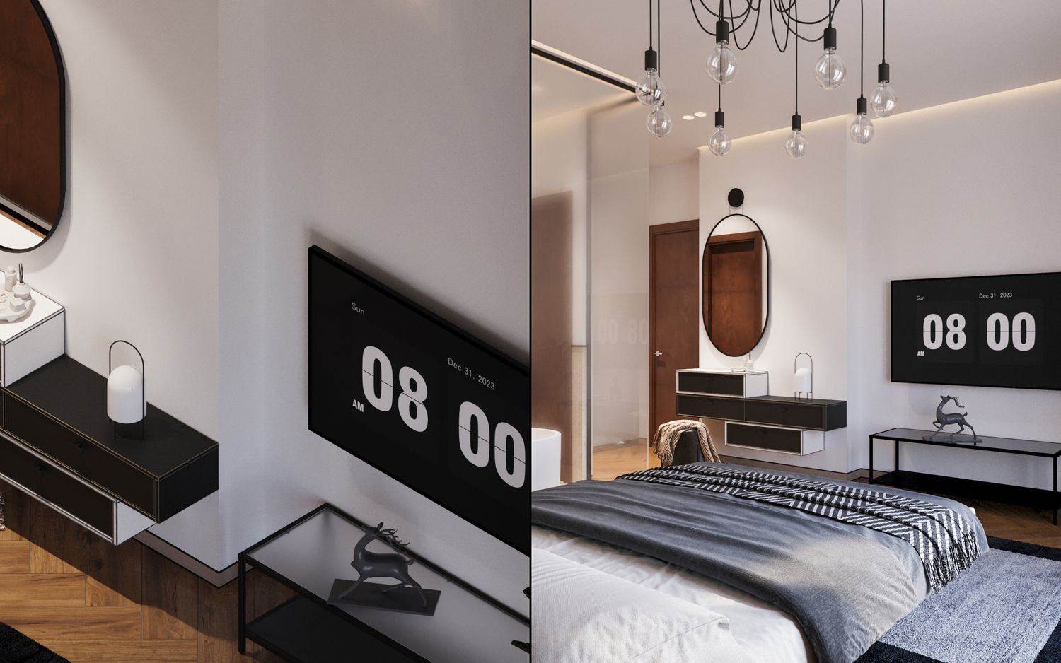 - Designed the master bedroom with user movement in mind, maintaining user privacy in the living and dining areas by directing the sightline toward a solid wall instead of the glass-walled master bathroom, similarly preventing visual interruptions.