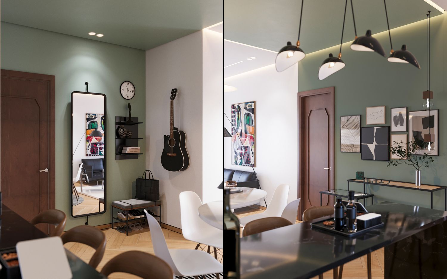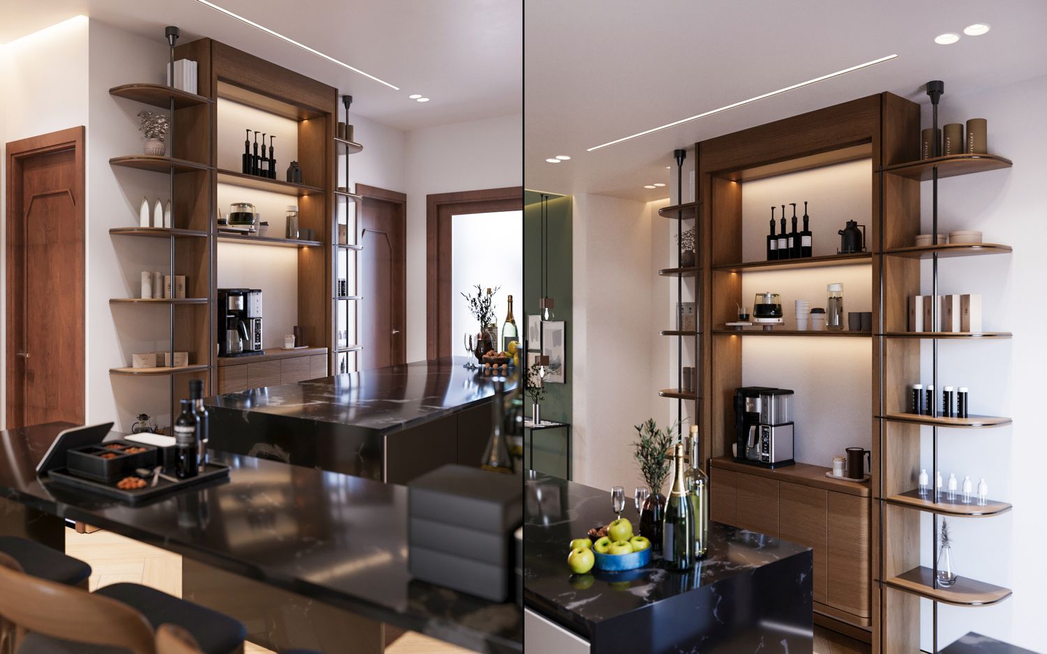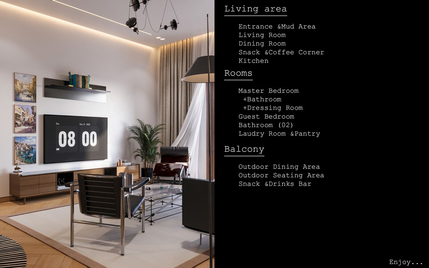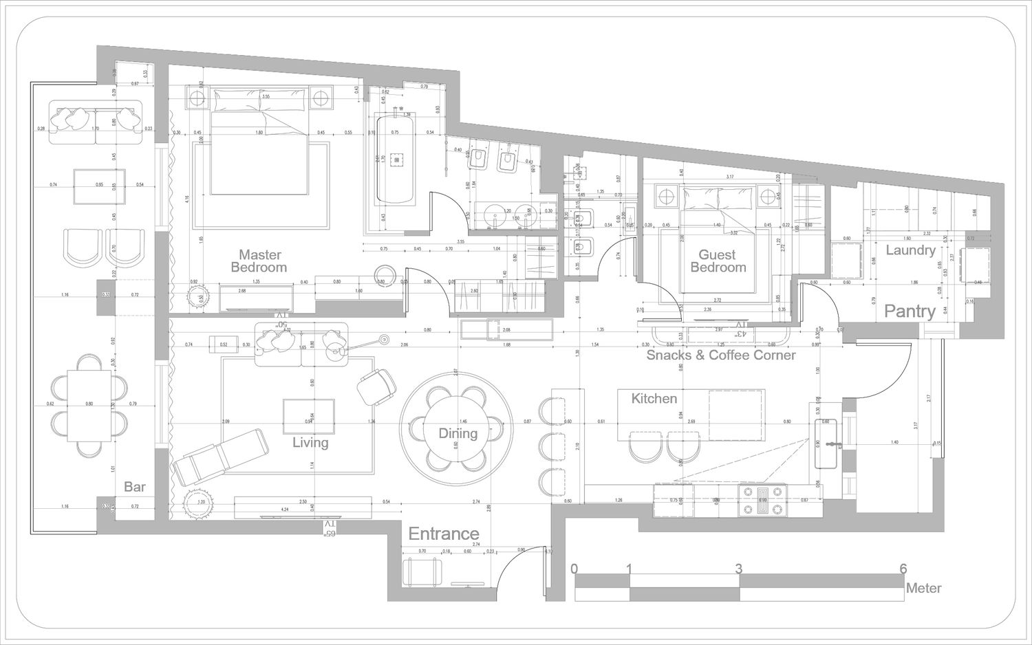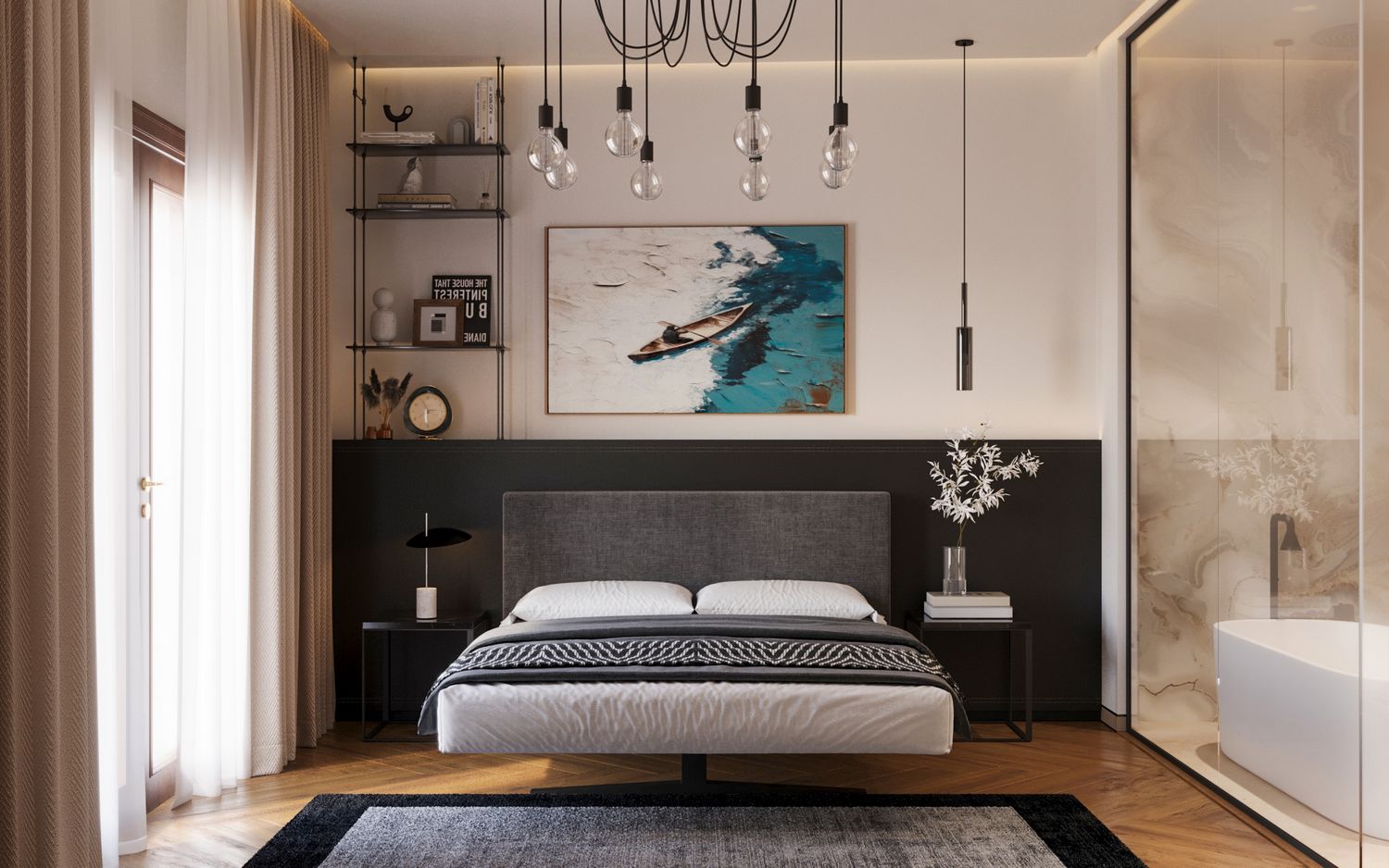- Designed the master bedroom with user movement in mind, maintaining user privacy in the living and dining areas by directing the sightline toward a solid wall instead of the glass-walled master bathroom, similarly preventing visual interruptions.