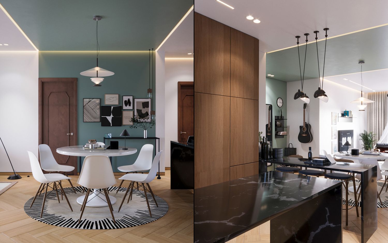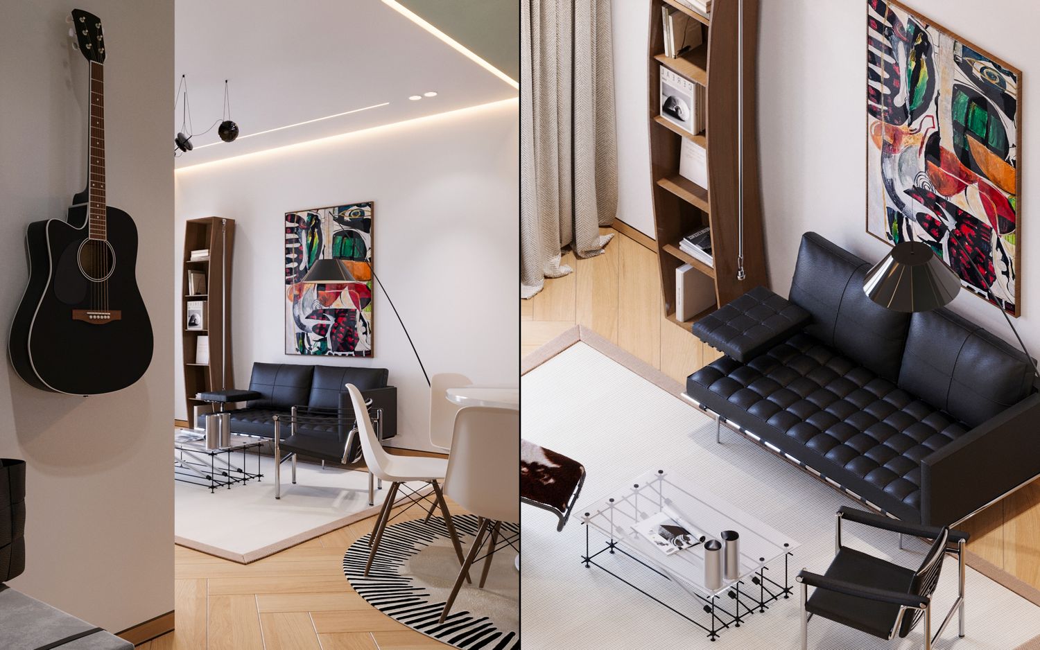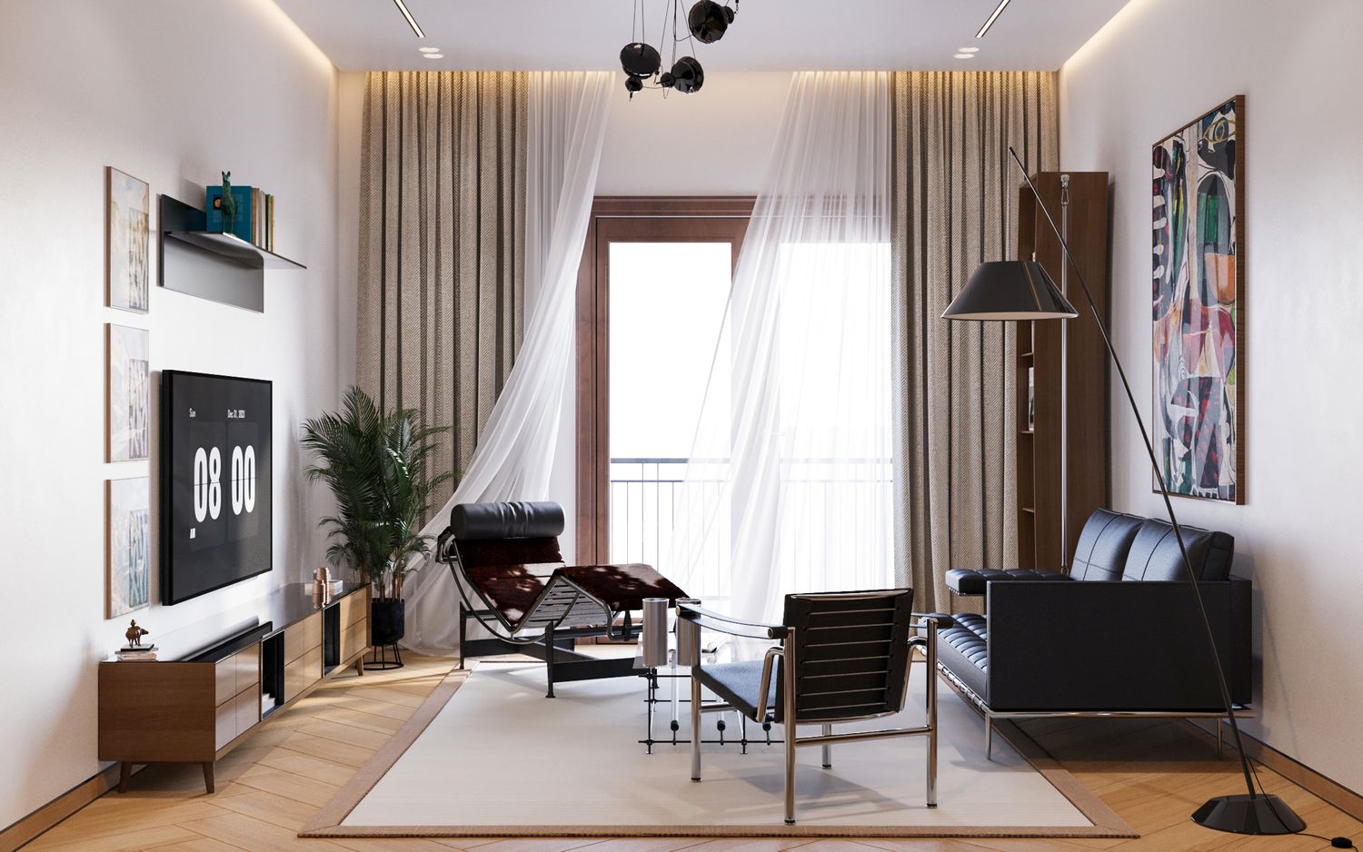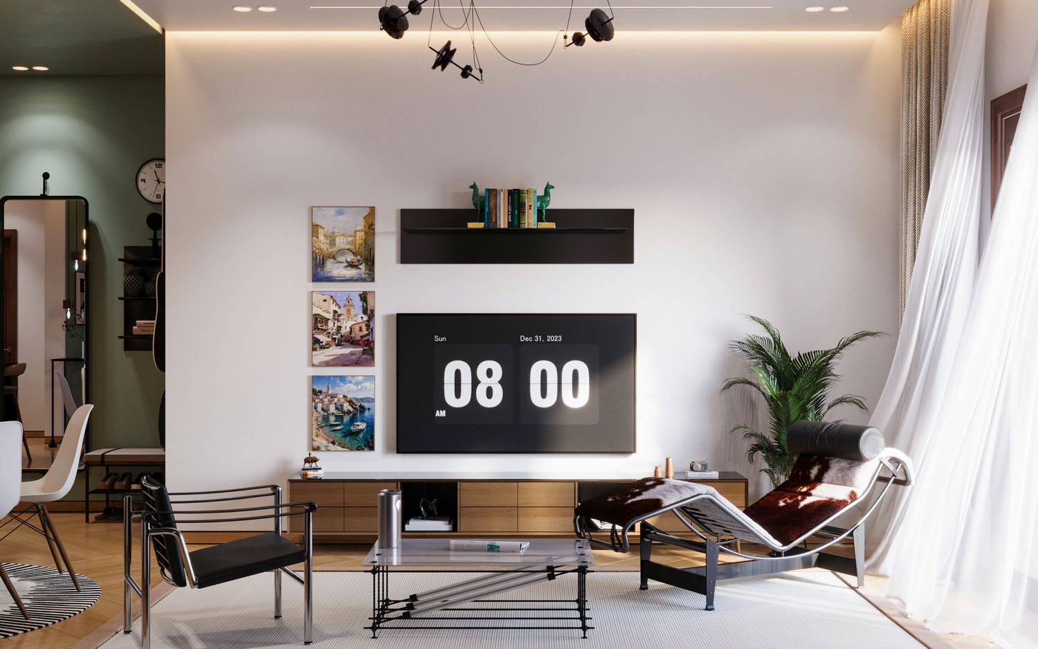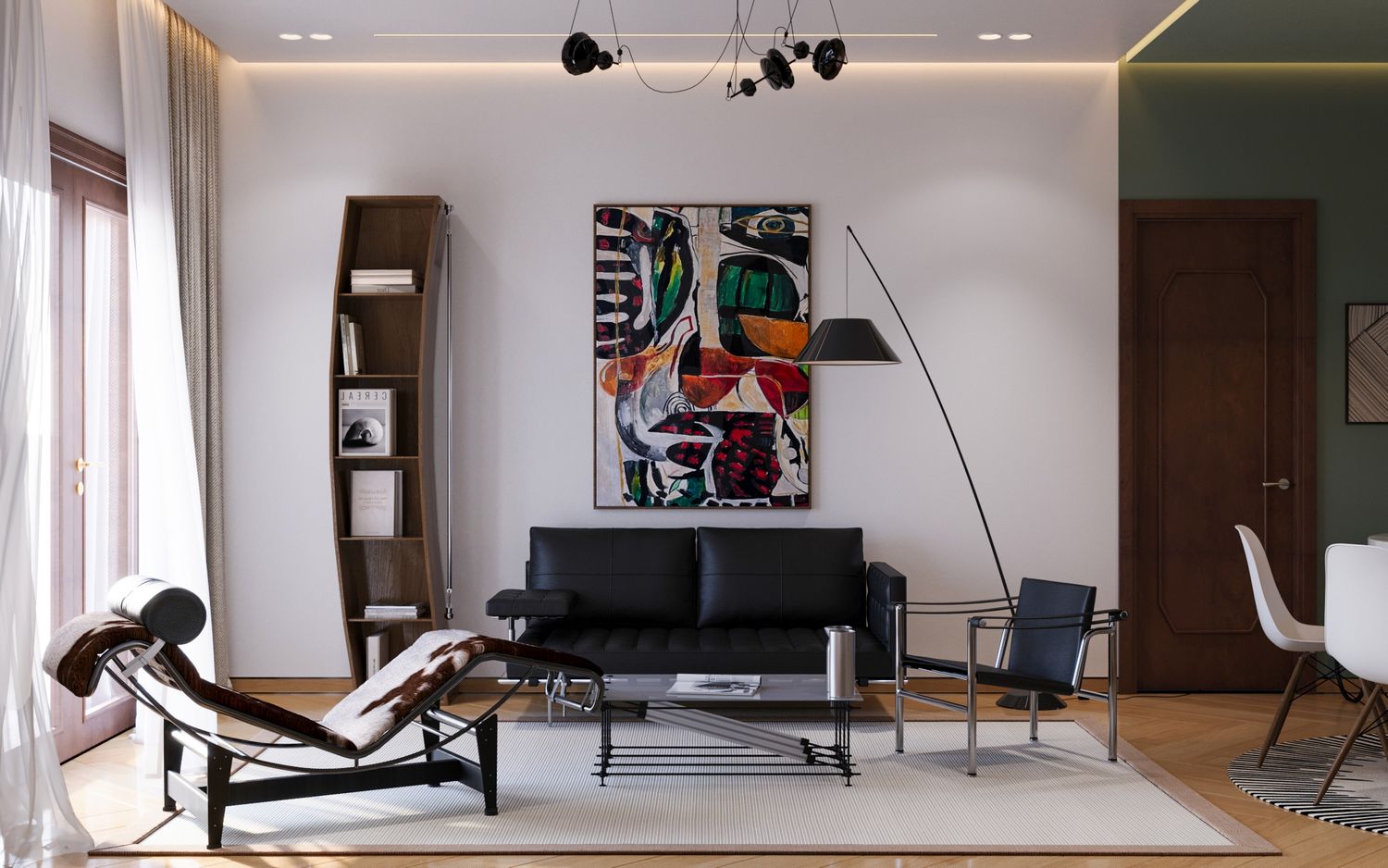 The overall aesthetic successfully blends modern with distinct vintage influences. Key statement pieces like the Cassina LC4 chaise longue and small Saarinen table infuse classic, vintage character. This juxtaposition with the sleek, modern layout, resin bathroom finishes, and integrated wooden elements creates visual depth, ensuring the apartment feels both contemporary and layered with personal history.