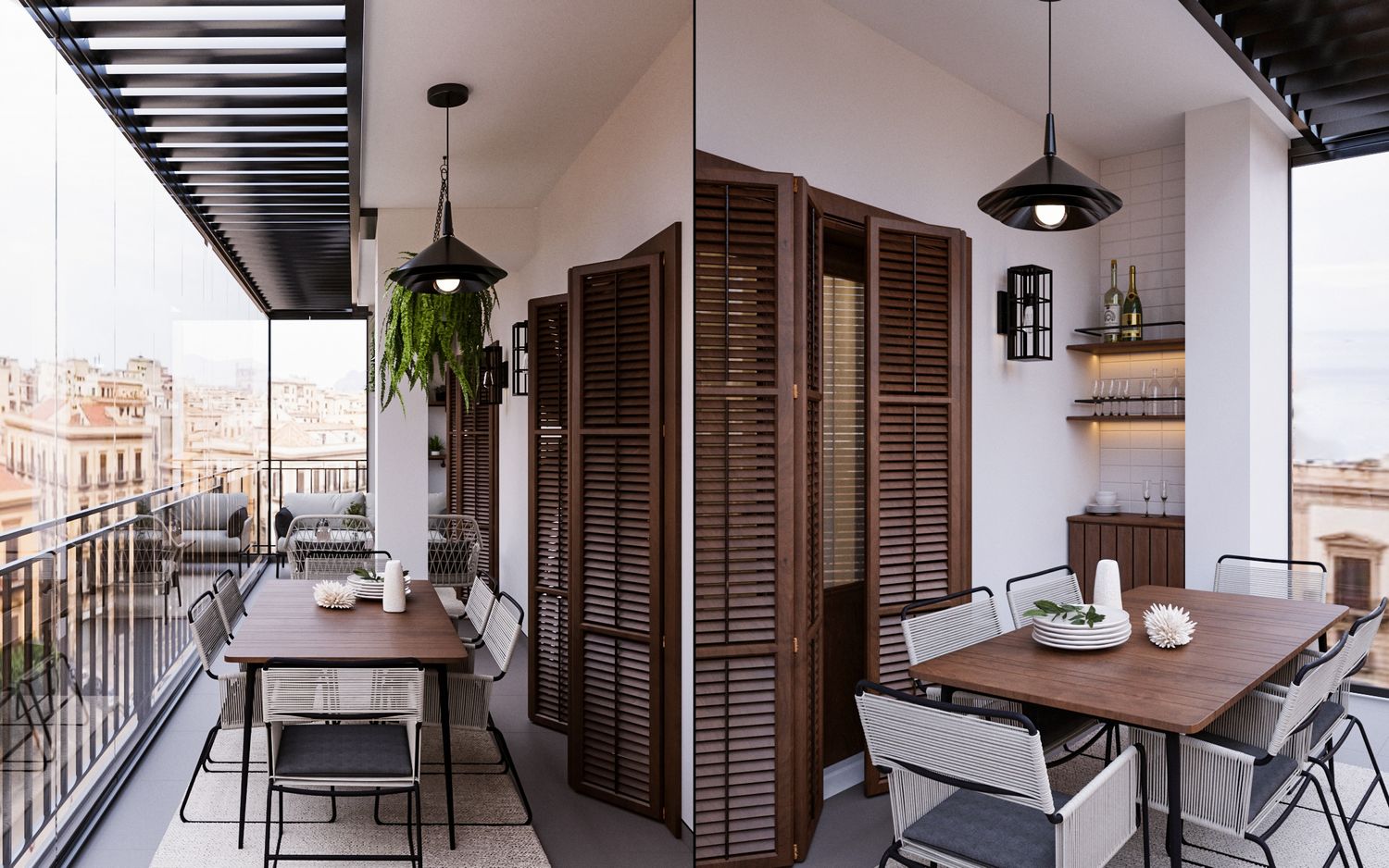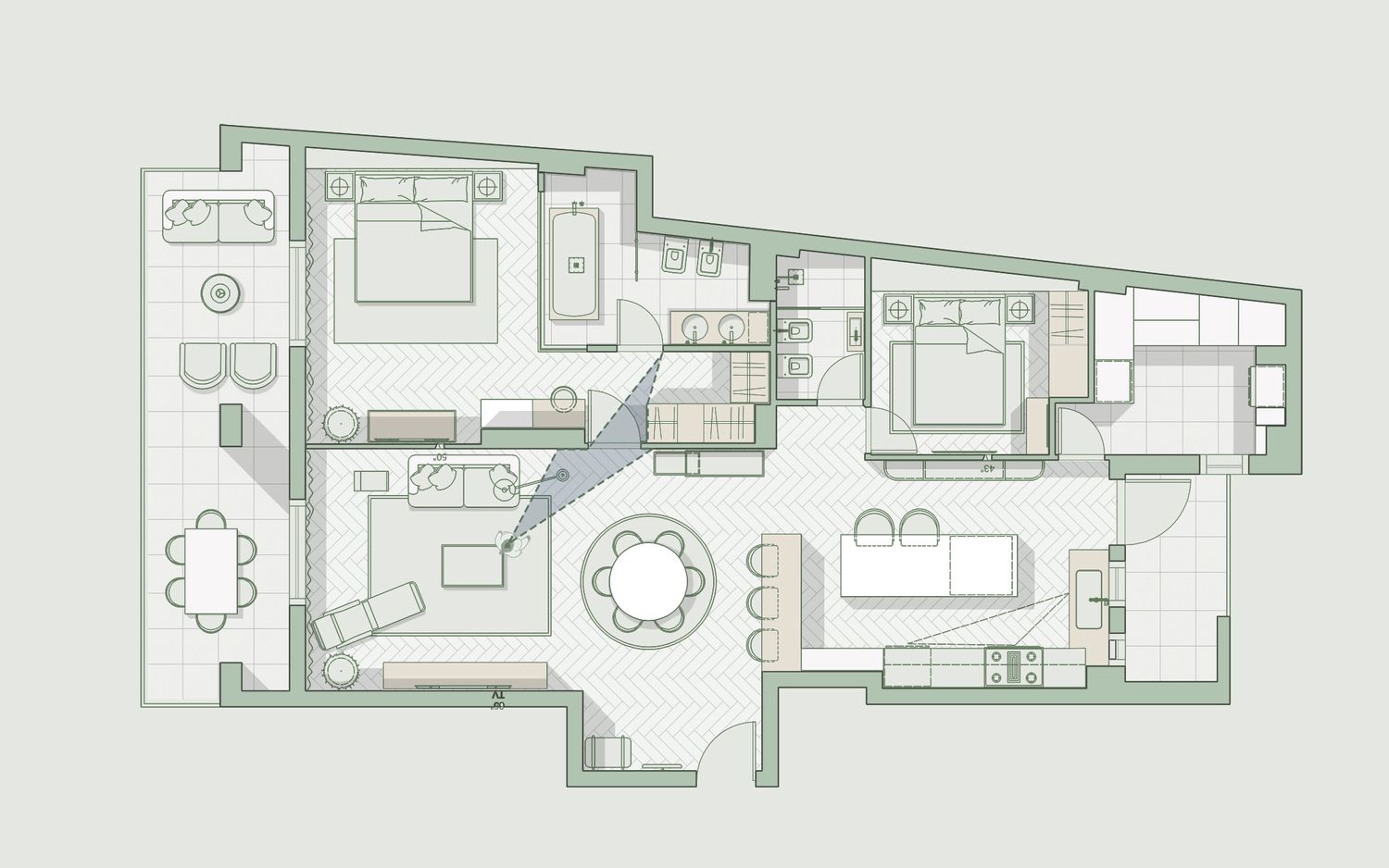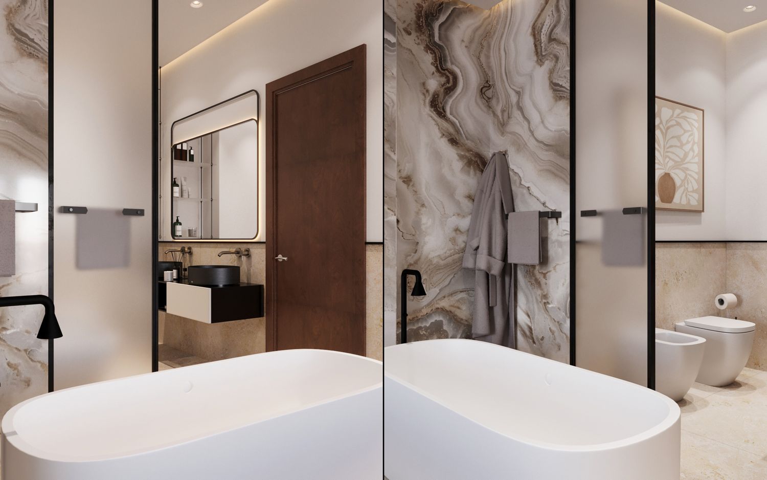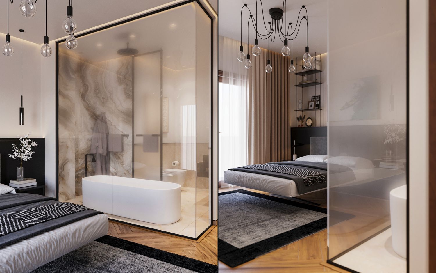 - Integrated the master bathroom with glass walls and a top directly connected to the master bedroom, which visually flows towards the terrace.