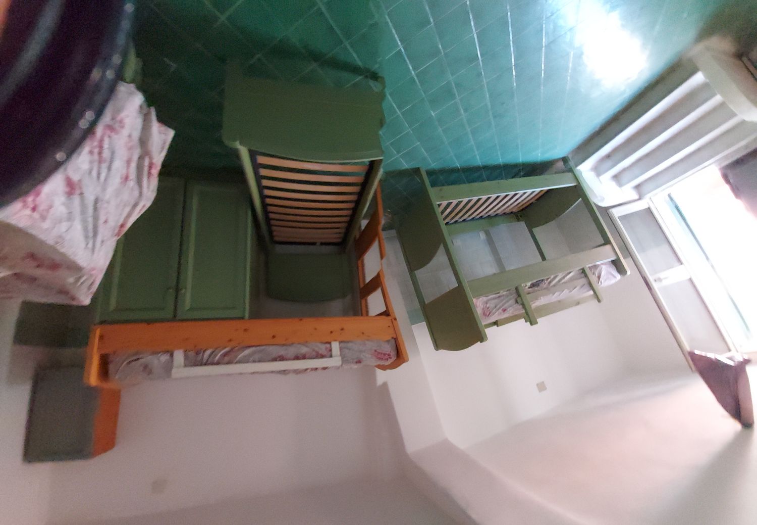 zona notte con letti/panca tipo soluzione ikea + tavolino con sedie + divano letto, armadio contenitore, una bella tenda/teatro che copre la grande finestra a mezza luna.