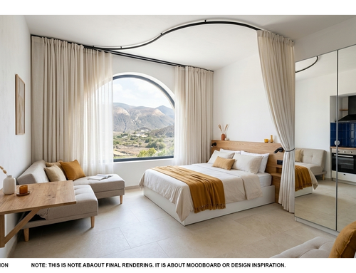 Zona de descanso con camas/banco tipo solución IKEA + mesita con sillas + sofá cama, armario contenedor y una cortina tipo teatro que cubra la gran ventana en forma de media luna.