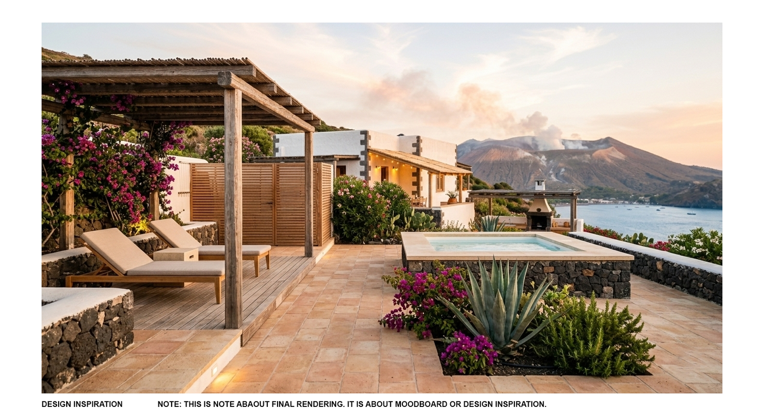 Our design concept, titled "Fuoco e Pietra" (Fire and Stone), draws from the elemental landscape of Vulcano — the raw volcanic geology, the Mediterranean light, the therapeutic sulphur springs, and the vernacular architecture of the Aeolian islands.