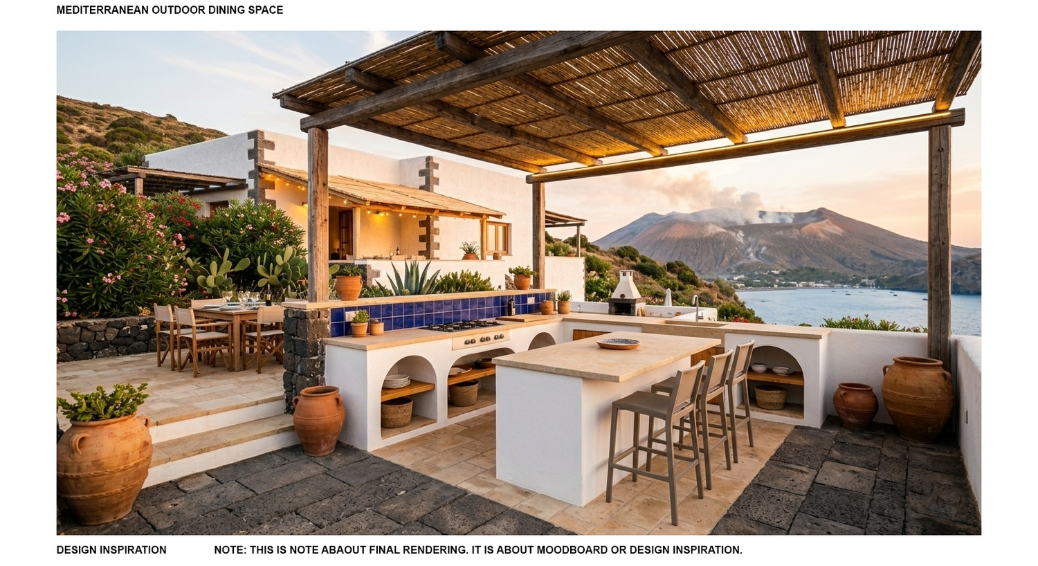 This architectural design proposal presents a comprehensive renovation strategy for Villa Catenesi, a multi-unit residential property situated on the volcanic island of Vulcano in the Aeolian archipelago. The villa occupies a privileged position with direct sightlines to the active volcano — a defining characteristic that shapes our entire design philosophy.