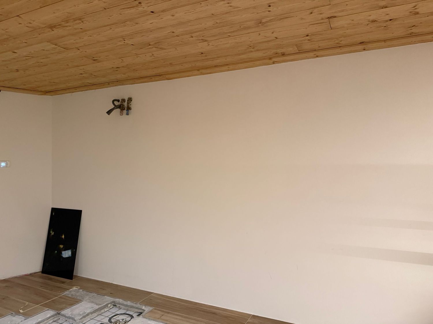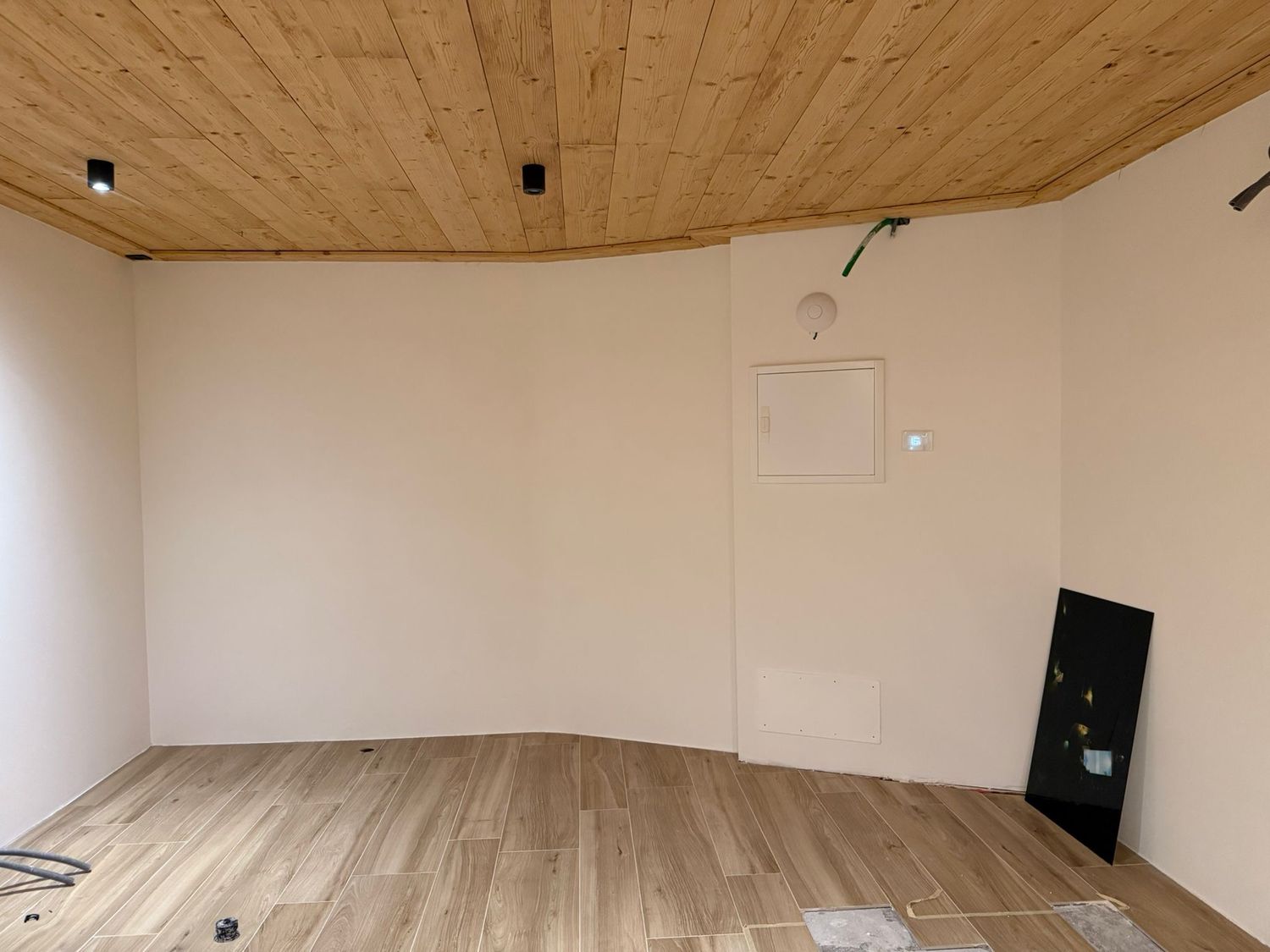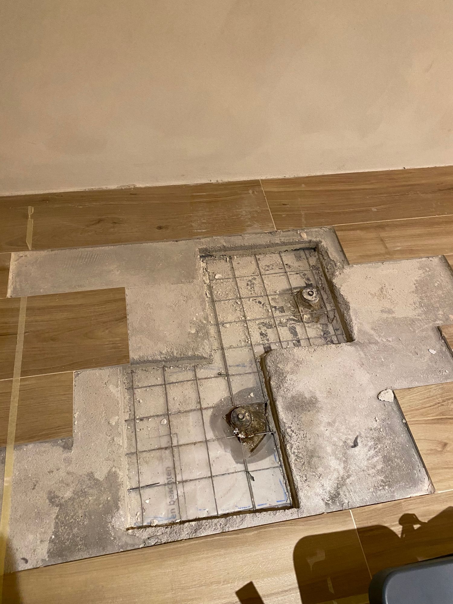 Some connections are already in place, such as water supply, electrical outlets, and drains. The room also has underfloor heating, therefore any demolition of the flooring is not possible.