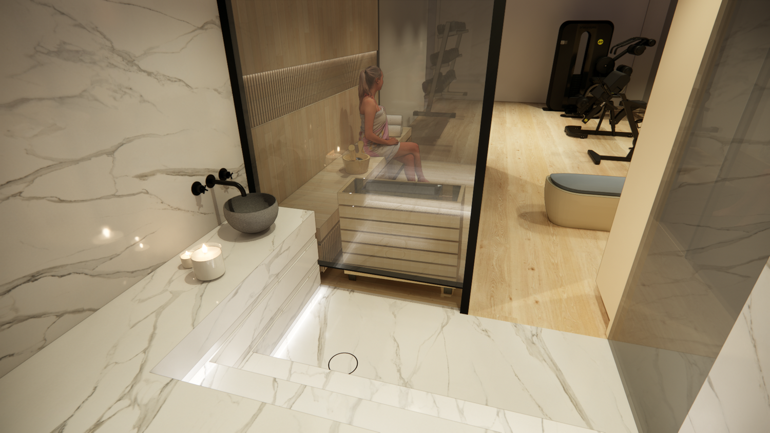 A glass door separates the sauna, Turkish bath, and sanitary area from the kitchenette and gym, providing visual connection while maintaining humidity control. The sauna itself is fully enclosed with glass walls, creating a modern and open atmosphere.