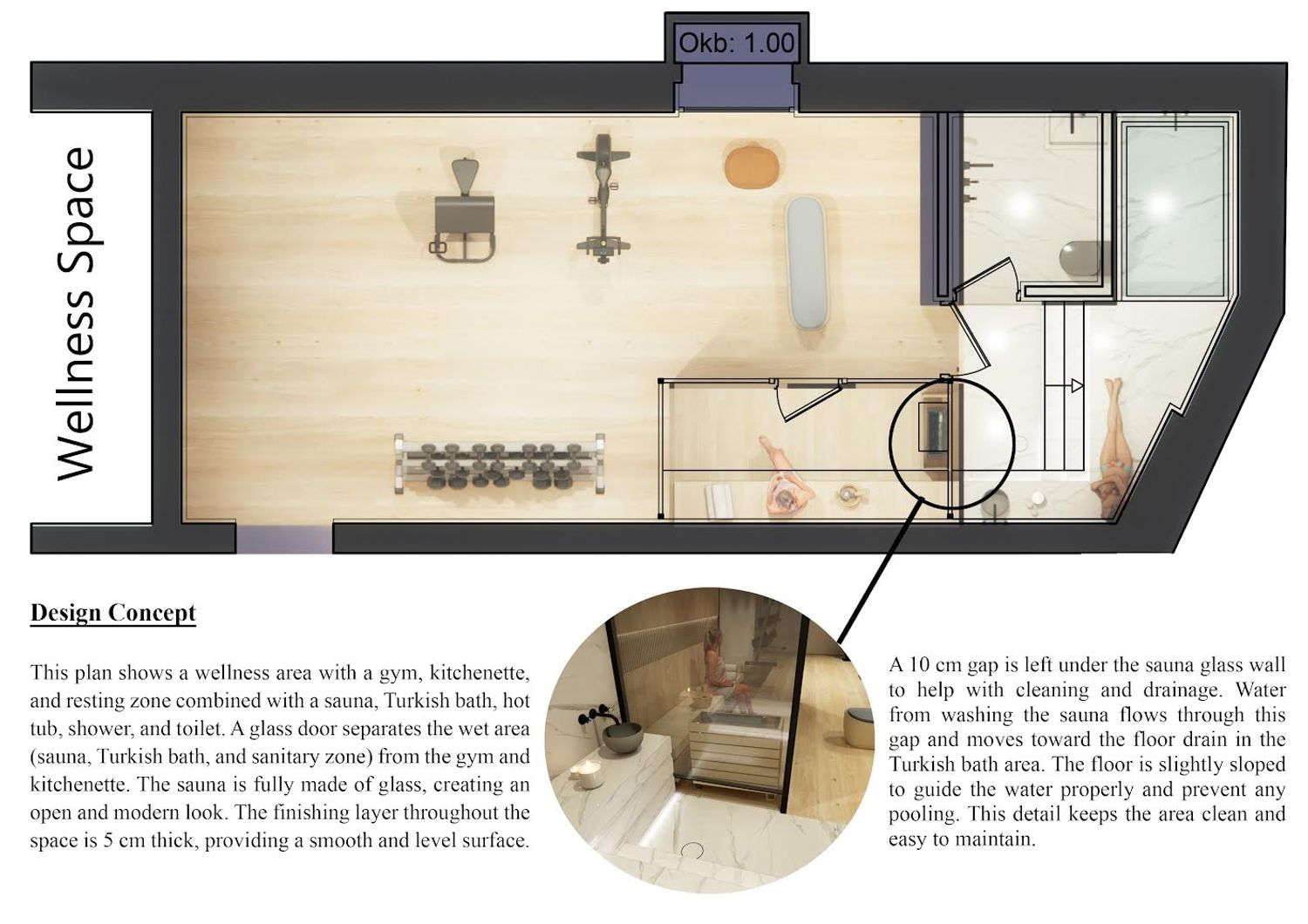 The finishing layer throughout the space has a thickness of 5 cm, ensuring a uniform floor level and proper installation of utilities and drainage systems. The design emphasizes comfort, functionality, and visual continuity across all zones.