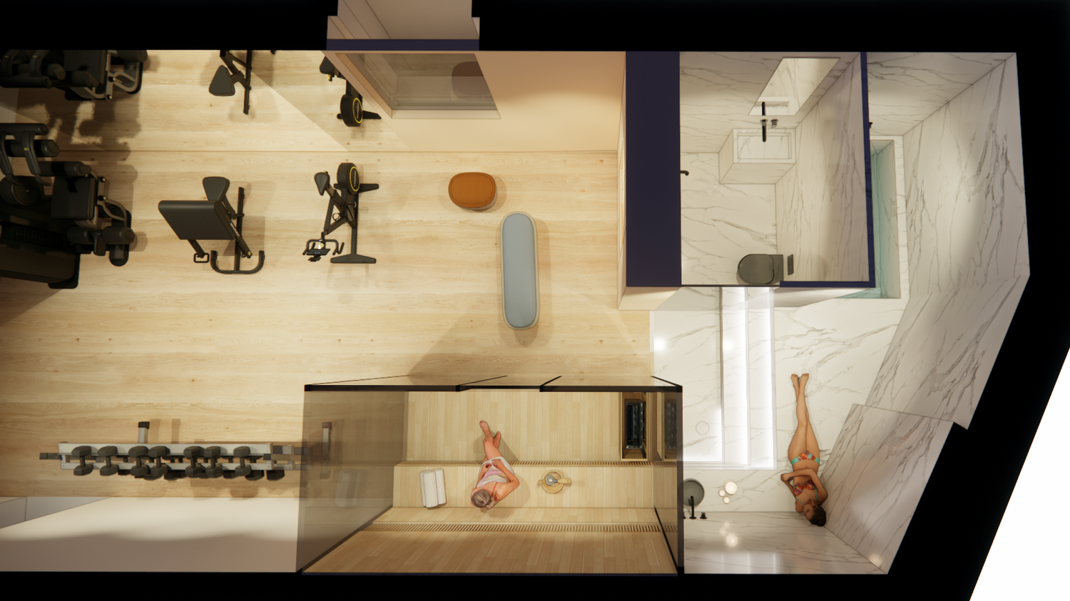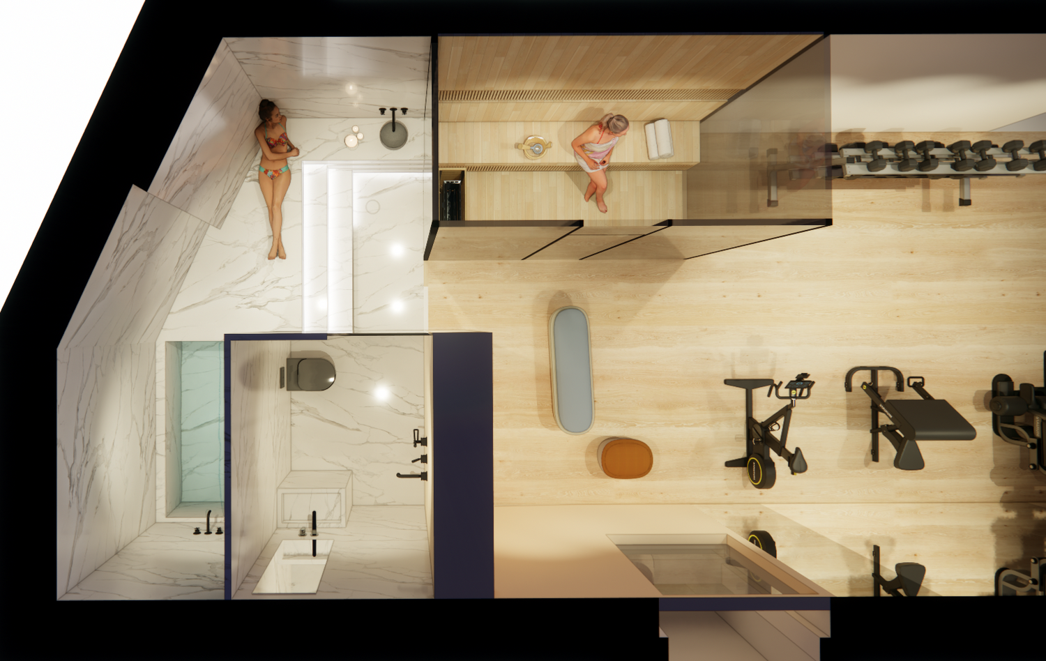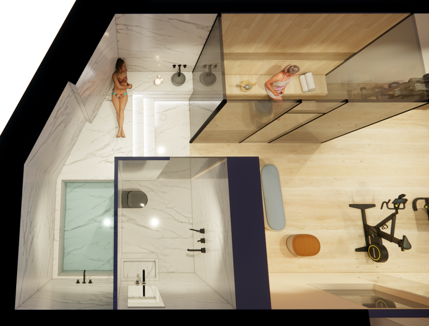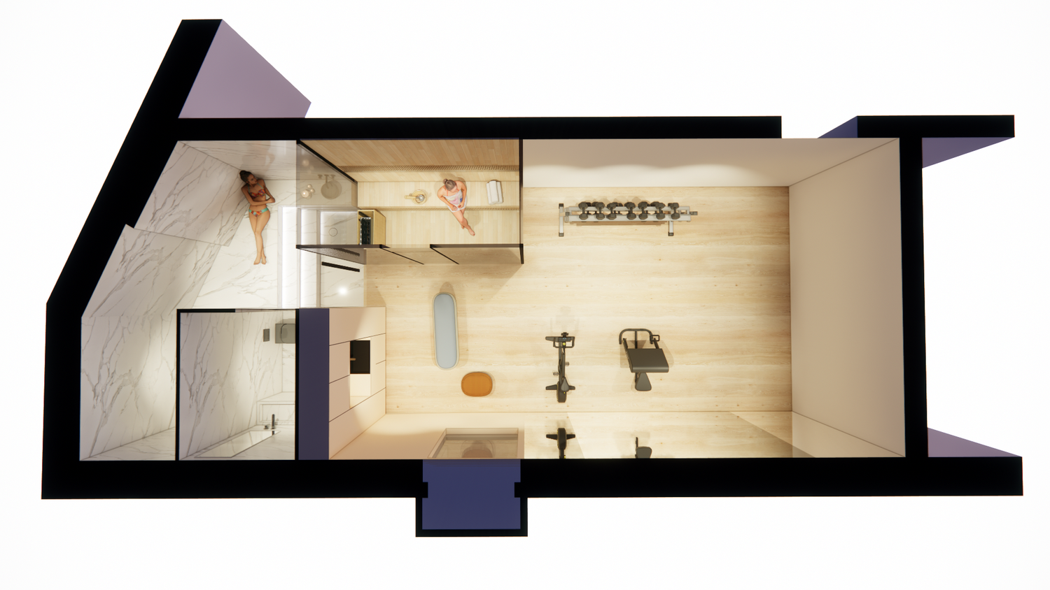 This plan represents a wellness area that combines several functions in one continuous space. It includes a gym equipped with exercise machines and free weights, a kitchenette, and a resting area. The wellness zone also features a sauna, a Turkish bath, a hot tub, a shower, and a toilet.