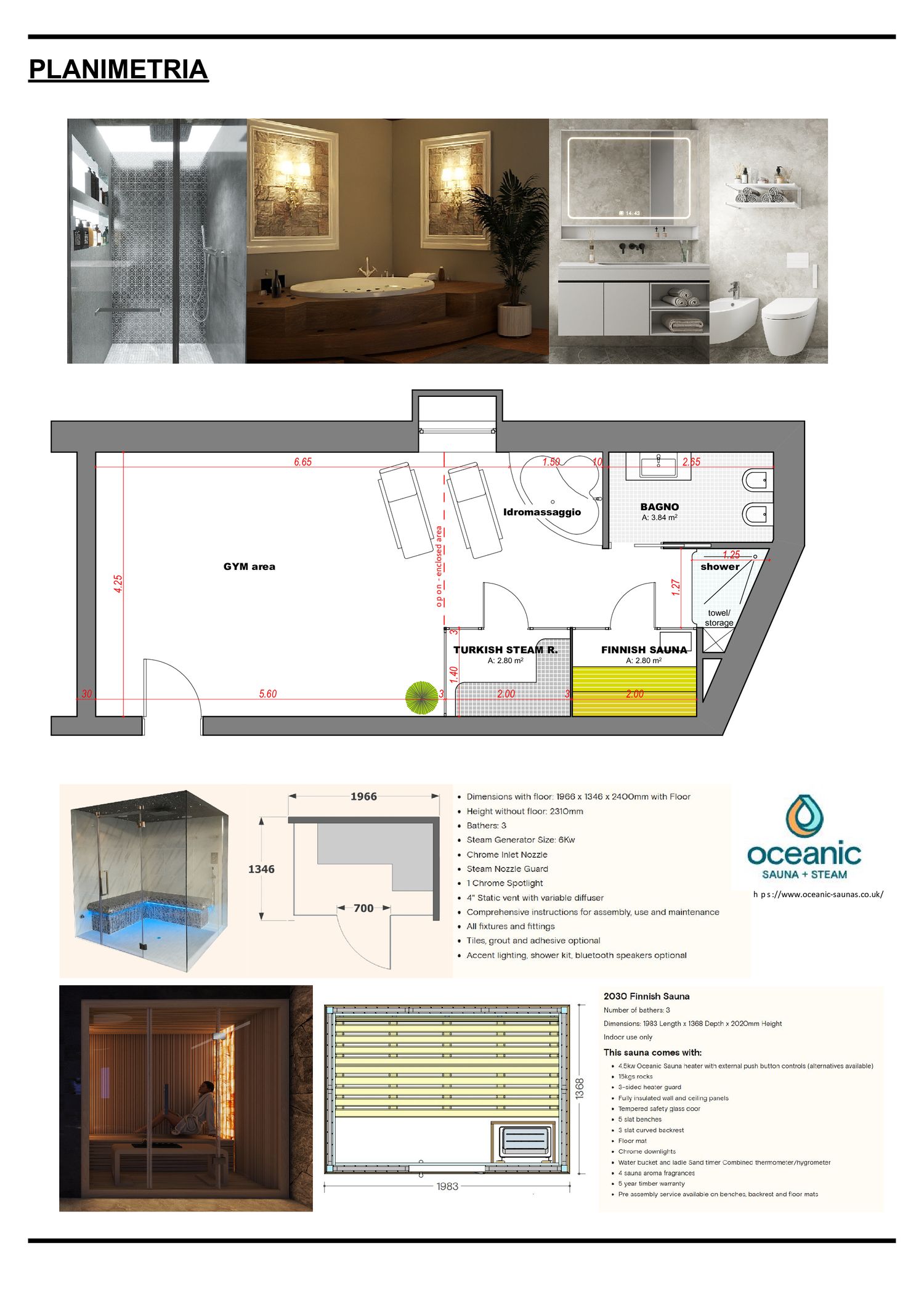 Il progetto prevede la realizzazione di una zona wellness completa di vasca idromassaggio, sauna finlandese, bagno turco, bagno e doccia.