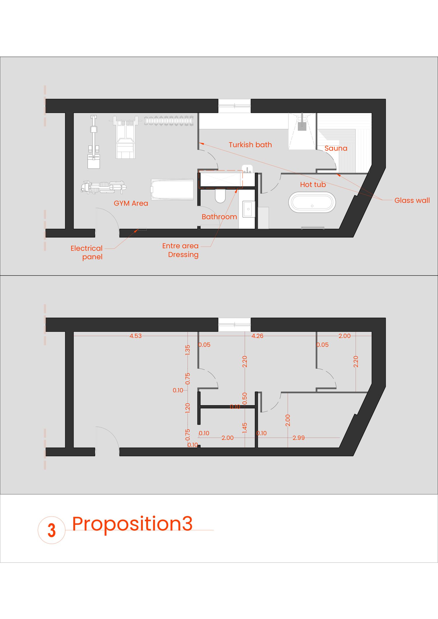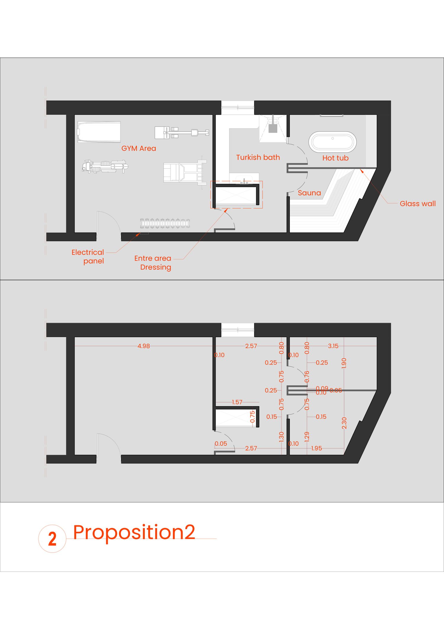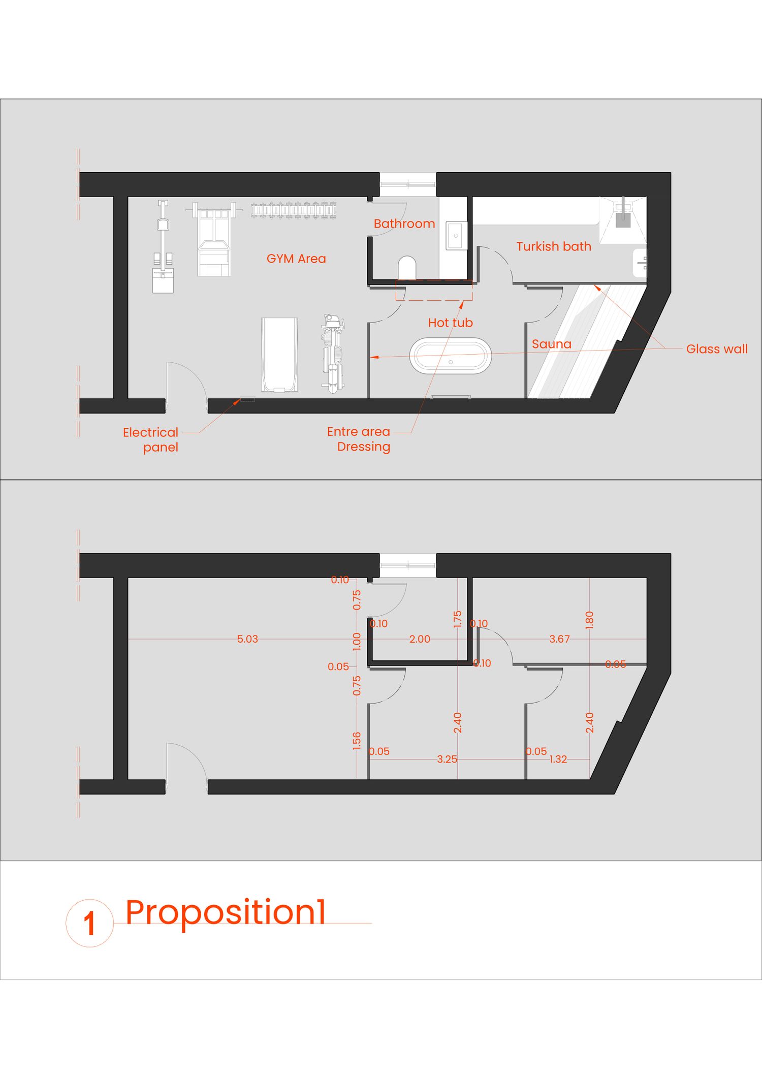 The project aims to transform a single space into two complementary zones: a gym area and a wellness area.