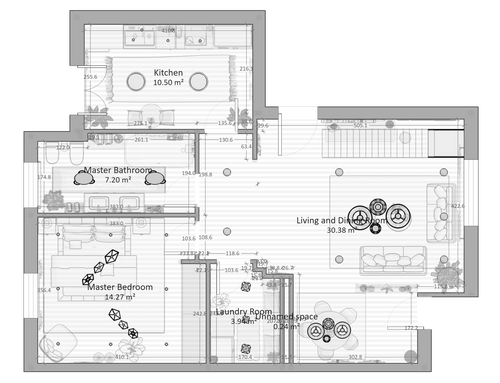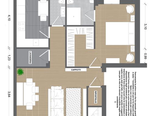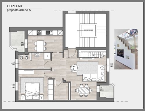 Mi piacerebbe avere un progetto che mi permetta di posizionare in maniera ottimale i classici elementi di arredo di una zona giorno: divano, TV (tra i 50 e 65 pollici), tavolo con sedie.