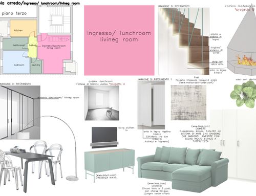 Nelle immagini di riferimento, ci sono foto di arredo già in nostro possesso (tavolo, sedie e lampada), tutto il resto è da acquistare.