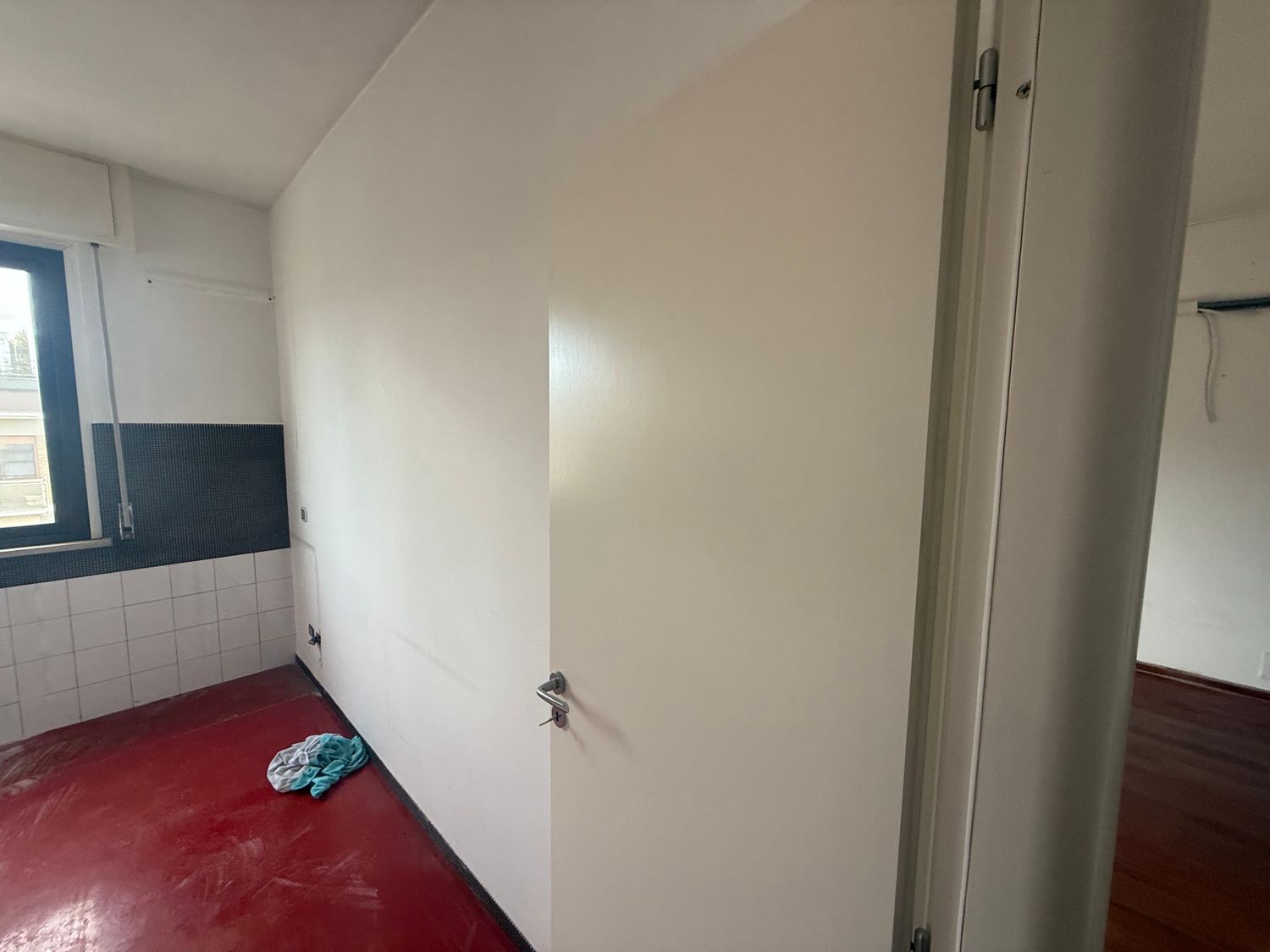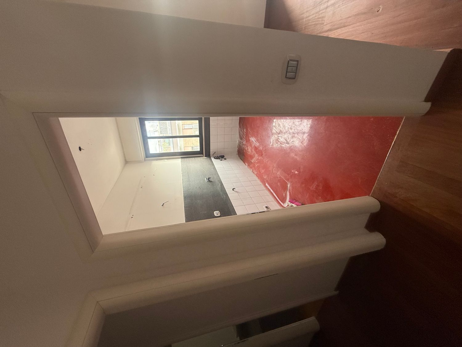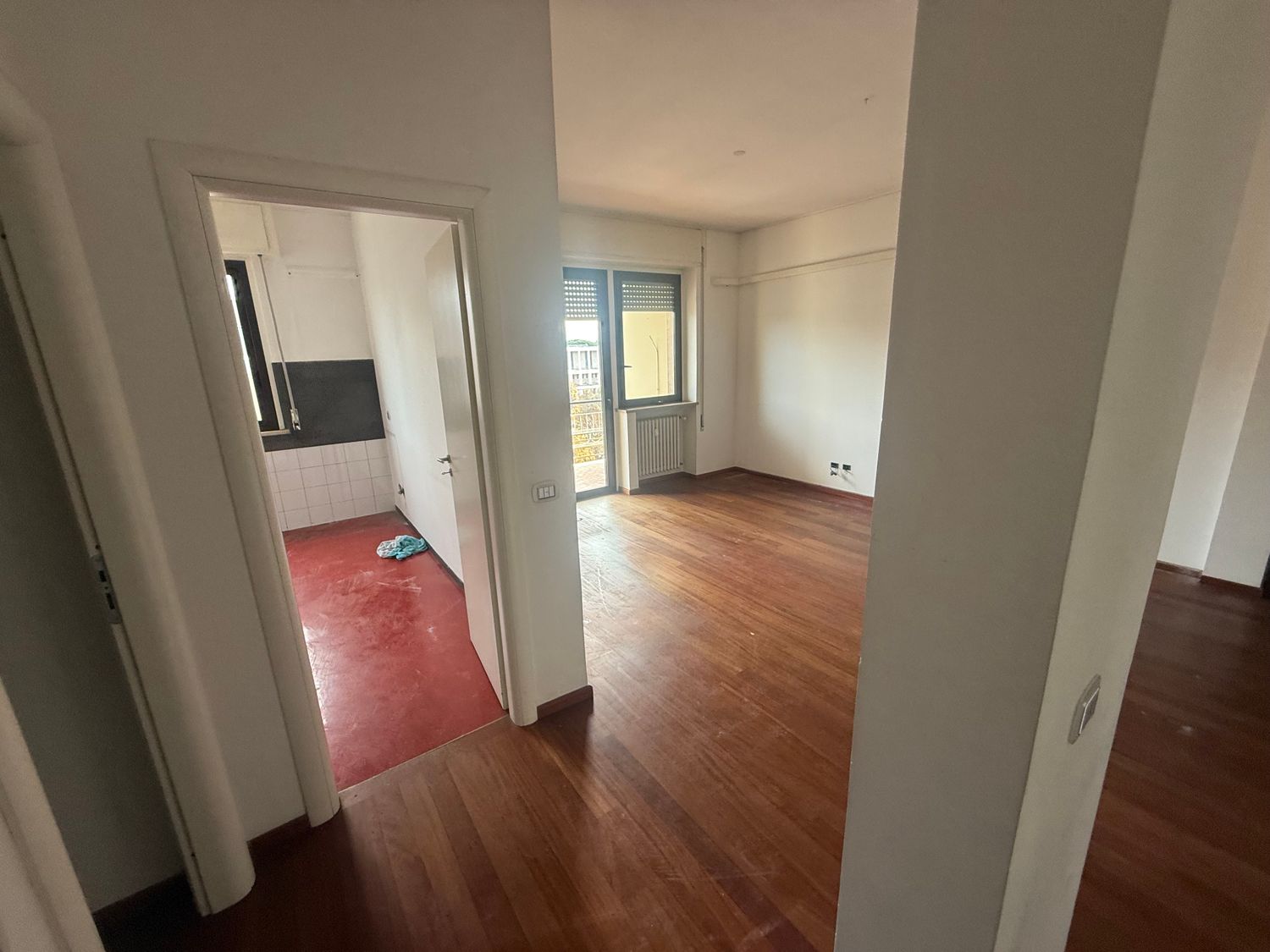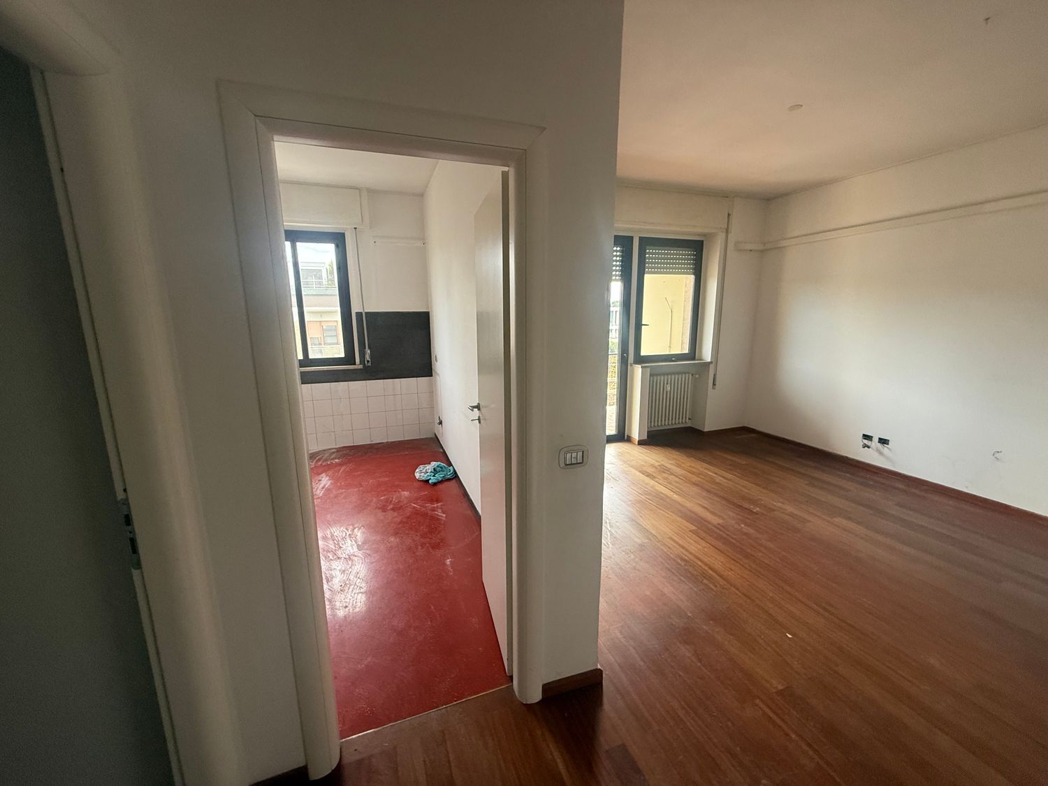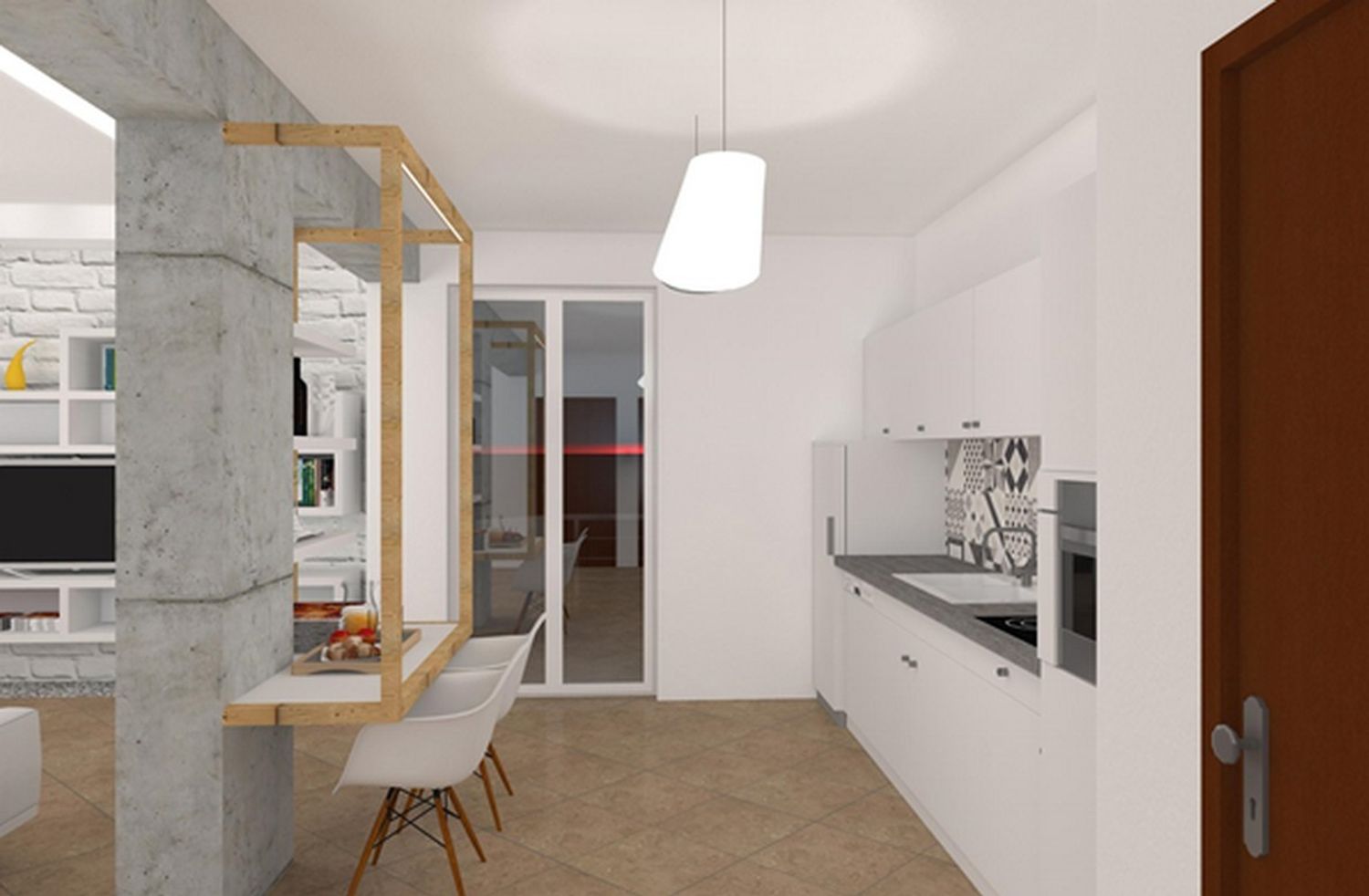 I want to furnish the kitchen and living room by creating permeability between the two spaces without demolishing the entire dividing wall, but rather with an opening, an internal window, or a glass partition in the wall, so that the flooring (red resin in the kitchen and wood in the living room) can remain different.