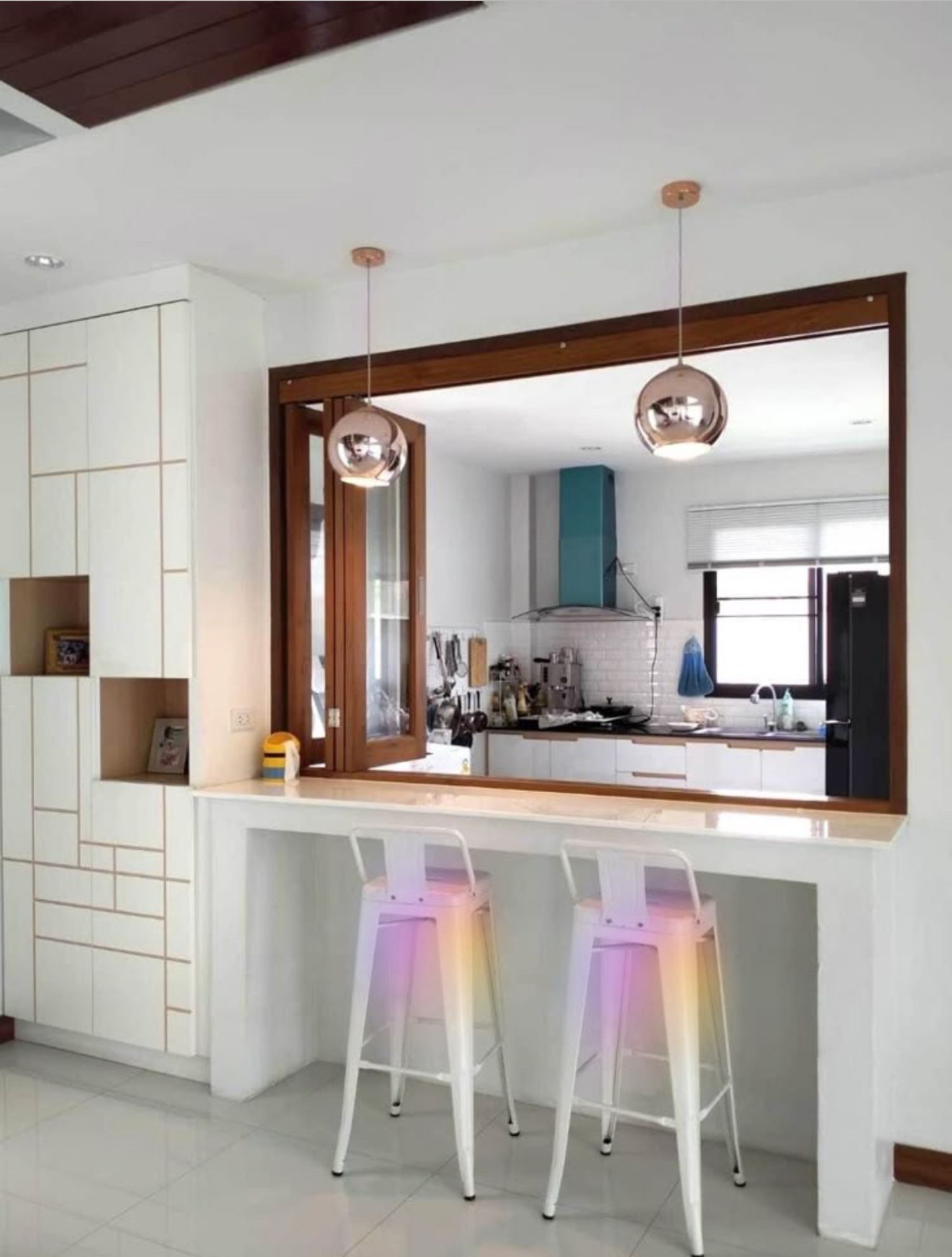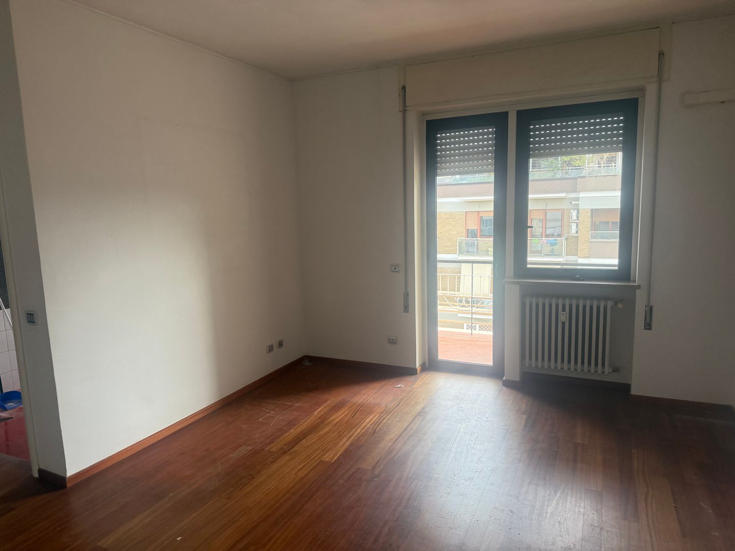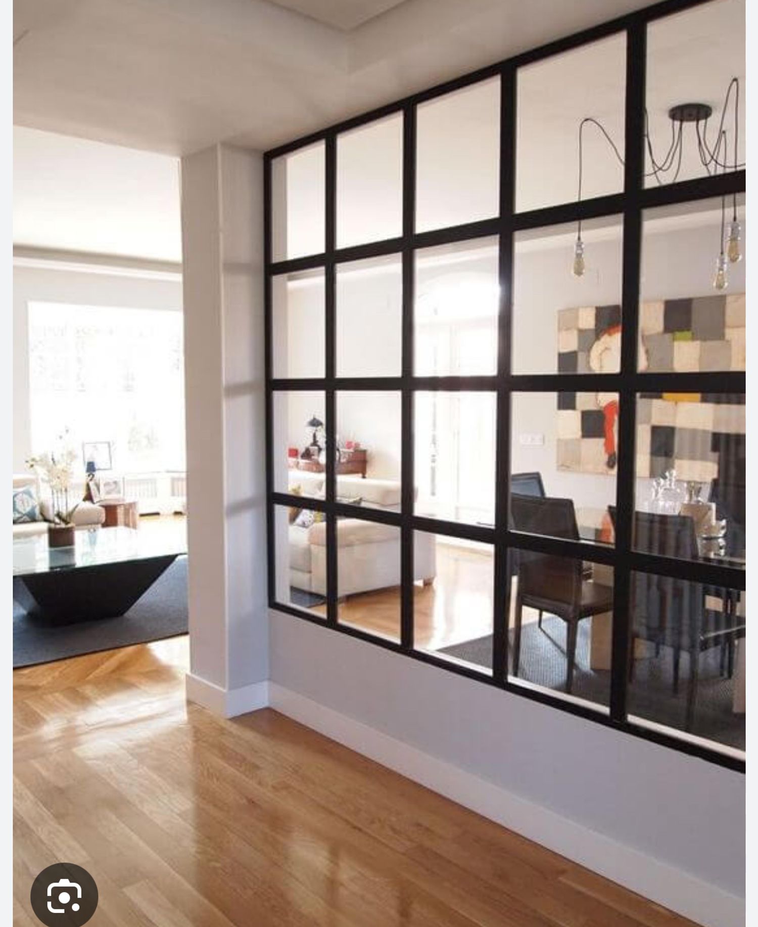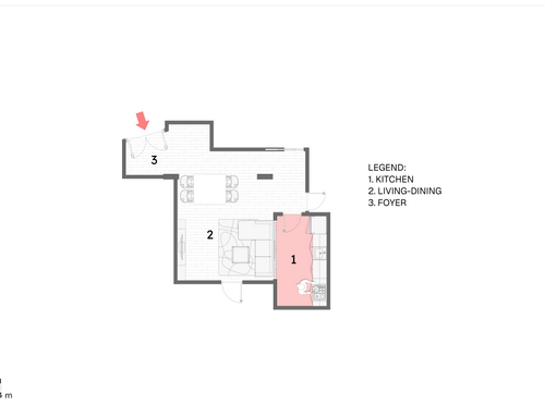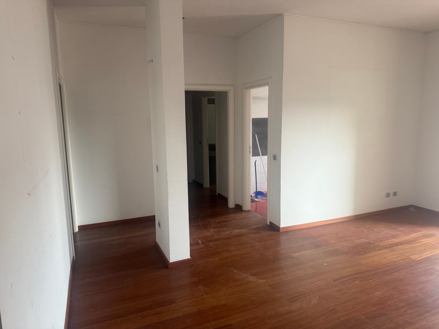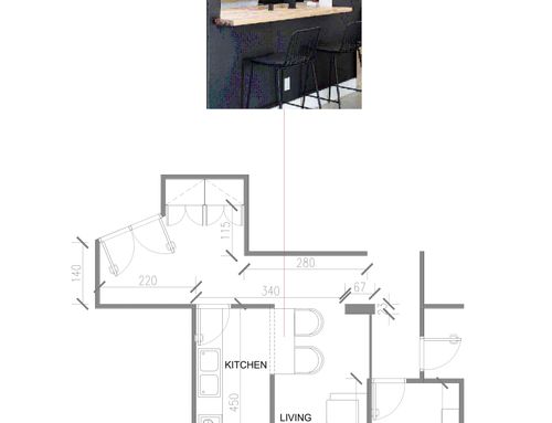 I want to furnish the kitchen and living room by creating permeability between the two spaces without demolishing the entire dividing wall, but rather with an opening, an internal window, or a glass partition in the wall, so that the flooring (red resin in the kitchen and wood in the living room) can remain different.