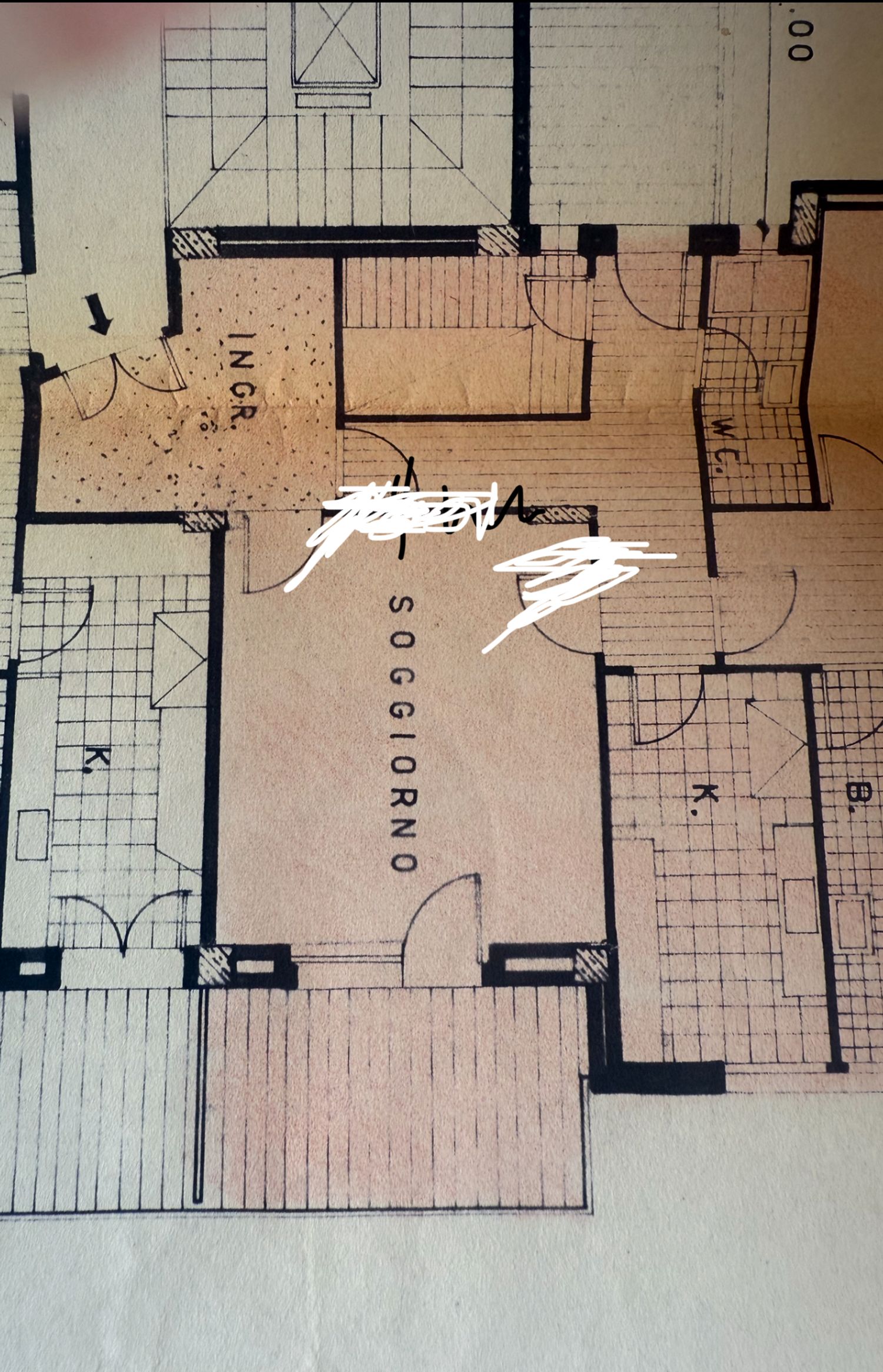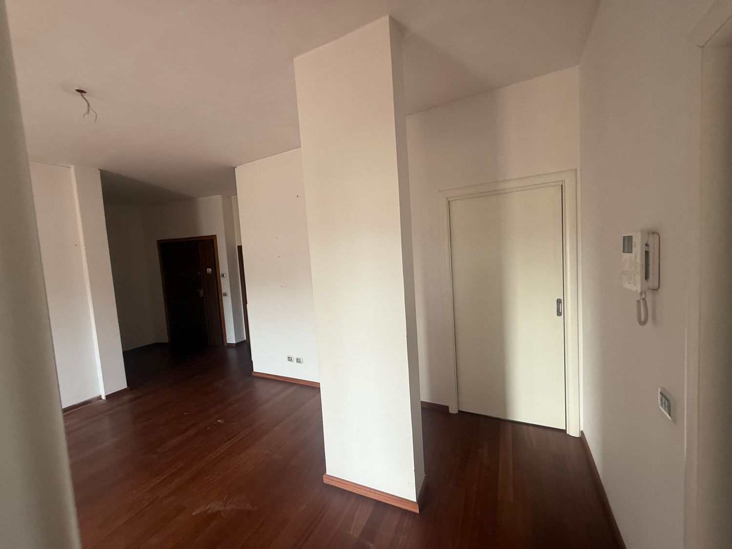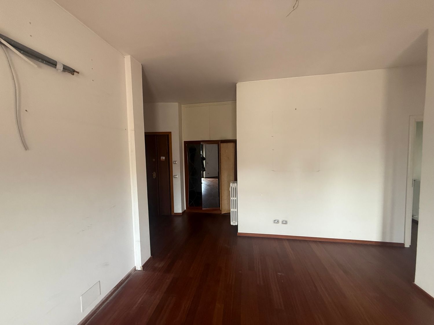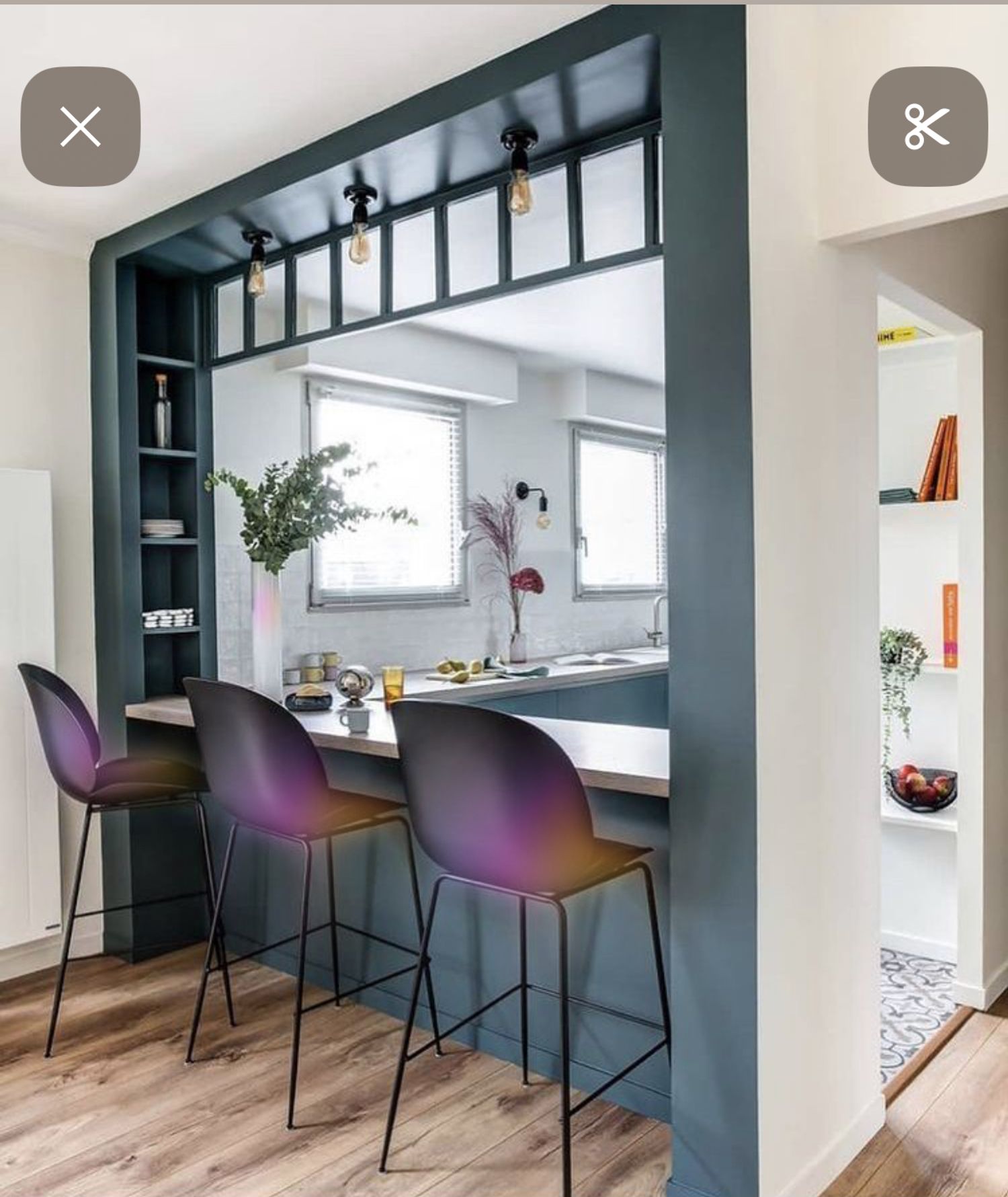 I want to furnish the kitchen and living room by creating permeability between the two spaces without demolishing the entire dividing wall, but rather with an opening, an internal window, or a glass partition in the wall, so that the flooring (red resin in the kitchen and wood in the living room) can remain different.