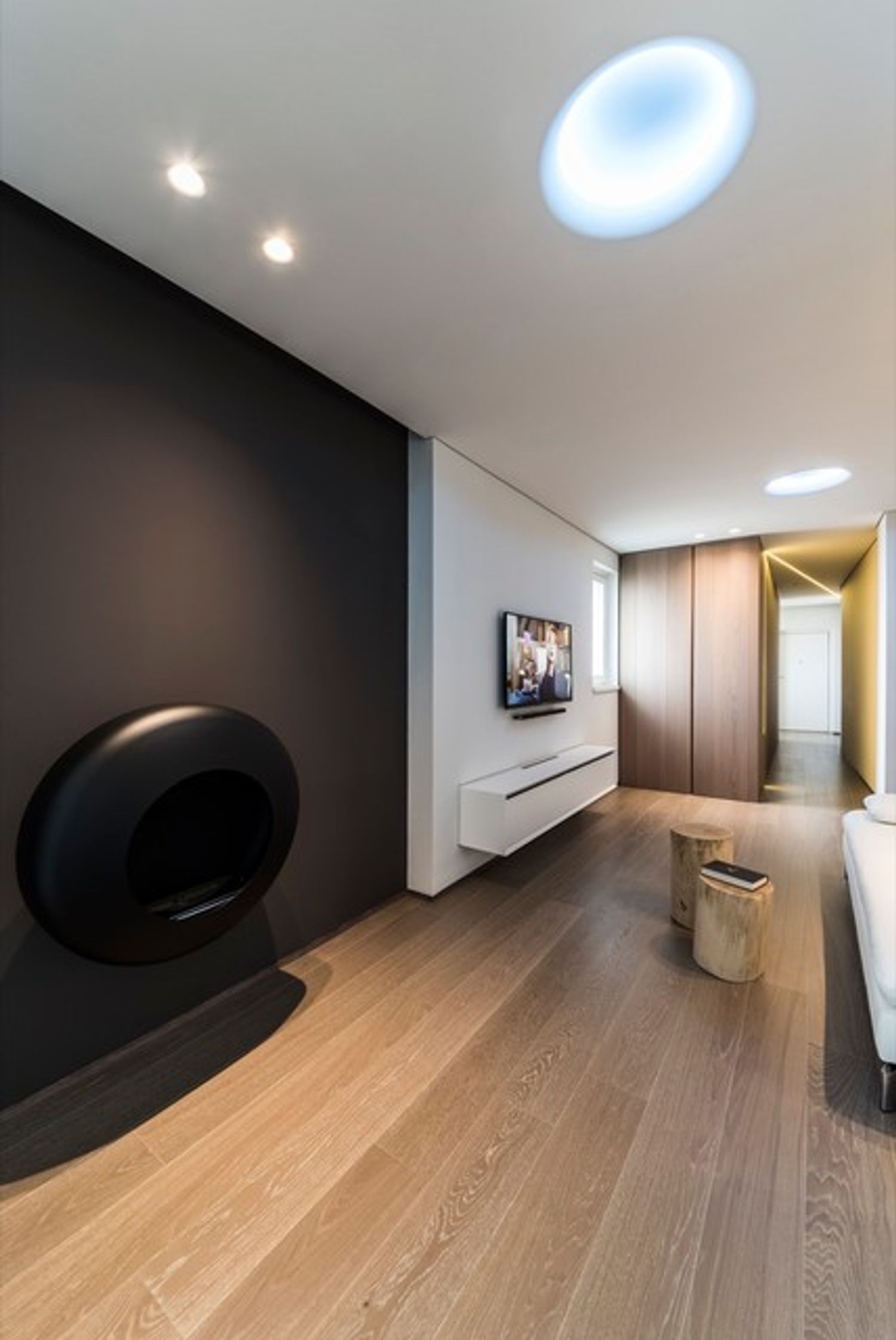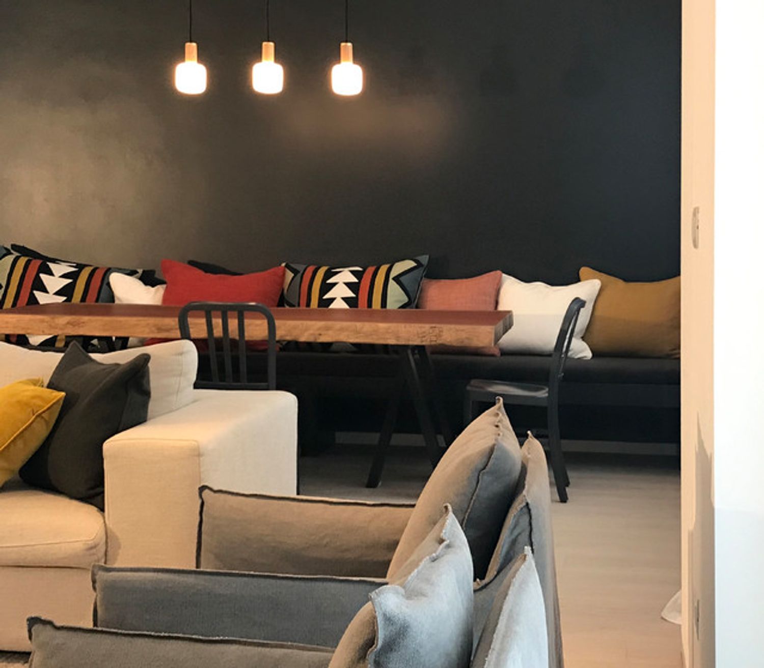 A TV is useful. I wouldn't mind having one wall painted black or at least dark. I like the industrial style, but with designer pieces and striking, colorful solutions. I'd love for the kitchen to have free-standing furnishings, a sort of freestyle, rather than the usual modular kitchen. However, I don't want any rustic, "arte povera" (poor art) or shabby chic look. Overall, I want a very masculine style with industrial accents, pops of color, plenty of design, and high-tech touches. A "country house" effect is absolutely to be avoided, both in the living area and the kitchen.