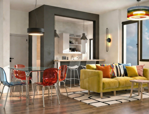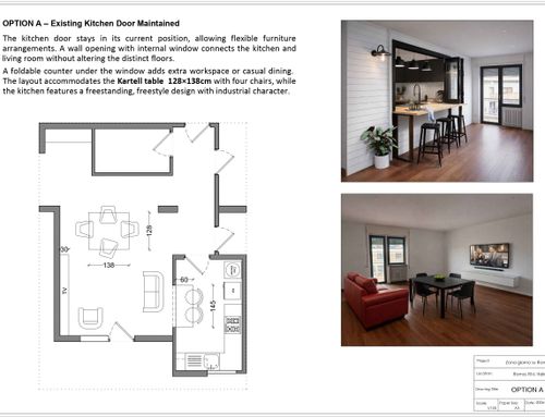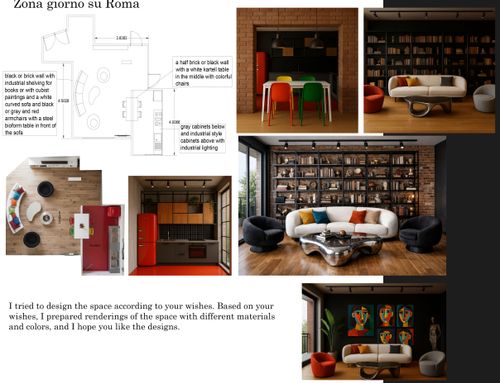 Voglio arredare cucina e soggiorno creando permeabilità tra gli ambienti senza demolire tramezzo intero ma con apertura o finestra interna o vetrata nella parete così i pavimenti (resina rossa in cucina e legno in soggiorno) possono restare diversi. Cerco originalità nel collegamento tra i due ambienti con soluzioni di grande effetto. Il collegamento deve avere l'effetto di ampliare la vista tra gli ambienti e di essere piuttosto scenografico. La funzione di "passavivande" è assolutamente trascurabile e non richiesta. Ho già da collocare un tavolo quadrato nero "Four" di Kartel 128x128 con 4 sedie sempre di Kartel. Vorrei anche utilizzare una coppia di poltrone Chesterfield anni 60 rosse bordeaux. Il resto dell'arredo vorrei fosse di design con still misti industrial e moderno. Libera fantasia per decori anche 3D sulle pareti così come per ingresso e cucina nella quale mi piacerebbe frigorifero vintage magari rosso. La finestra della cucina è scorrevole quindi la sua apertura non costituisce ingombro verso l'interno. Utile presenza tv. Non disdegnerei che una parete fosse dipinta di nero o comunque di scuro. Mi piace lo stile industrial ma con pezzi di design e soluzioni di effetto e colorato. La cucina non mi dispiacerebbe che fosse con arredi liberi una sorta di free style e non la solita cucine componibile. Tuttavia non voglio nessun effetto rustico o in stile "arte povera" o tantomeno in stile shabby. Voglio nel complesso uno stile molto maschile con richiami industrial, note di colore, tanto design e richiami high tech. Da evitare assolutamente l'effetto "casa di campagna" sia nella zona giorno che in cucina.