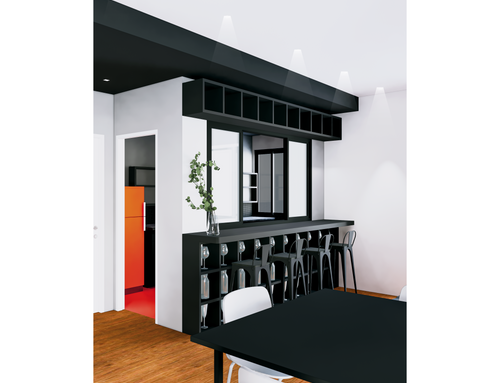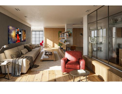 Quiero amueblar la cocina y el salón creando permeabilidad entre los dos ambientes sin demoler todo el tabique, sino con una apertura, una ventana interior o una pared acristalada, de modo que los pavimentos (resina roja en la cocina y madera en el salón) puedan seguir siendo distintos.